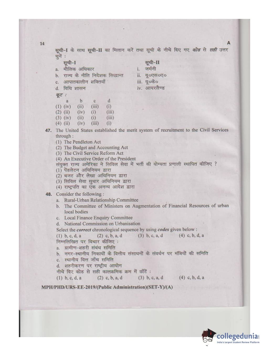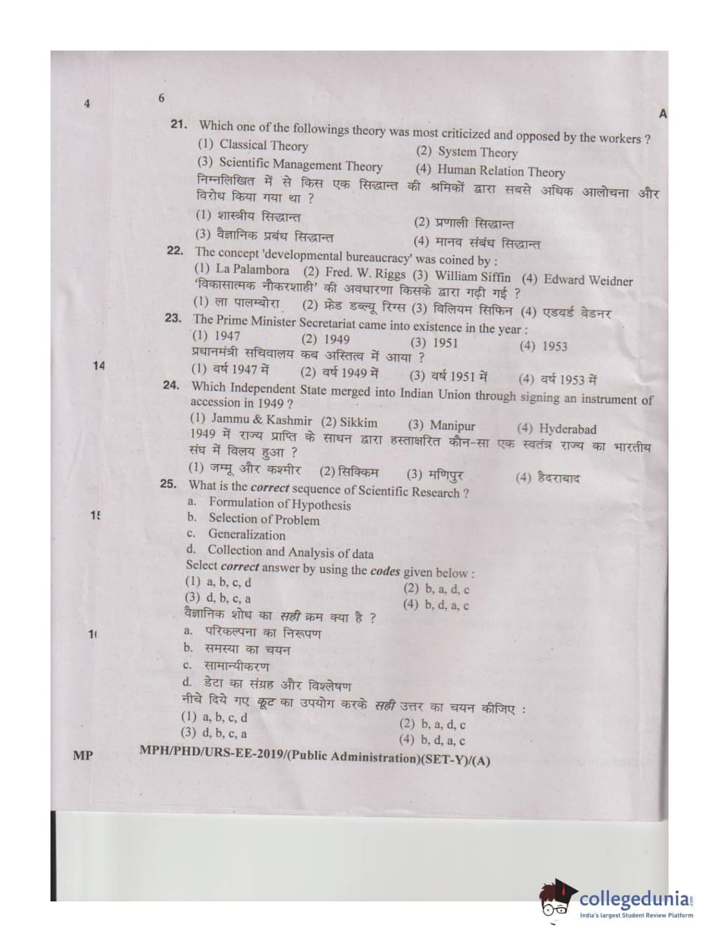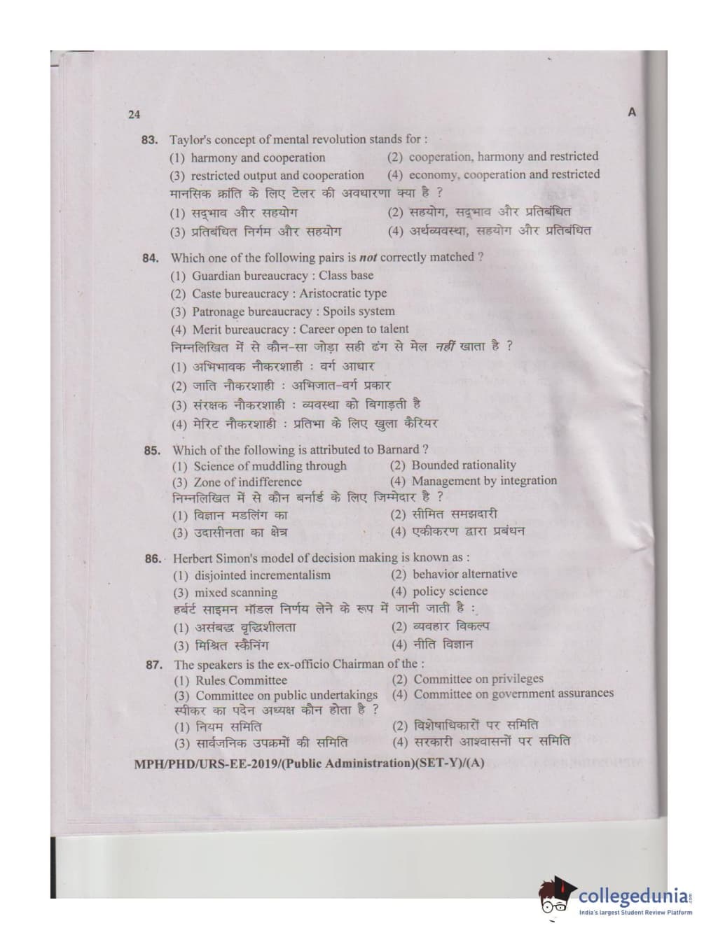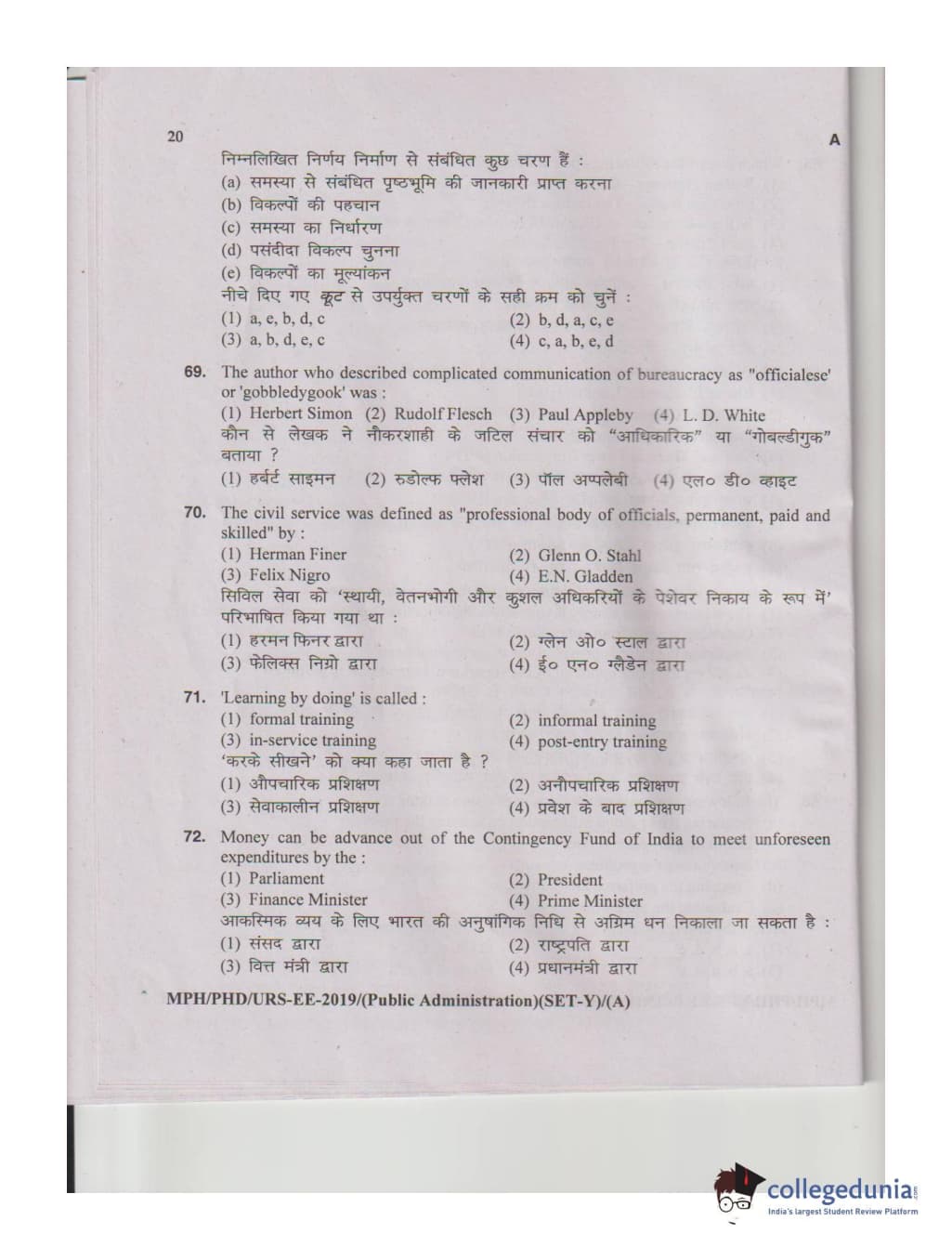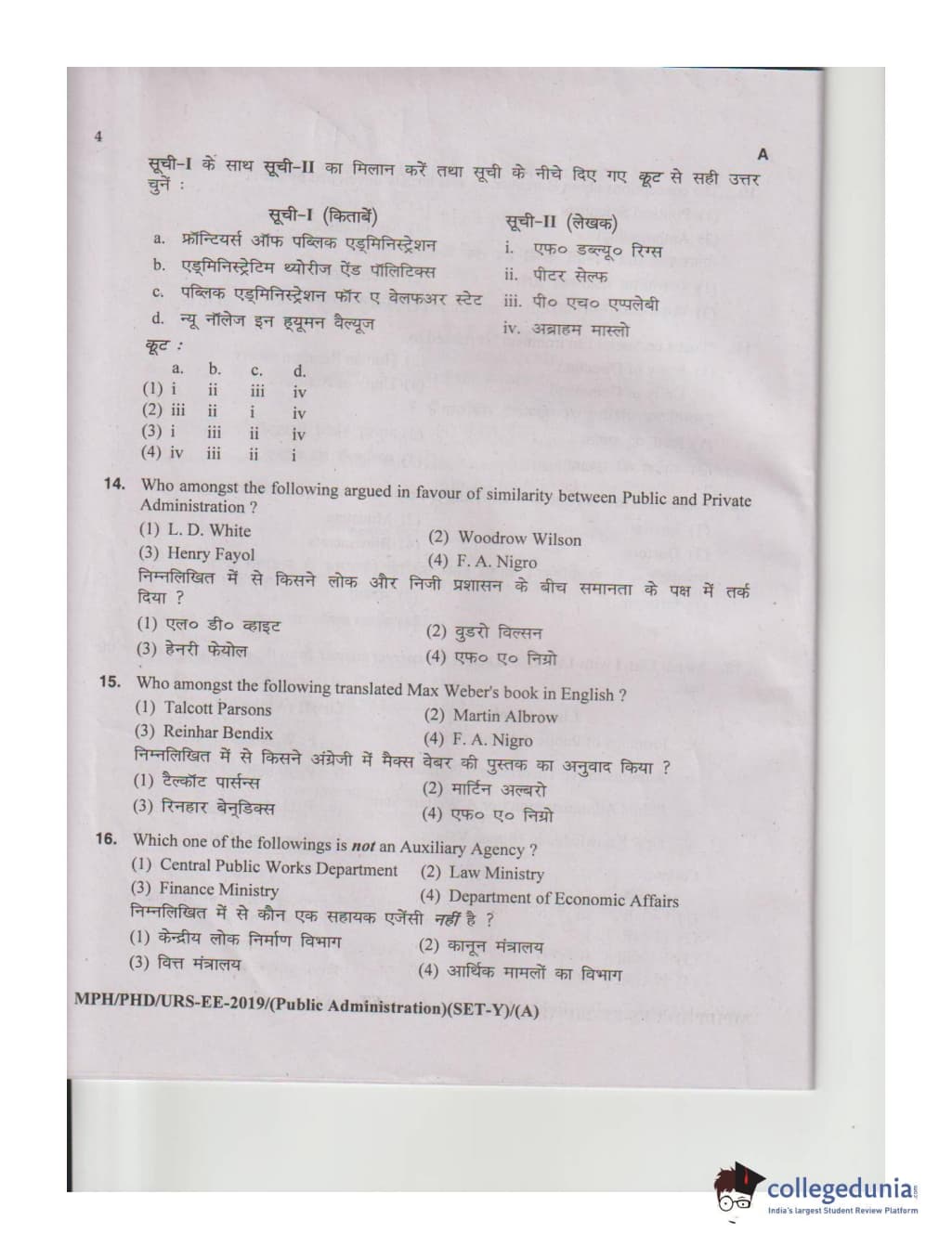 MDUCEE 2019 M.Phil. Public Administration Set A Question Paper with Answer Key PDFs