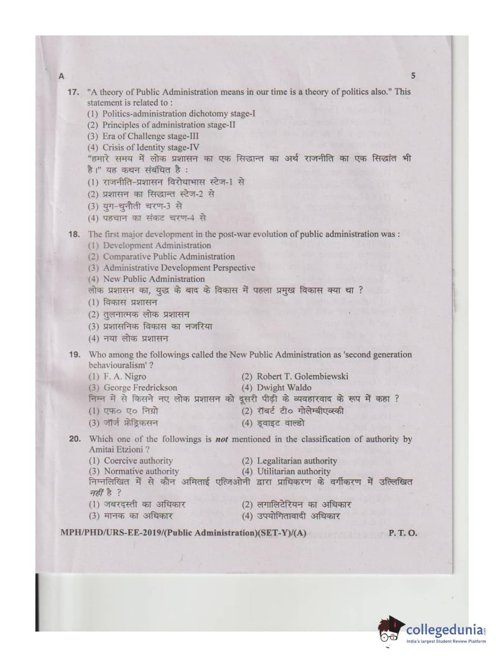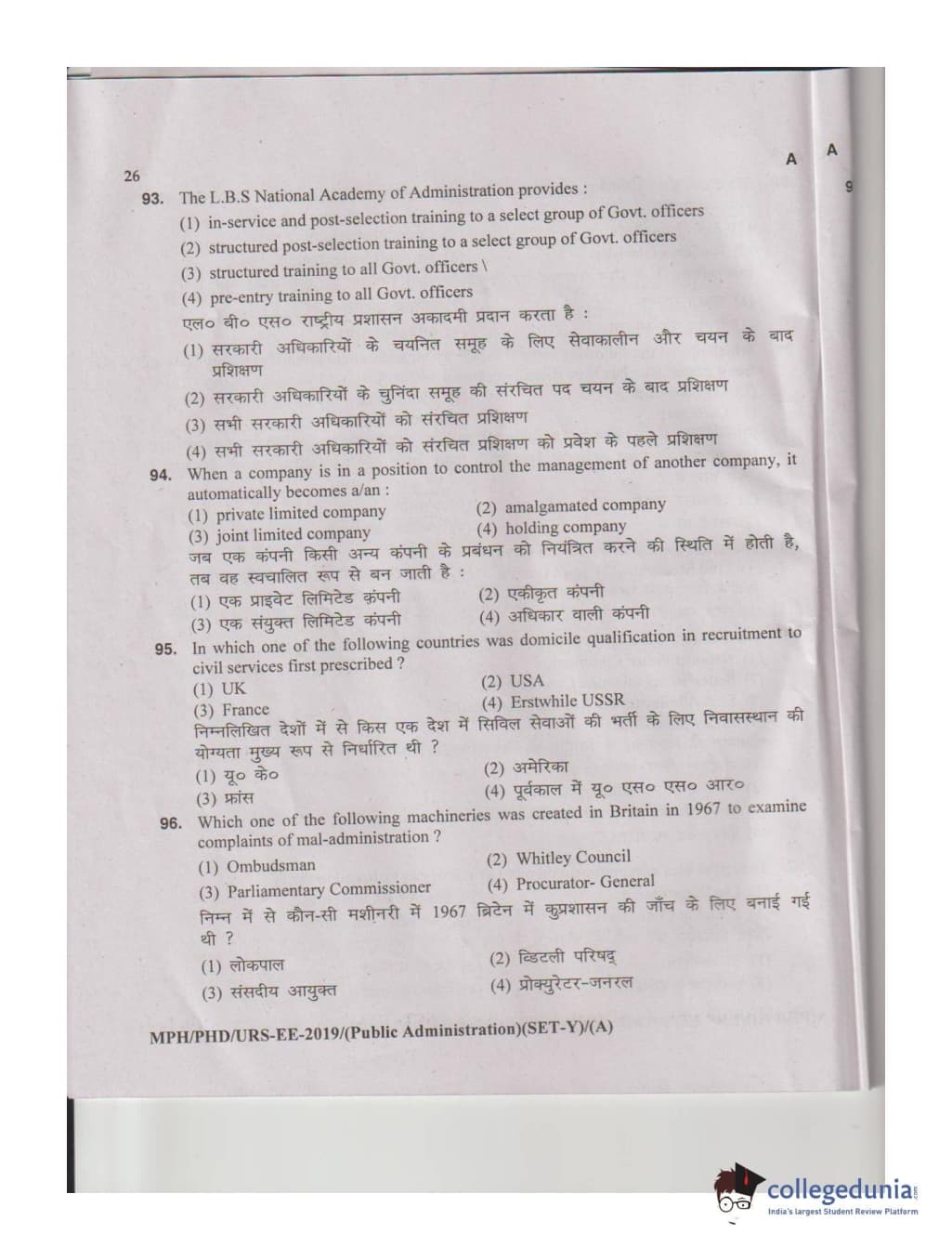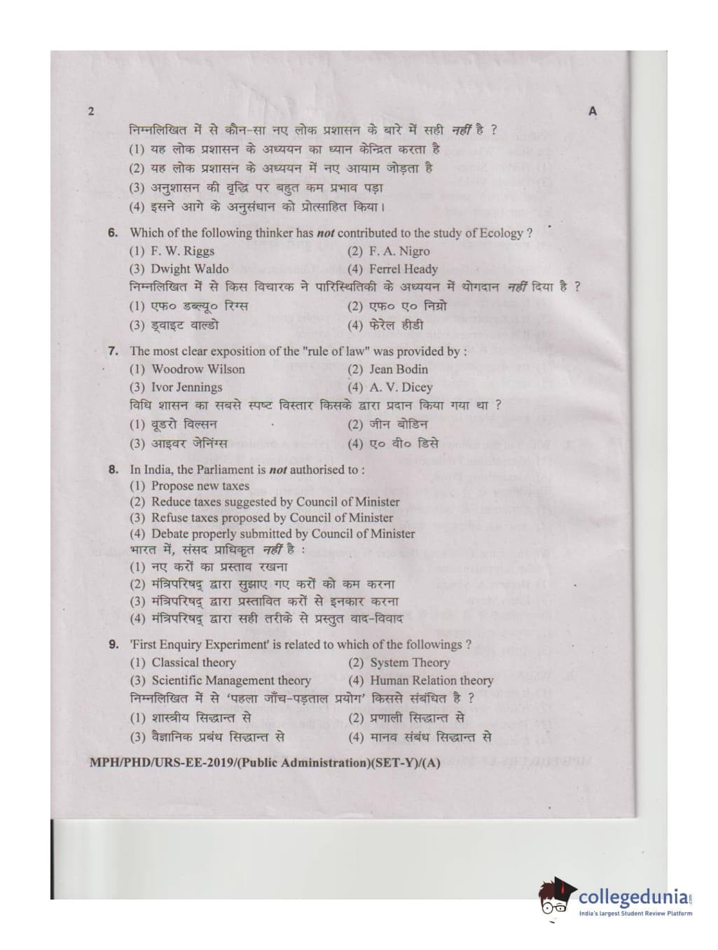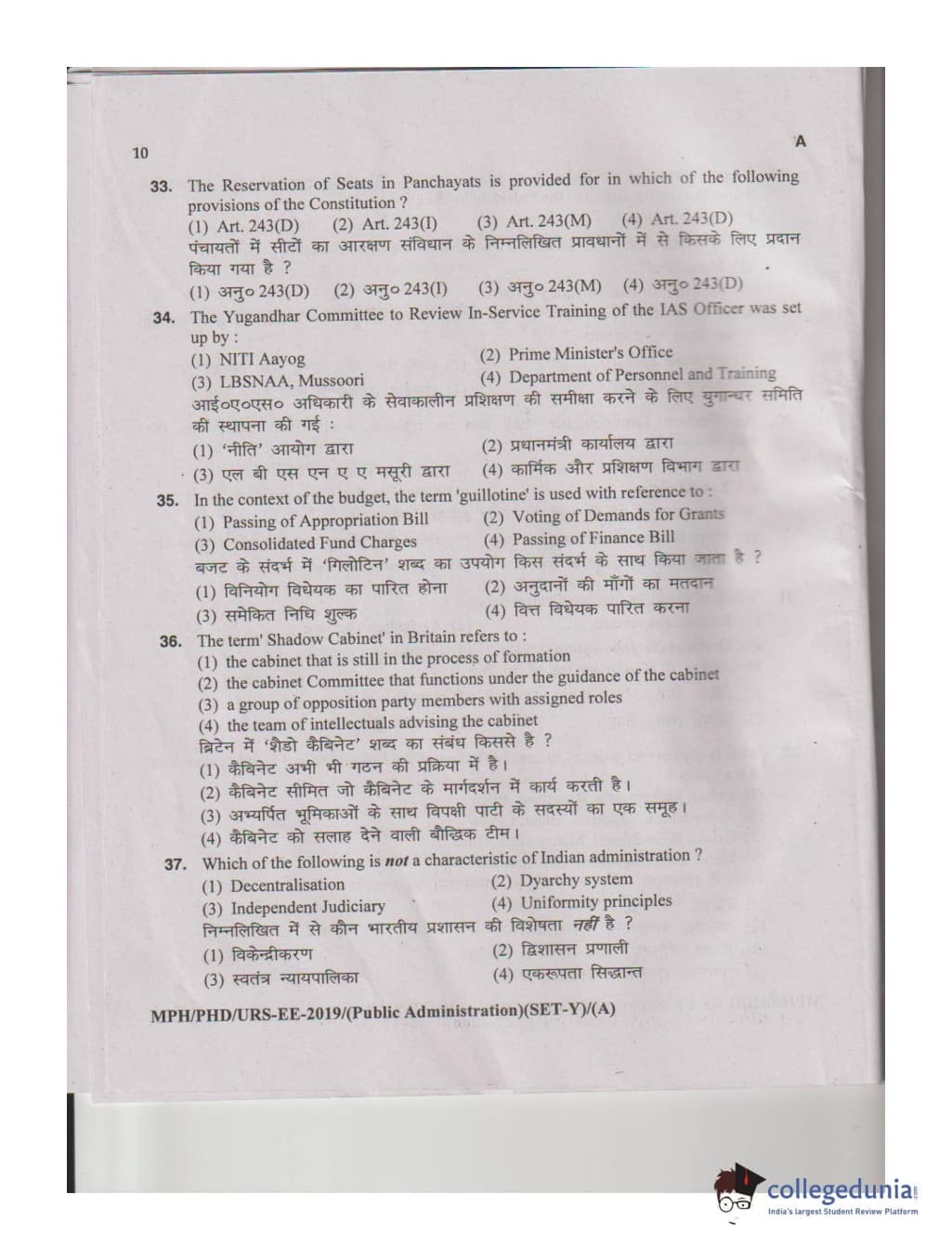MDUCEE 2019 M.Phil. Public Administration Set A Question Paper with Answer Key PDFs