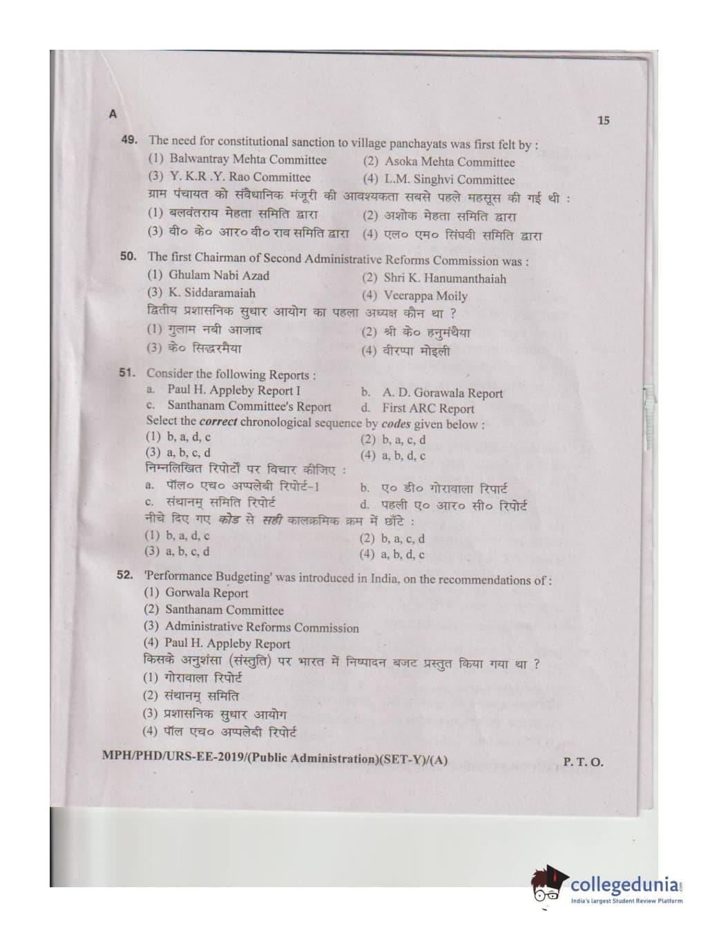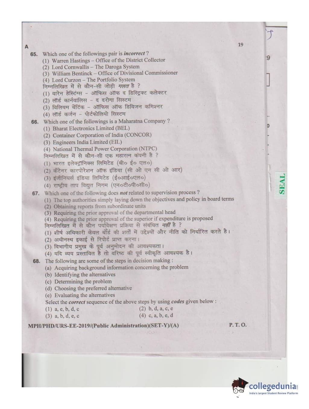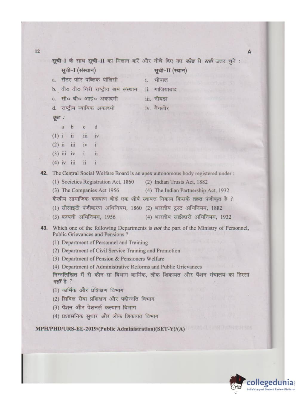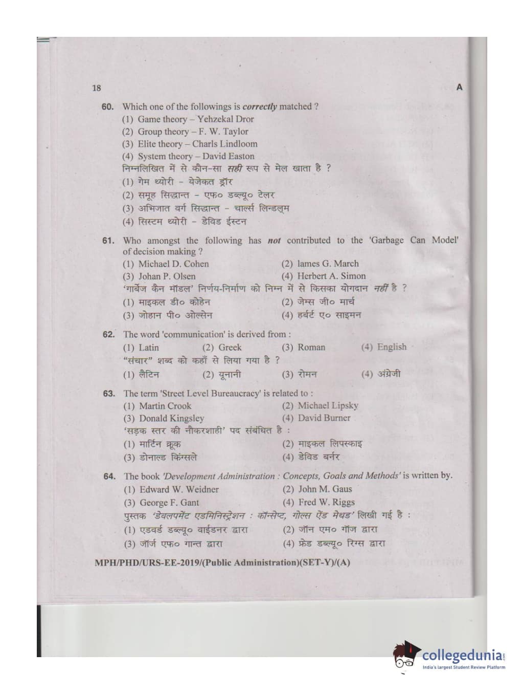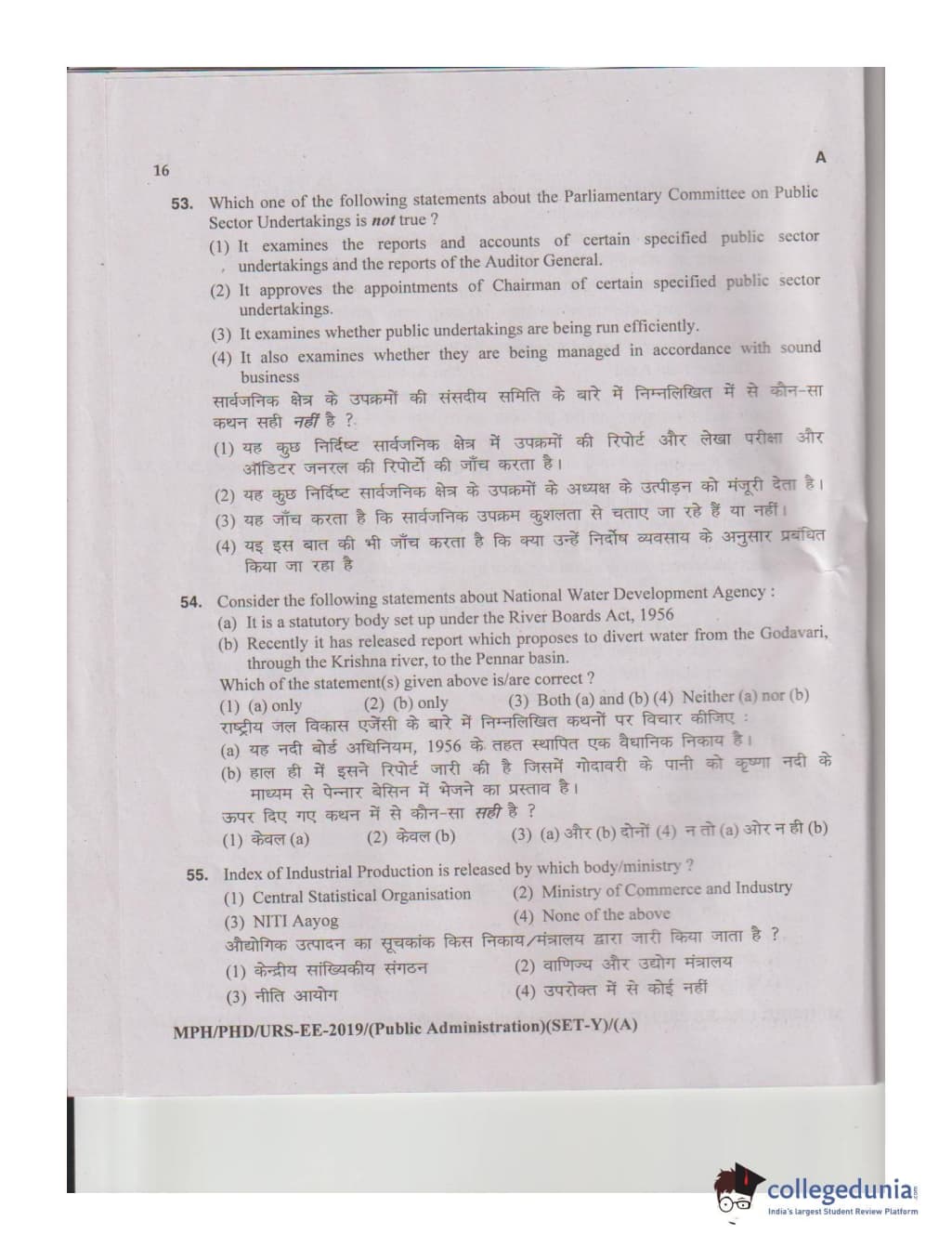 MDUCEE 2019 M.Phil. Public Administration Set A Question Paper with Answer Key PDFs