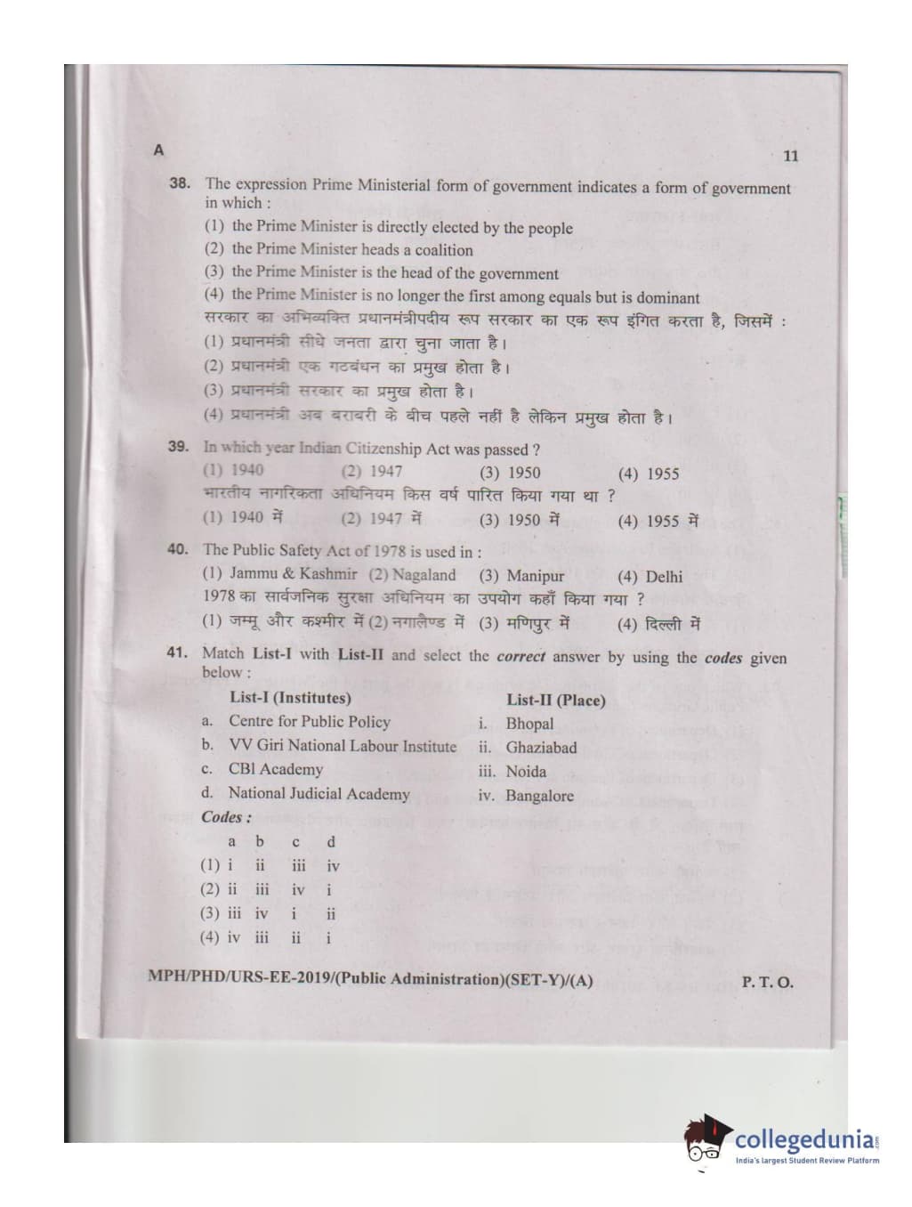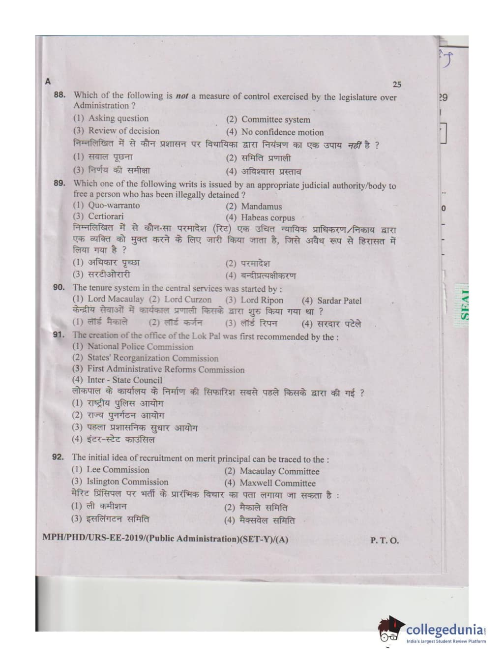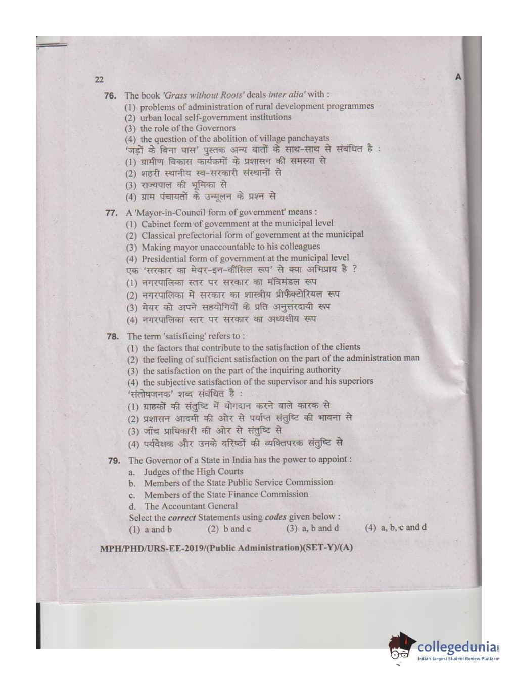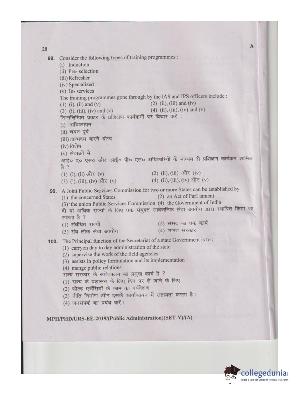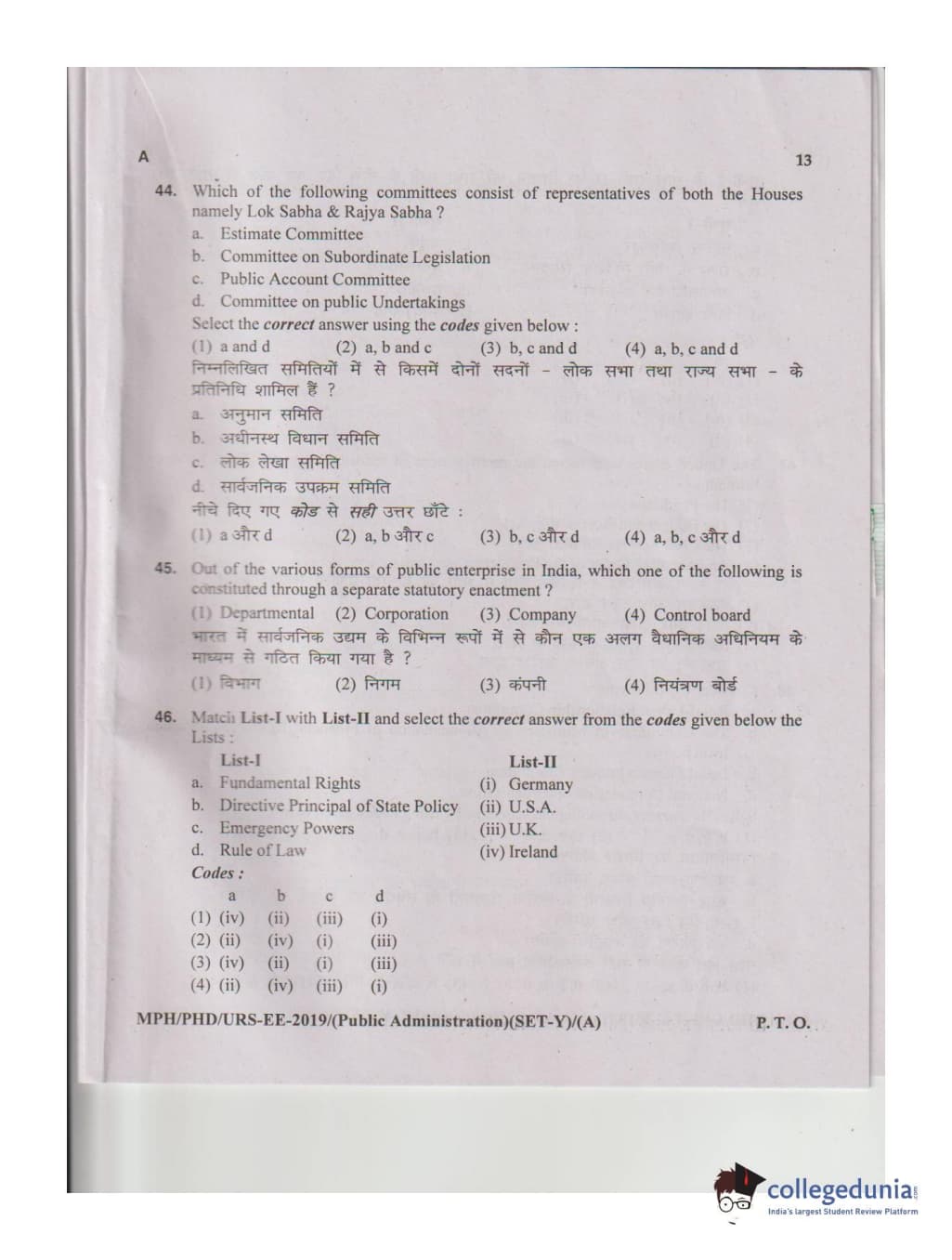 MDUCEE 2019 M.Phil. Public Administration Set A Question Paper with Answer Key PDFs