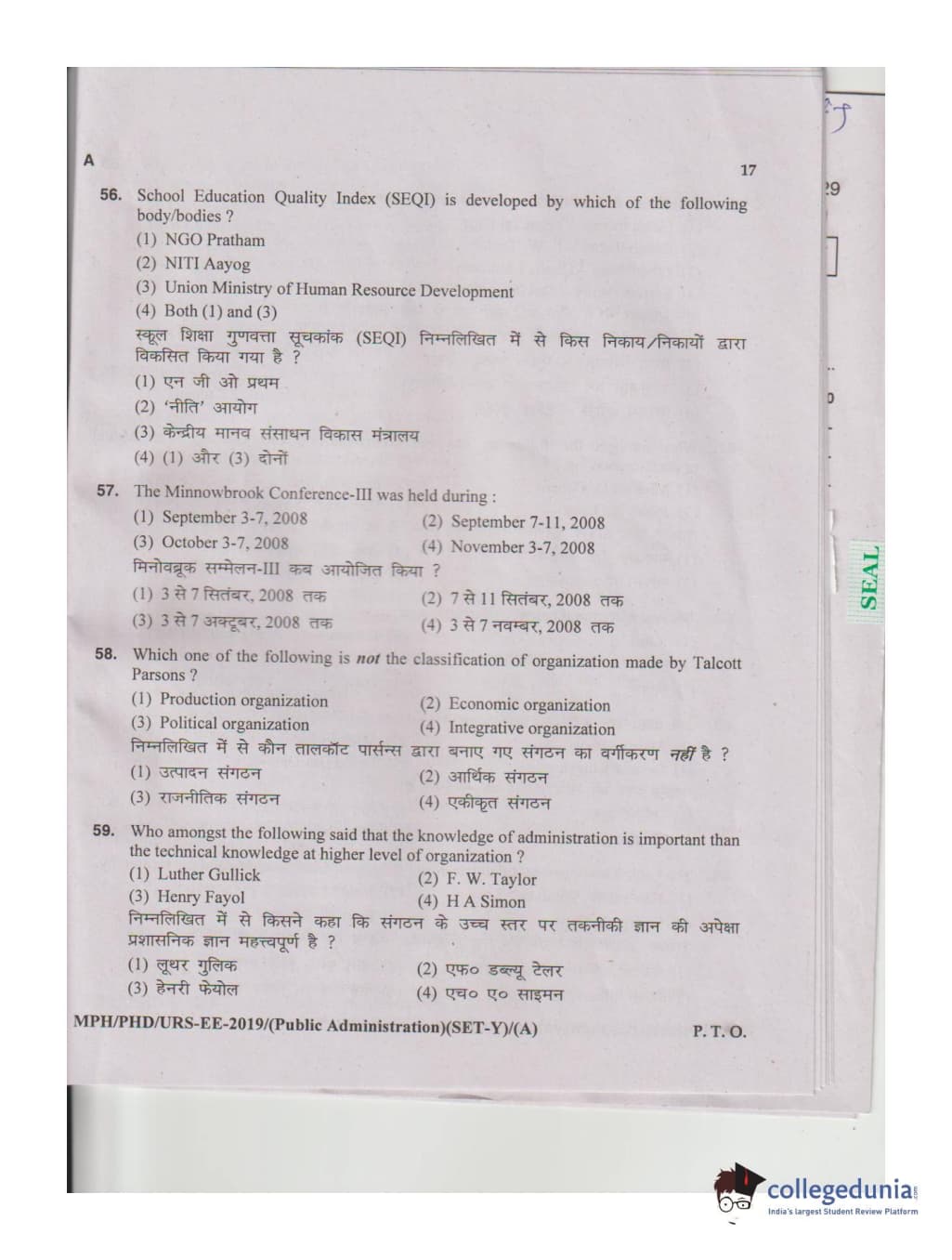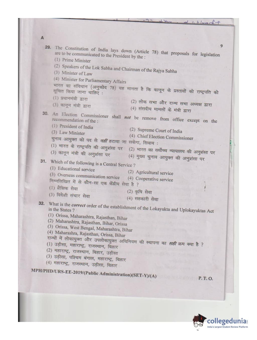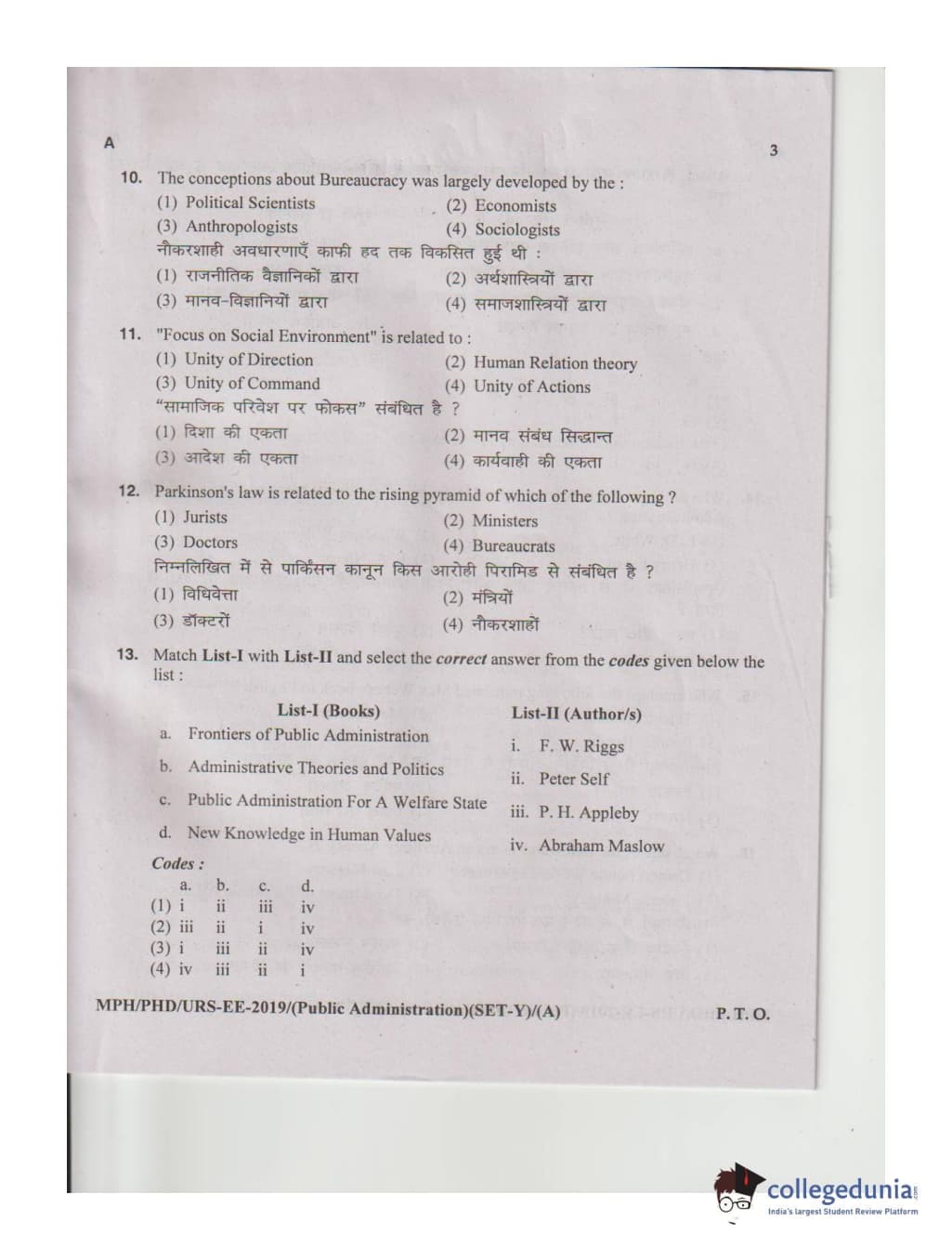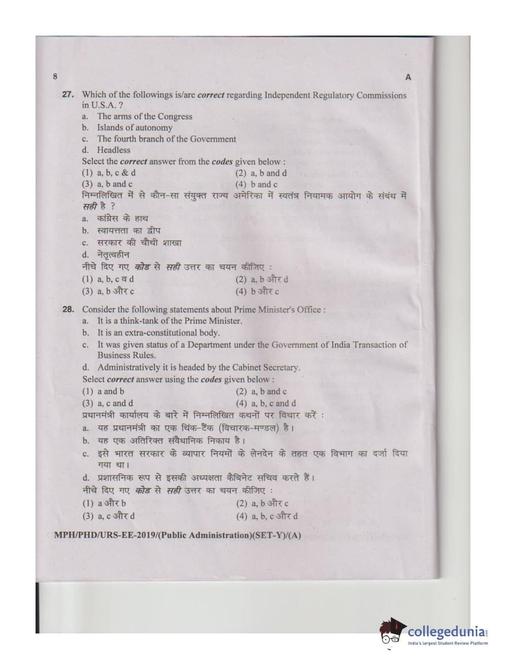 MDUCEE 2019 M.Phil. Public Administration Set A Question Paper with Answer Key PDFs