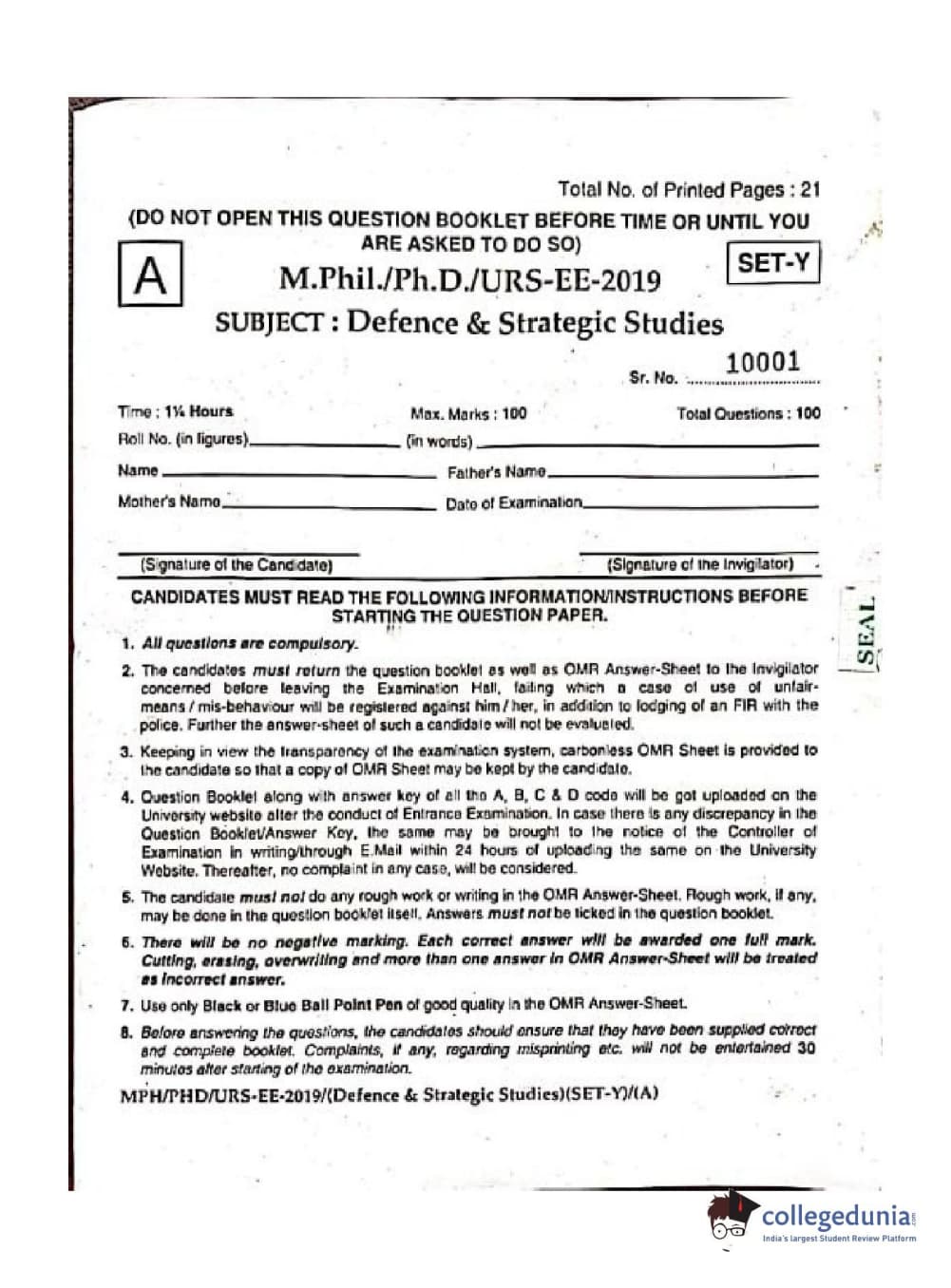 MDUCEE 2019 Ph.D./M.Phil./URS Defence Strategic Studies Set A Question paper with answer key pdf is available for download. The exam was successfully organized by Maharishi Dayanand University. The question paper comprised a total of 100 questions.