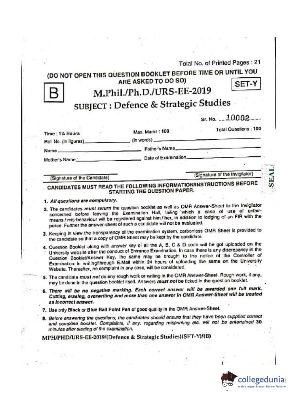 MDUCEE 2019 Ph.D./M.Phil./URS Defence Strategic Studies Set B Question paper with answer key pdf is available for download. The exam was successfully organized by Maharishi Dayanand University. The question paper comprised a total of 100 questions.