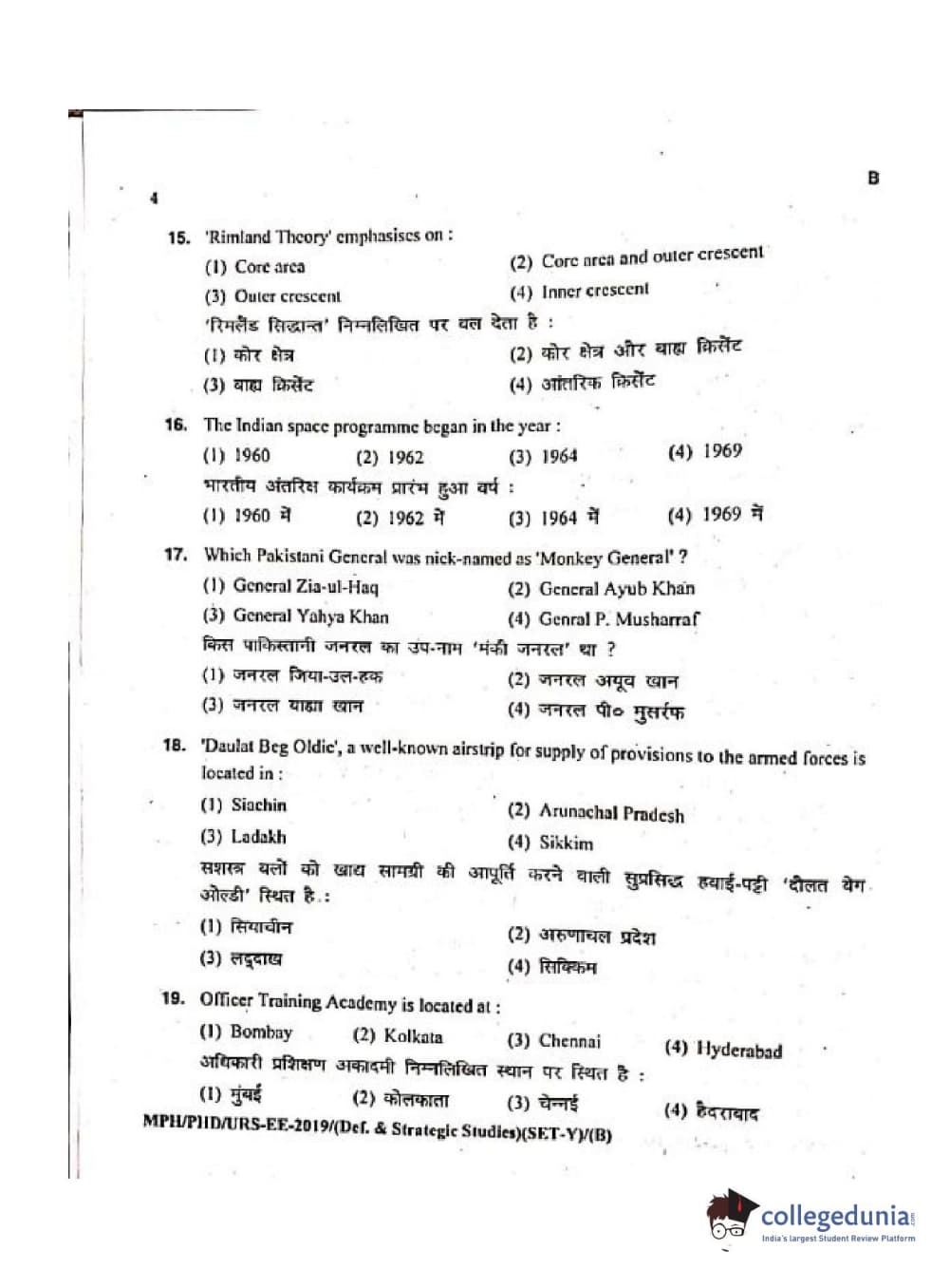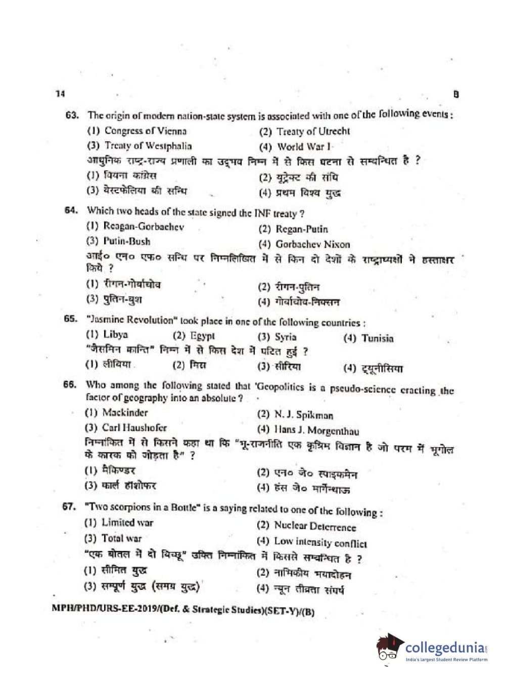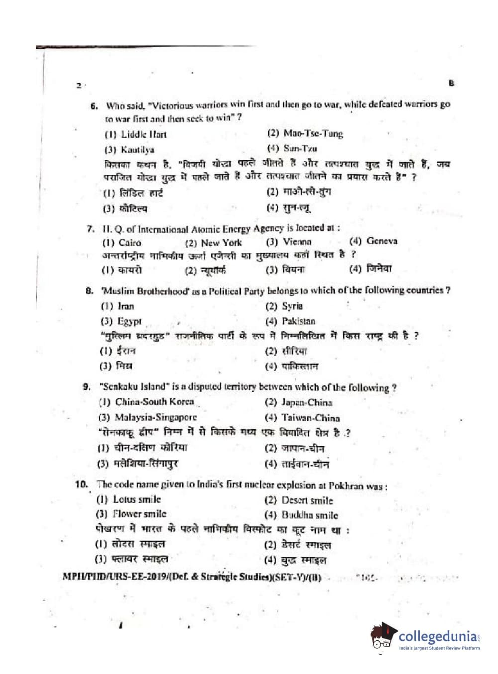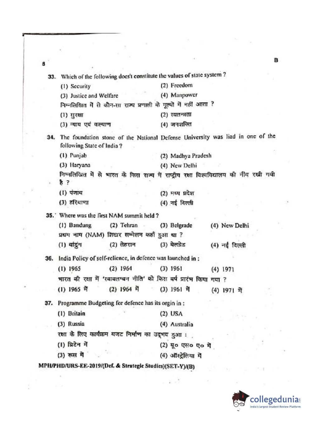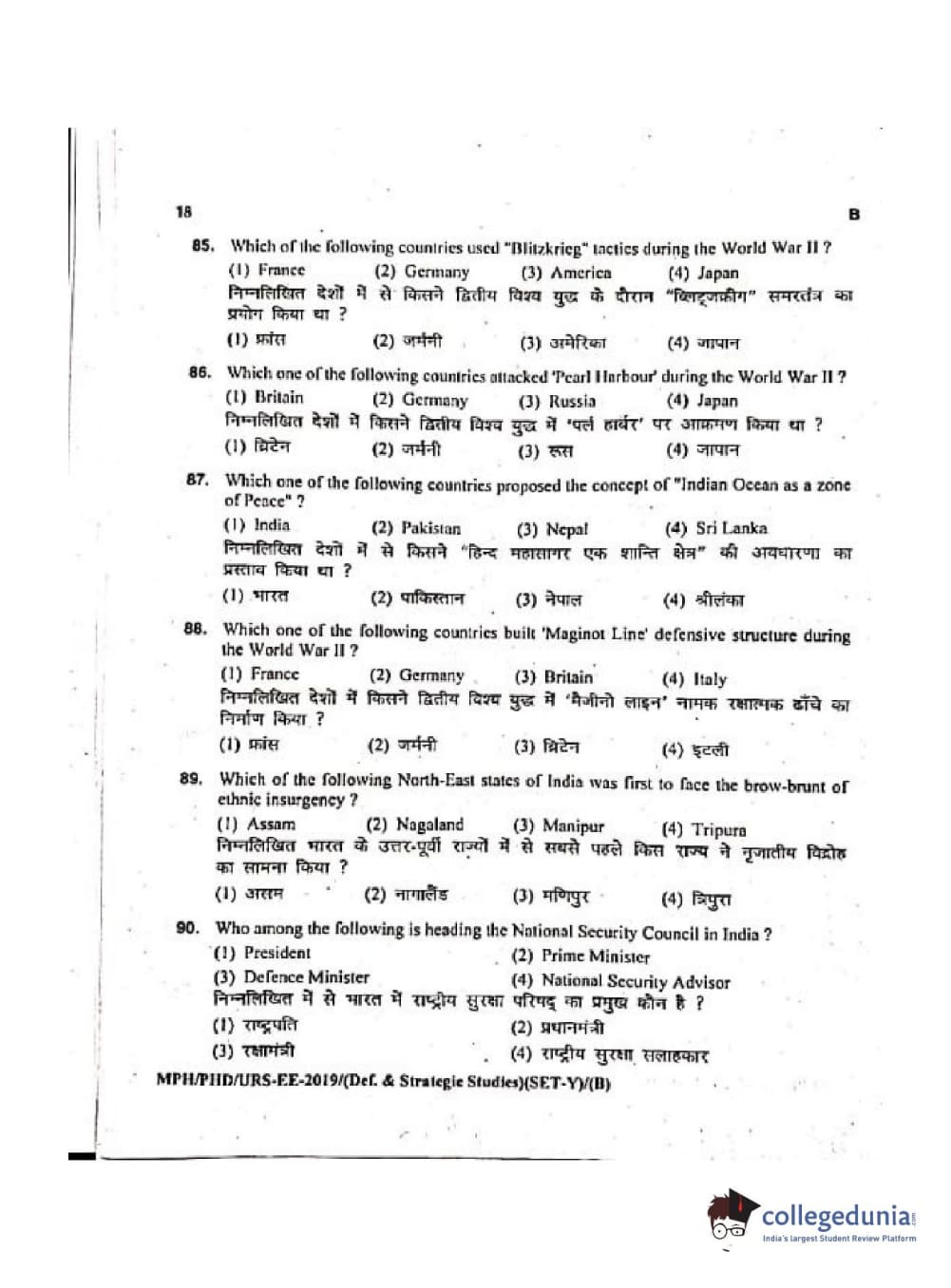 MDUCEE 2019 Ph.D./M.Phil./URS Defence Strategic Studies Set B Question Paper with Answer Key PDFs
