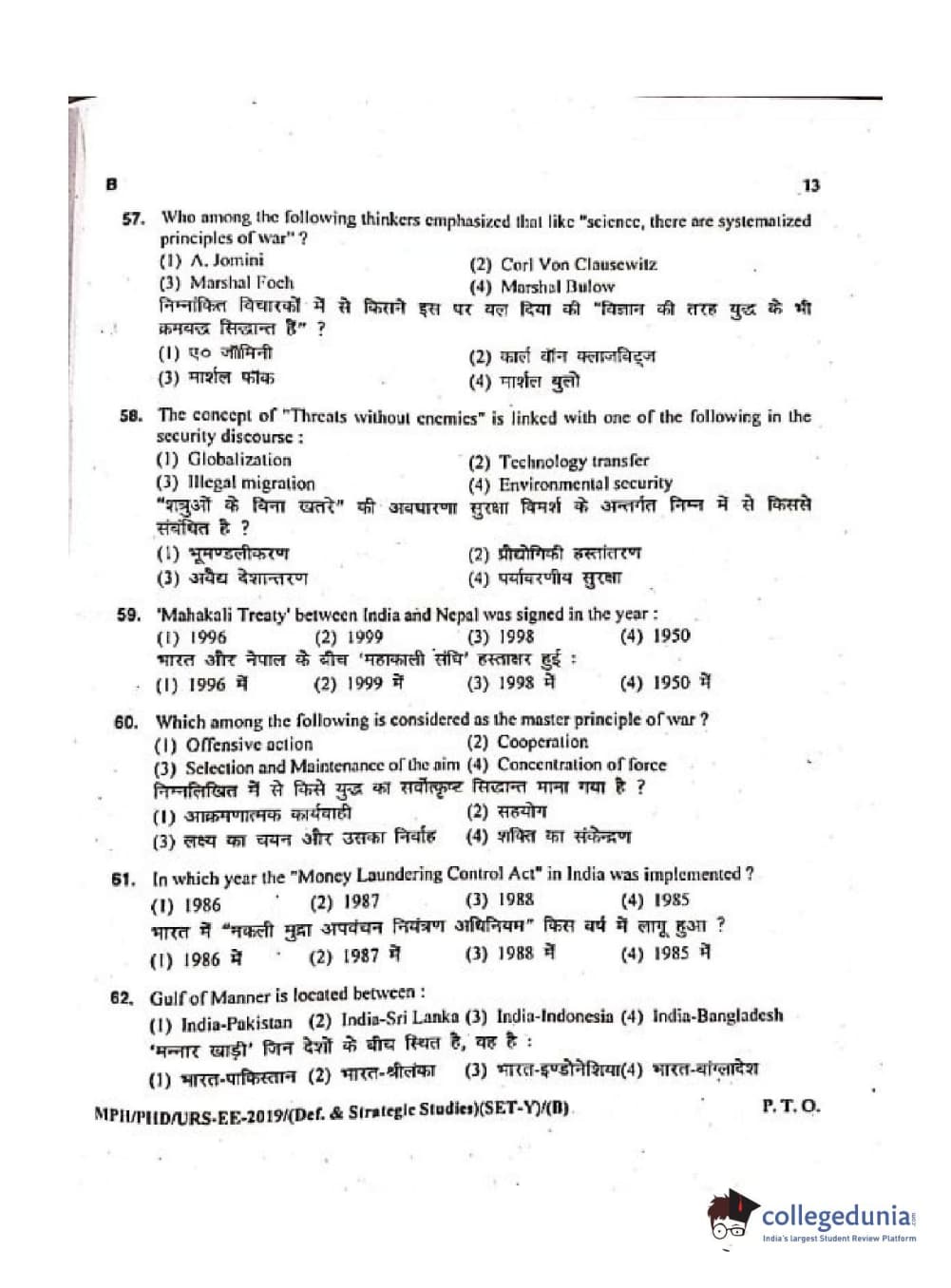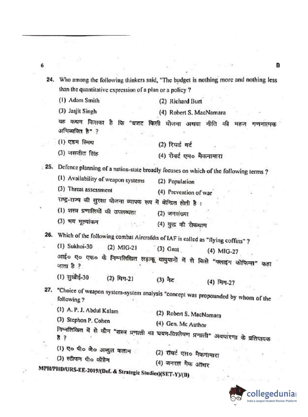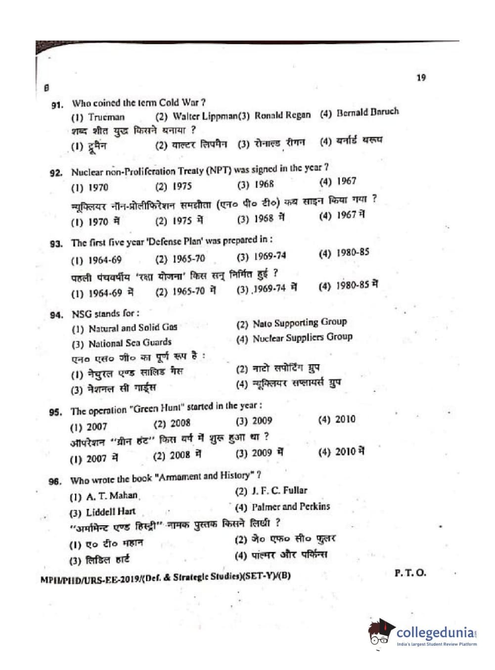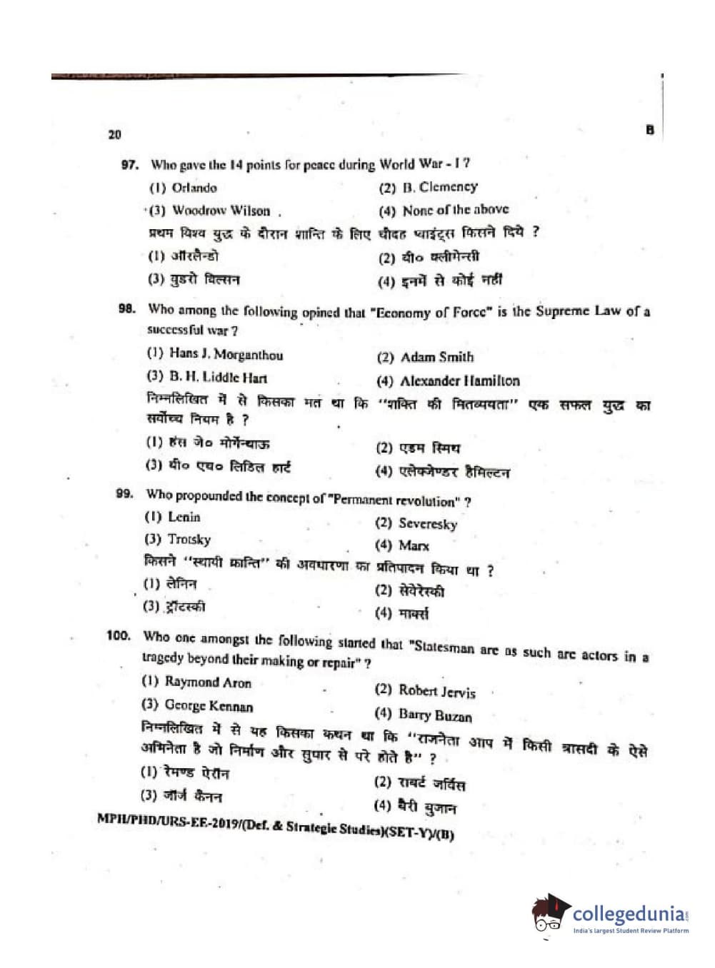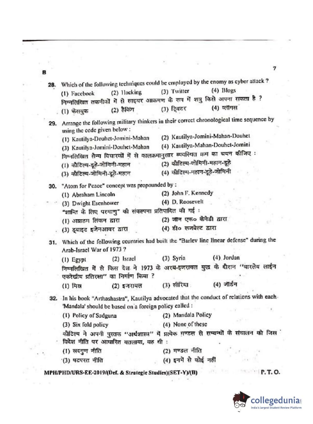 MDUCEE 2019 Ph.D./M.Phil./URS Defence Strategic Studies Set B Question Paper with Answer Key PDFs