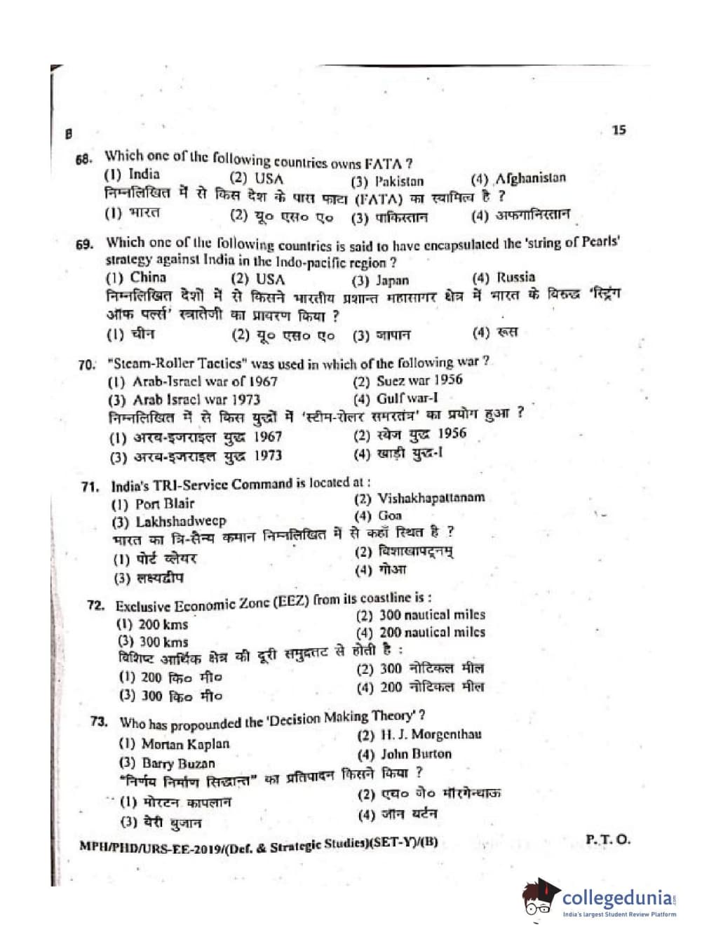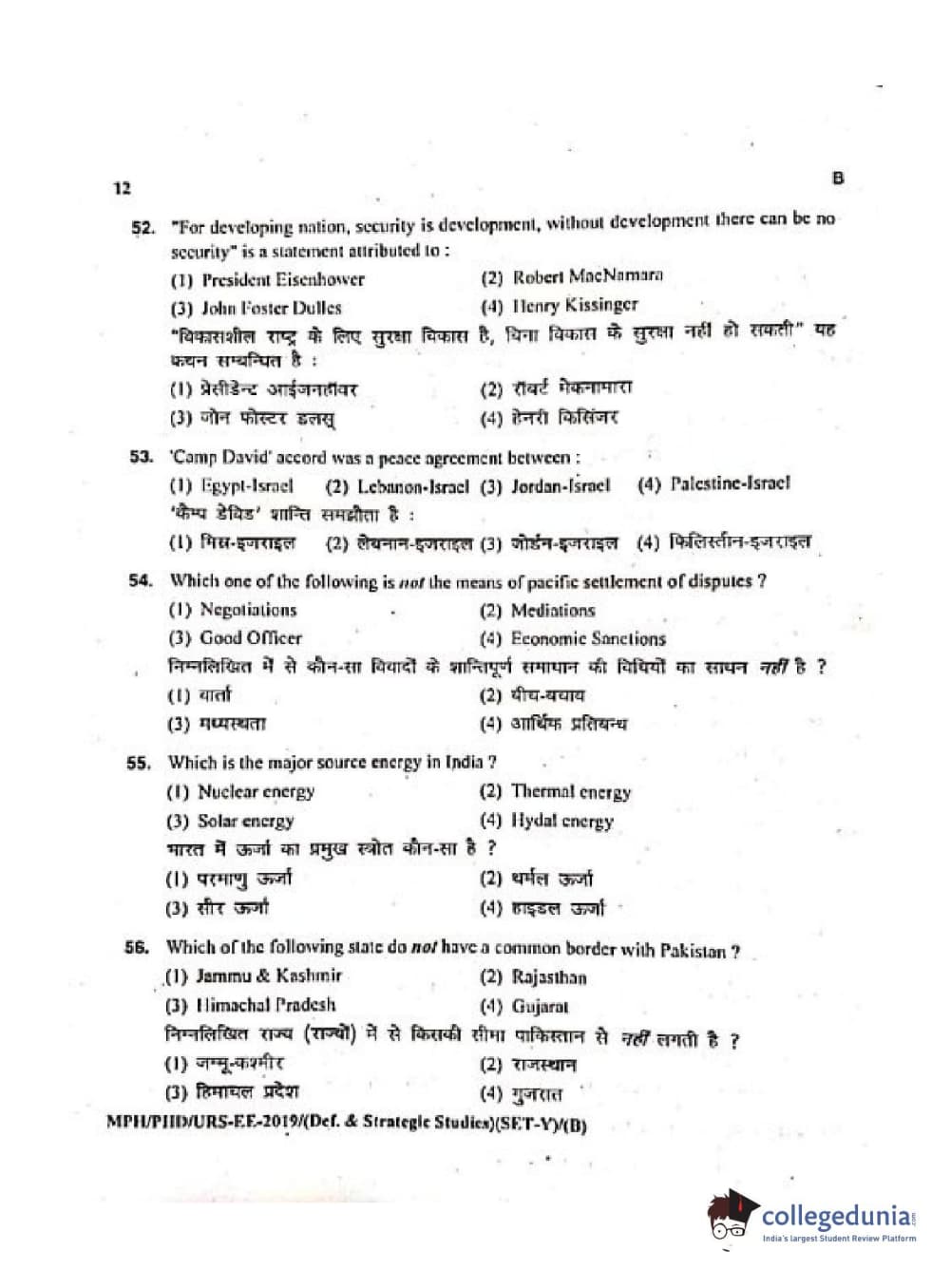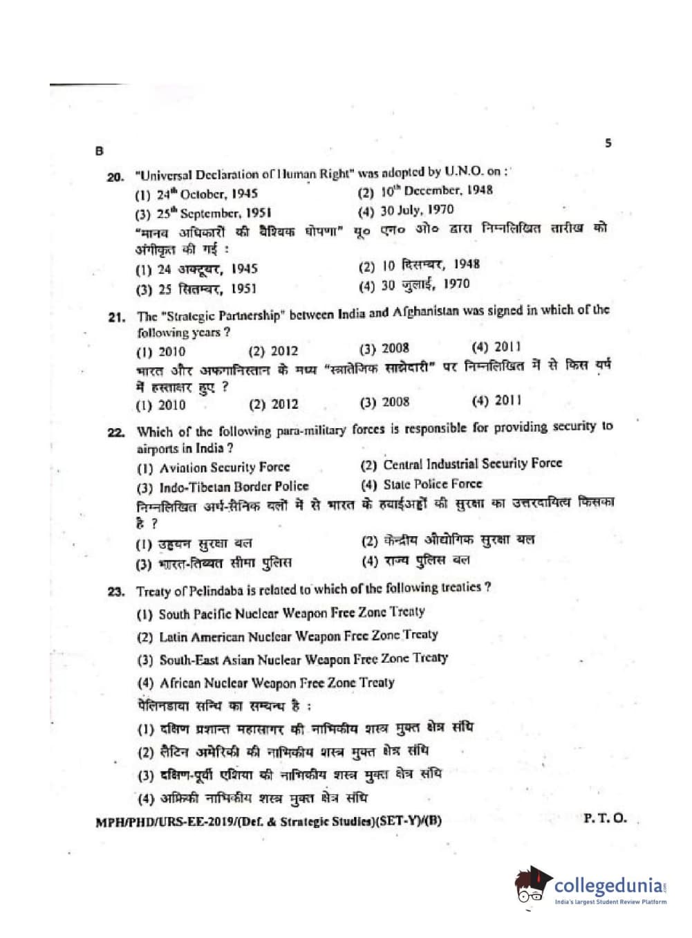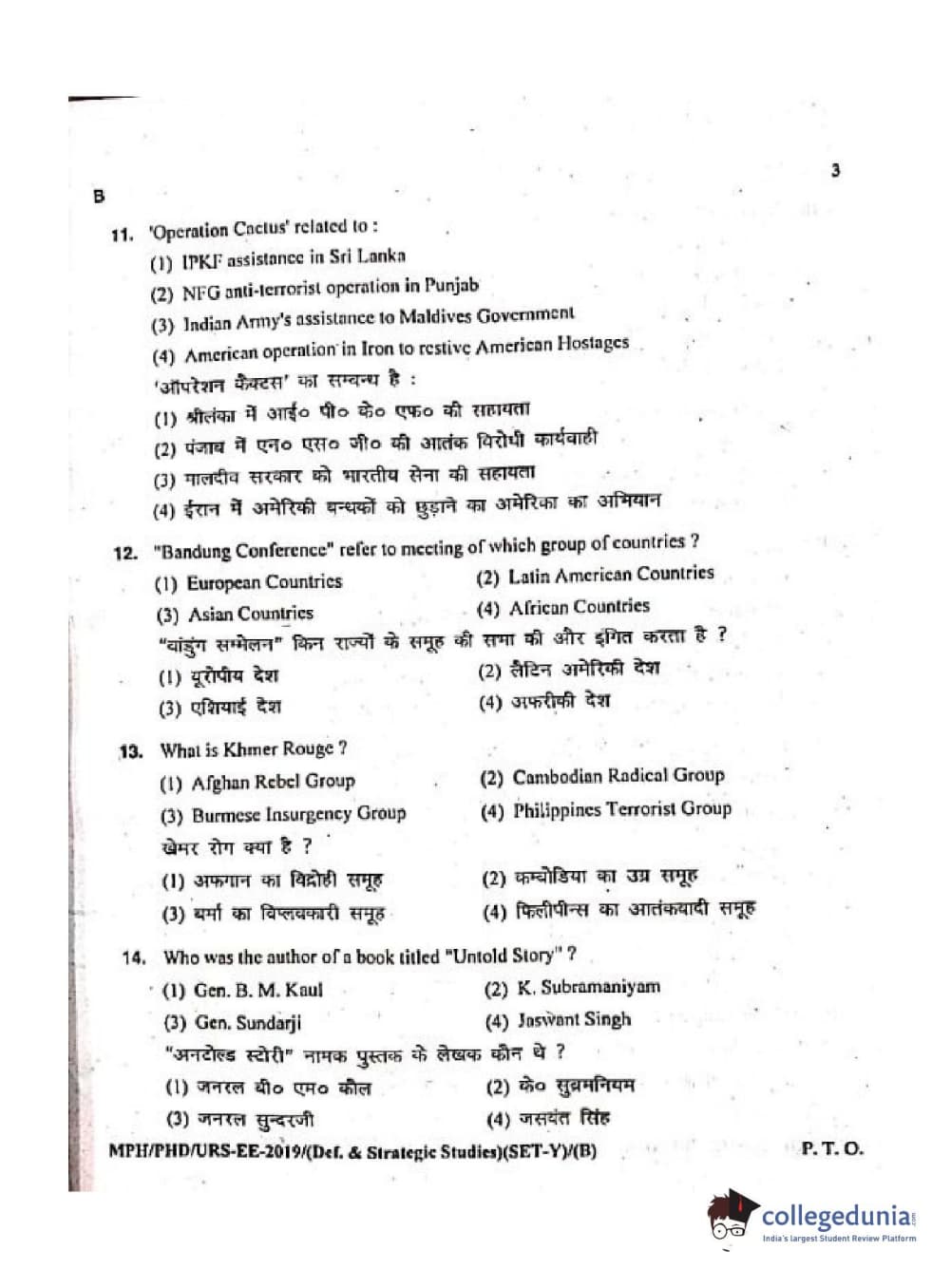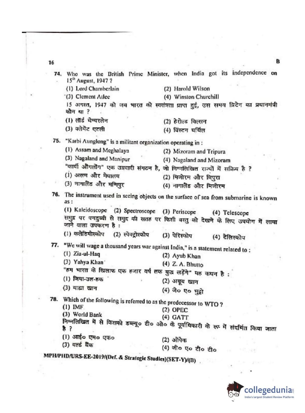 MDUCEE 2019 Ph.D./M.Phil./URS Defence Strategic Studies Set B Question Paper with Answer Key PDFs