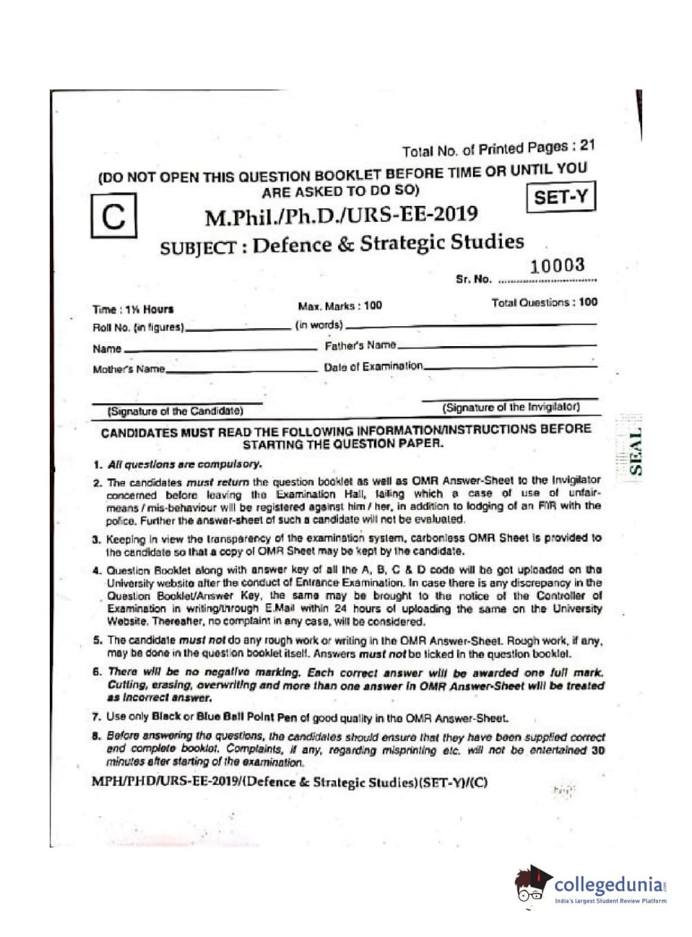 MDUCEE 2019 Ph.D./M.Phil./URS Defence Strategic Studies Set C Question paper with answer key pdf is available for download. The exam was successfully organized by Maharishi Dayanand University. The question paper comprised a total of 100 questions.