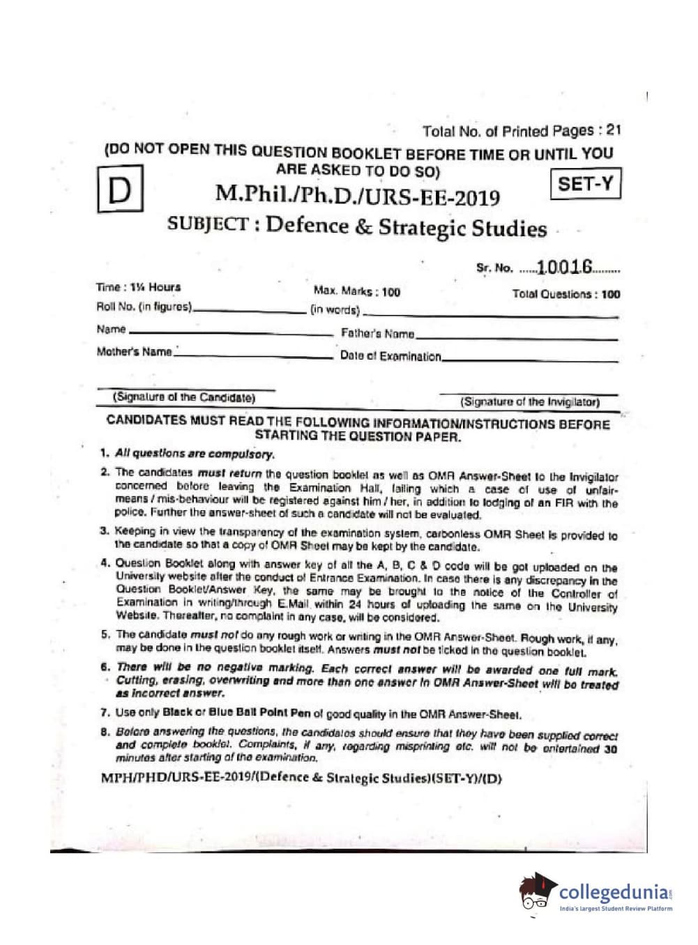 MDUCEE 2019 Ph.D./M.Phil./URS Defence Strategic Studies Set D Question paper with answer key pdf is available for download. The exam was successfully organized by Maharishi Dayanand University. The question paper comprised a total of 100 questions.