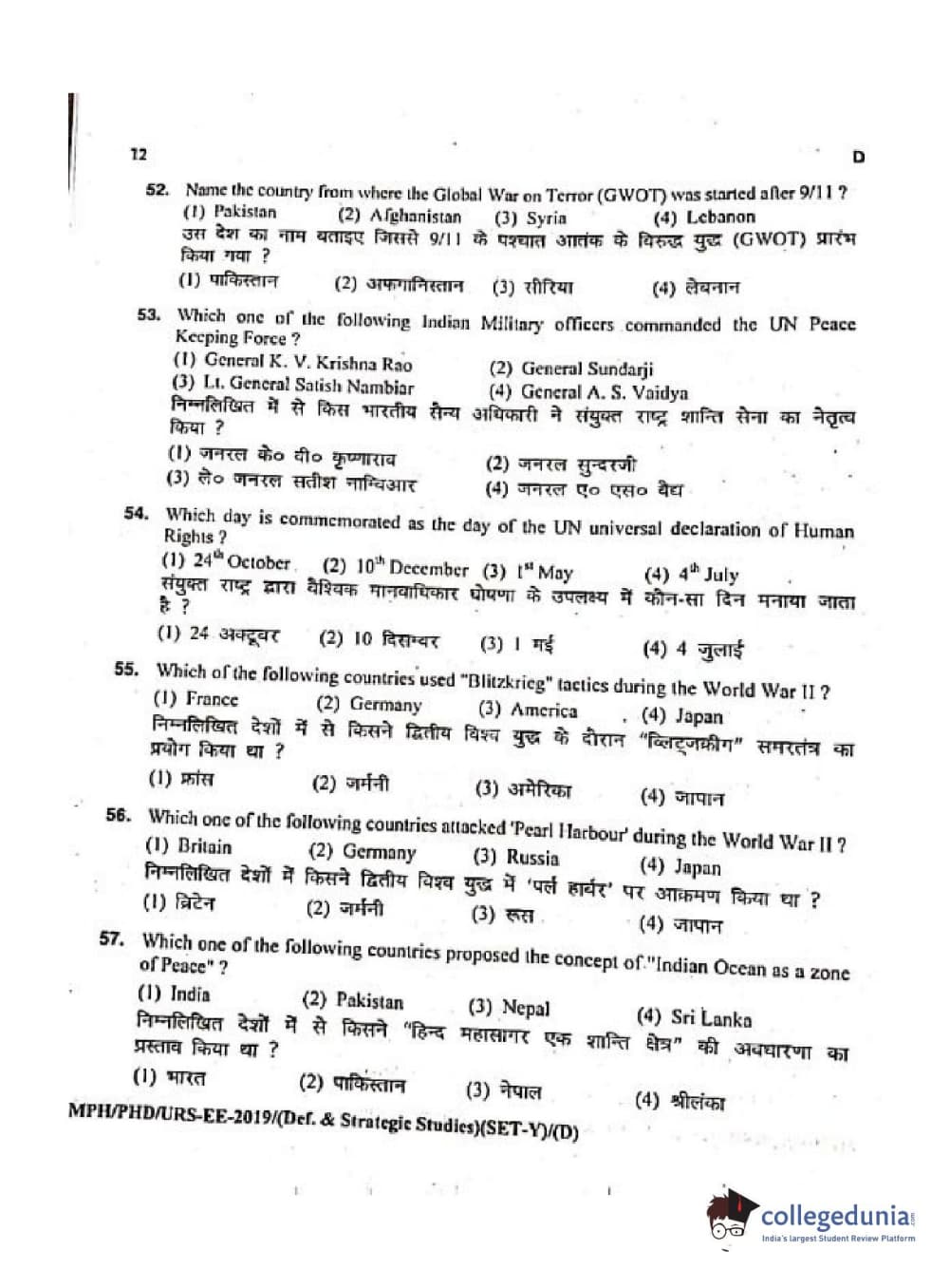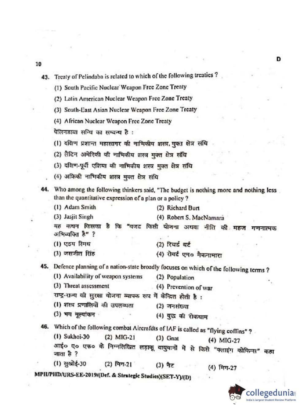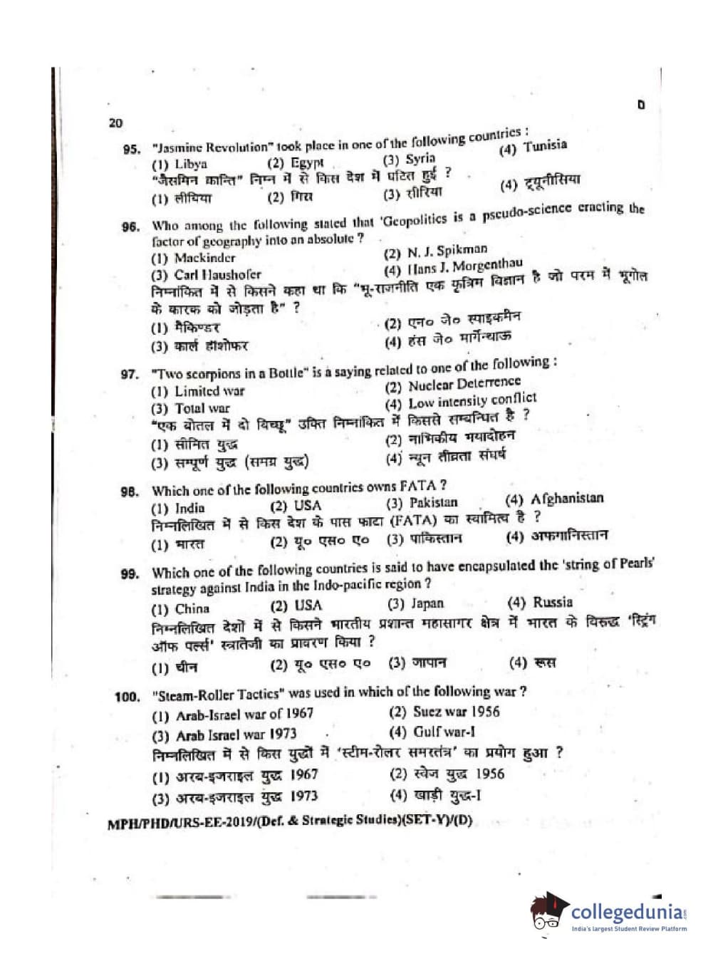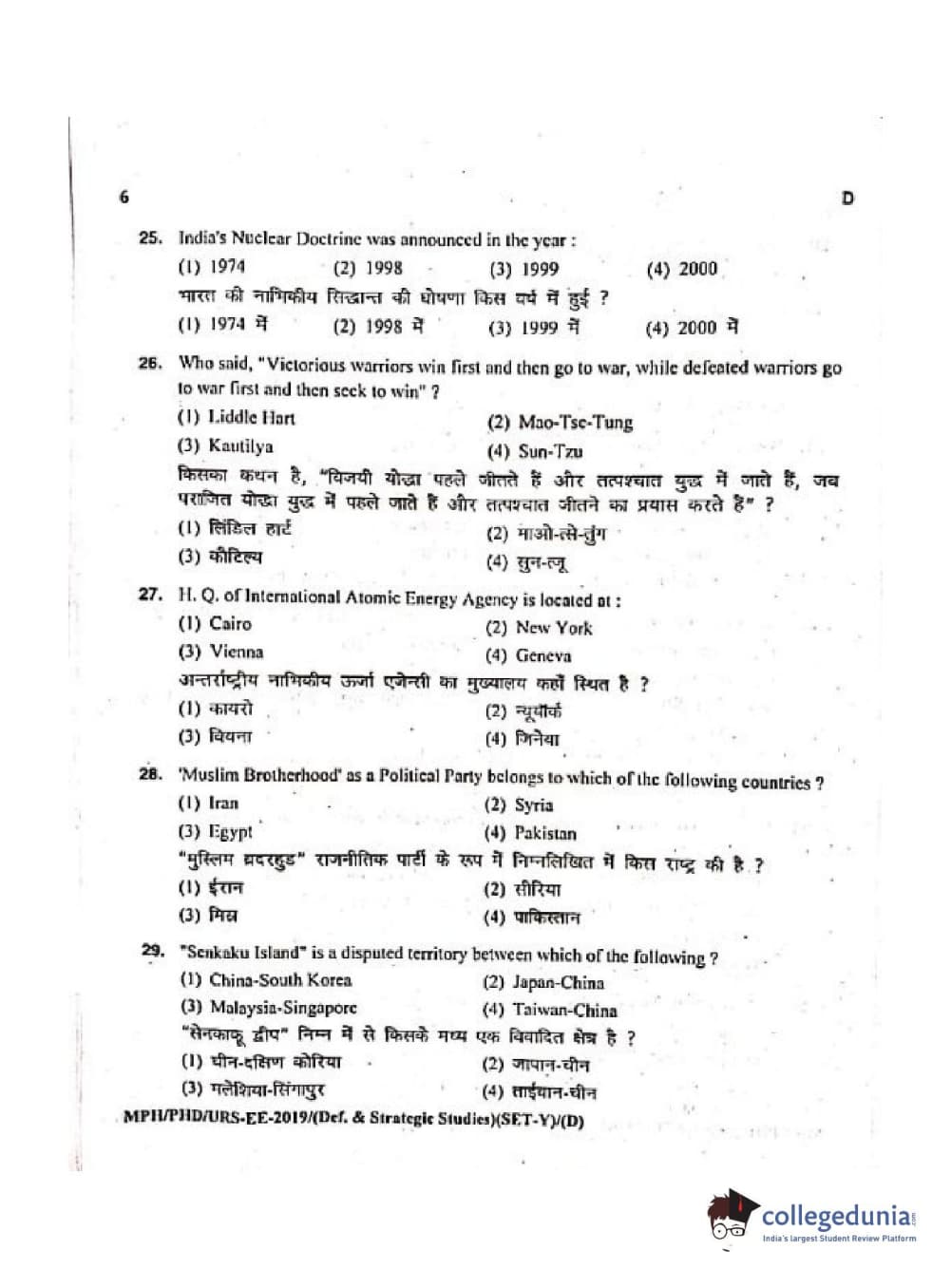 MDUCEE 2019 Ph.D./M.Phil./URS Defence Strategic Studies Set D Question Paper with Answer Key PDFs