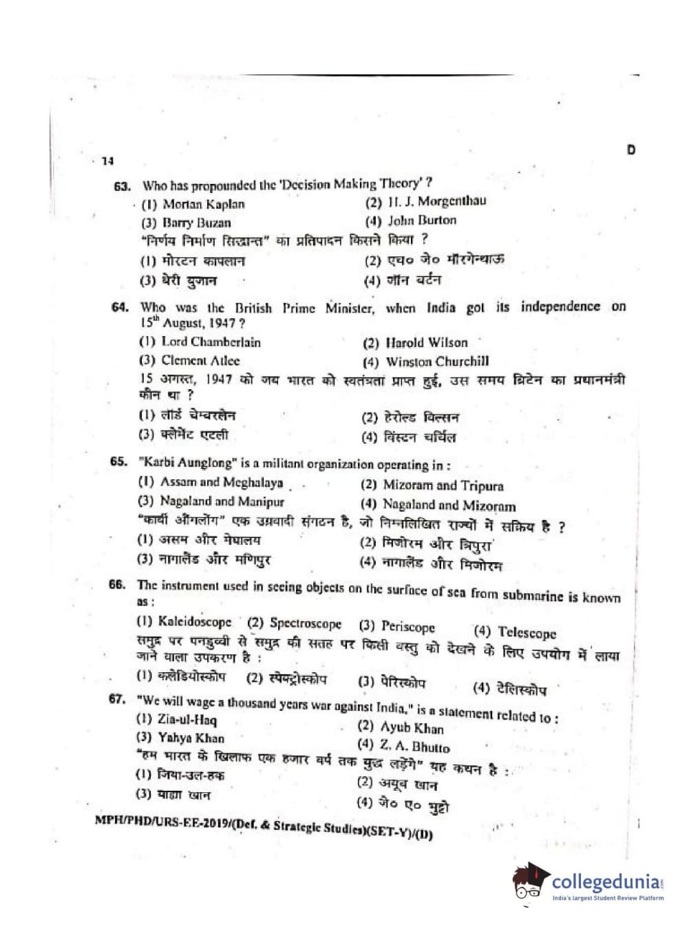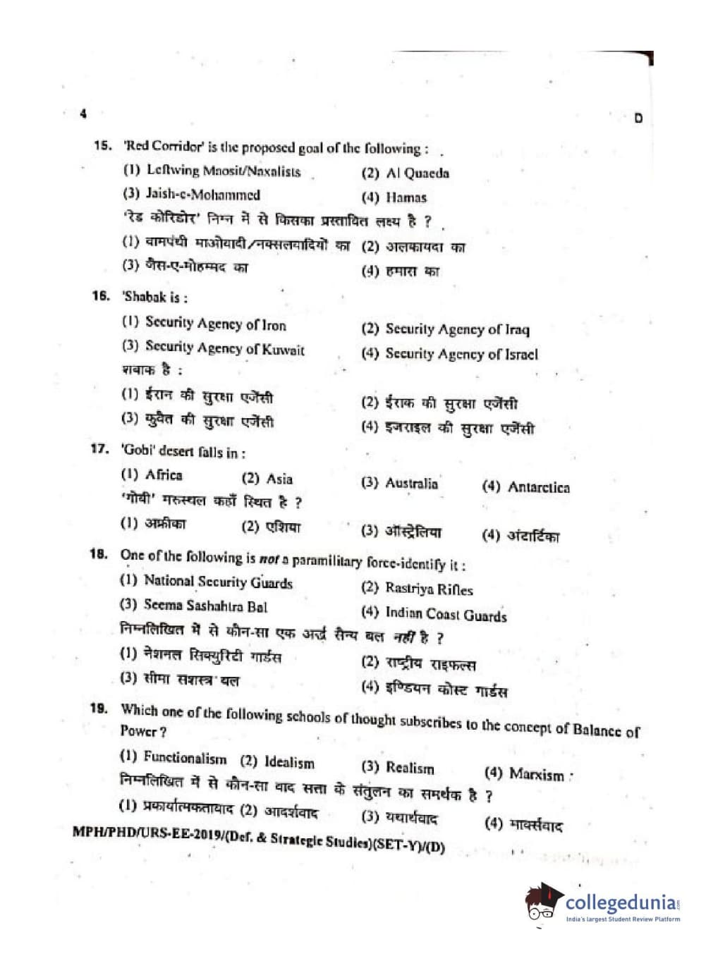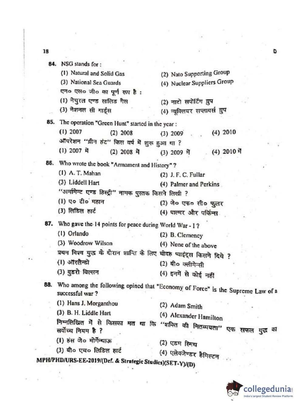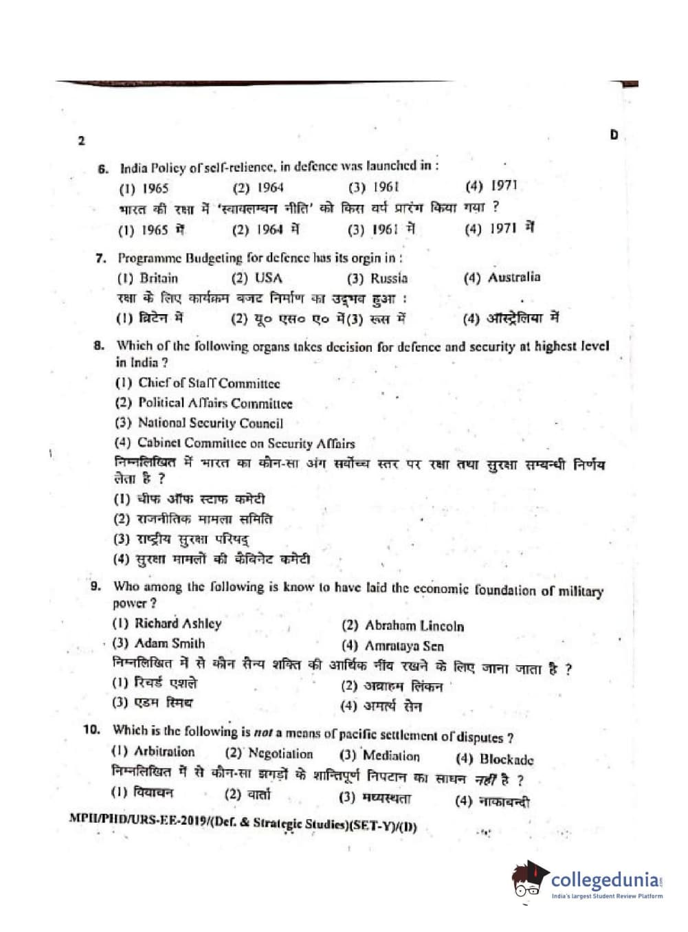 MDUCEE 2019 Ph.D./M.Phil./URS Defence Strategic Studies Set D Question Paper with Answer Key PDFs