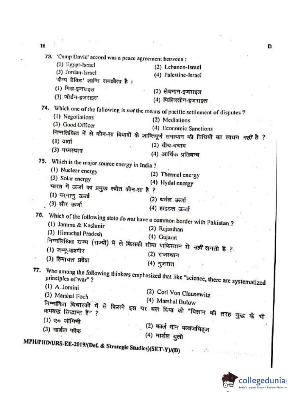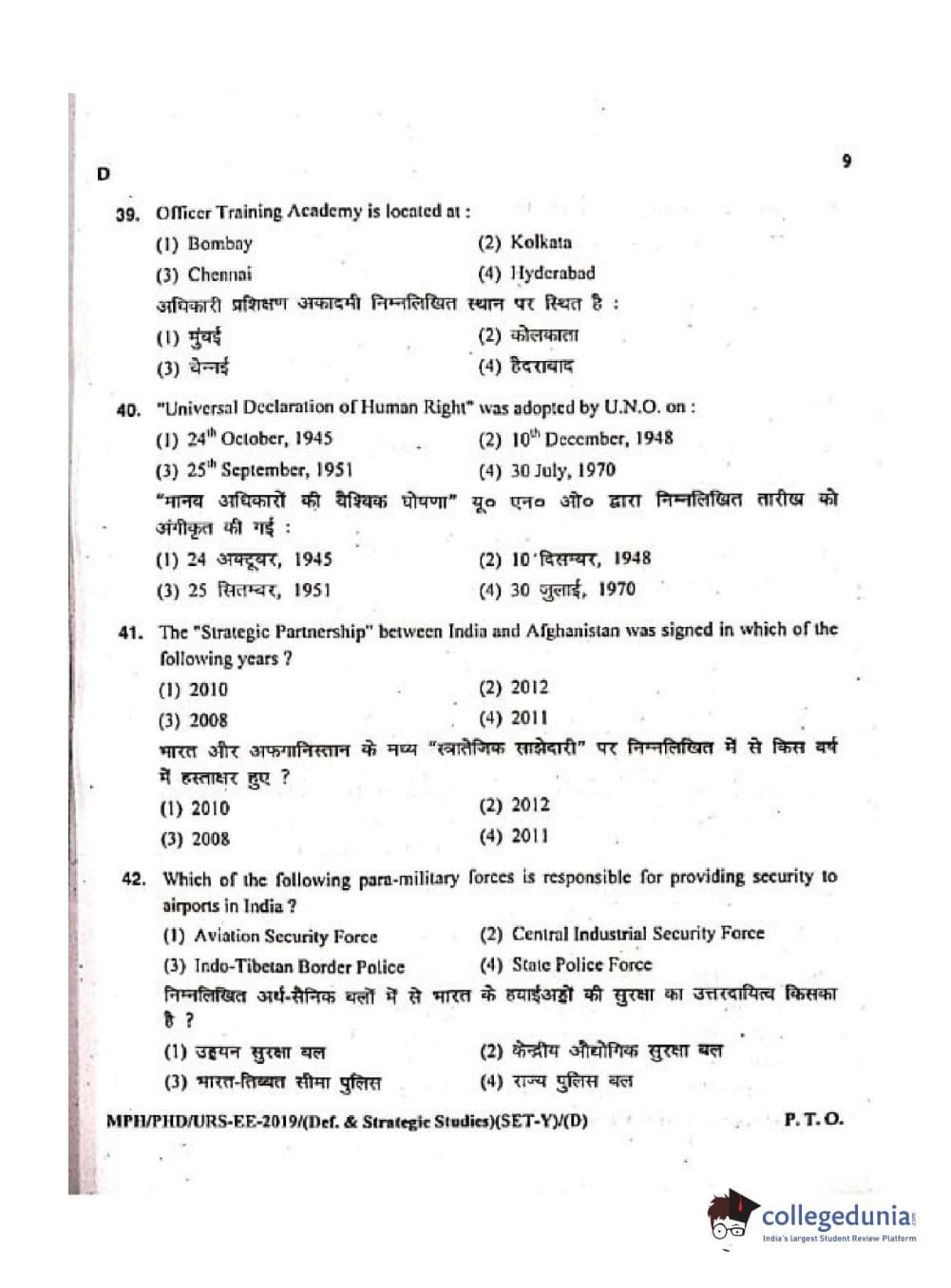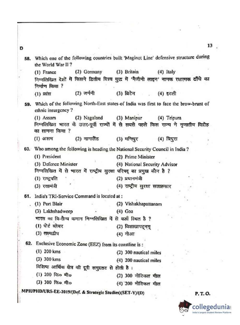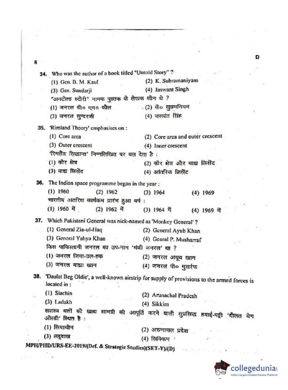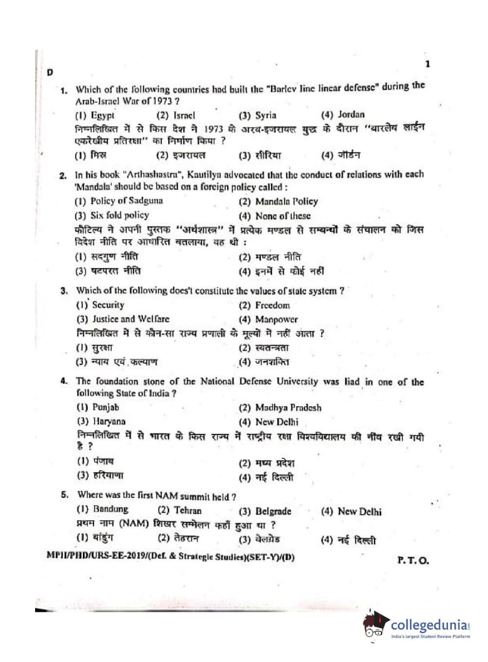 MDUCEE 2019 Ph.D./M.Phil./URS Defence Strategic Studies Set D Question Paper with Answer Key PDFs