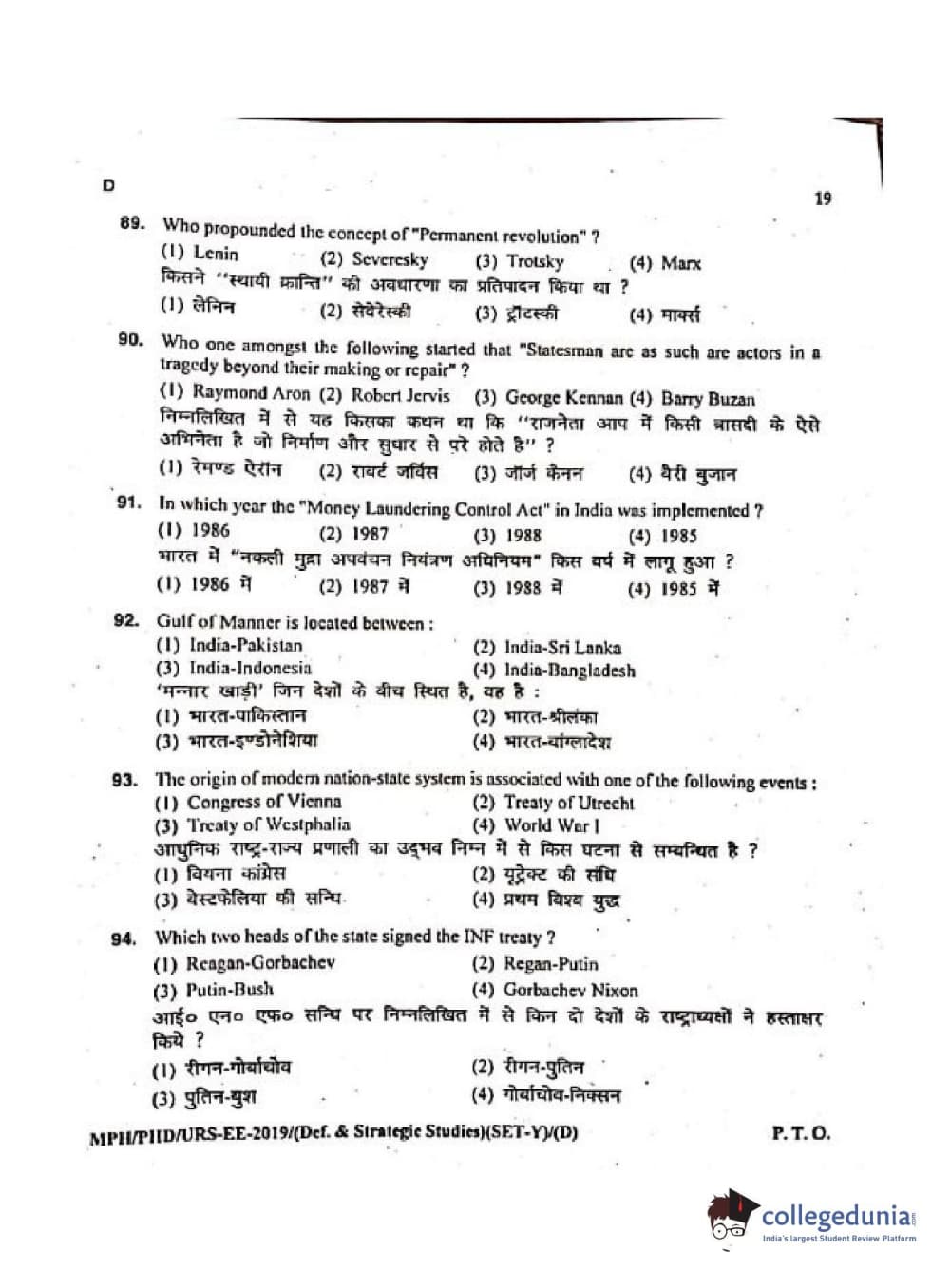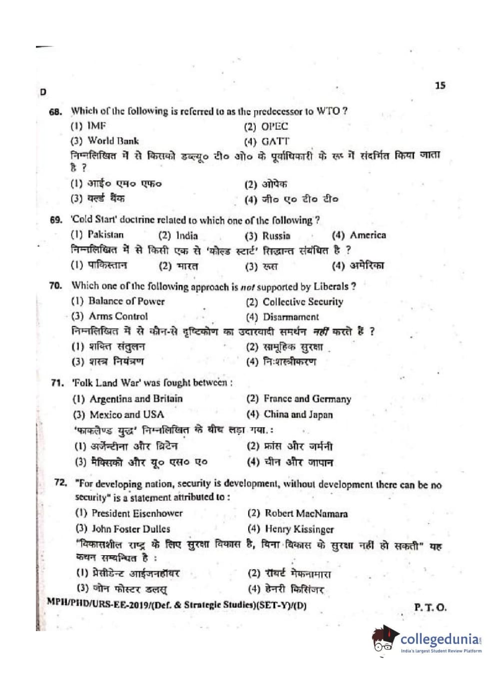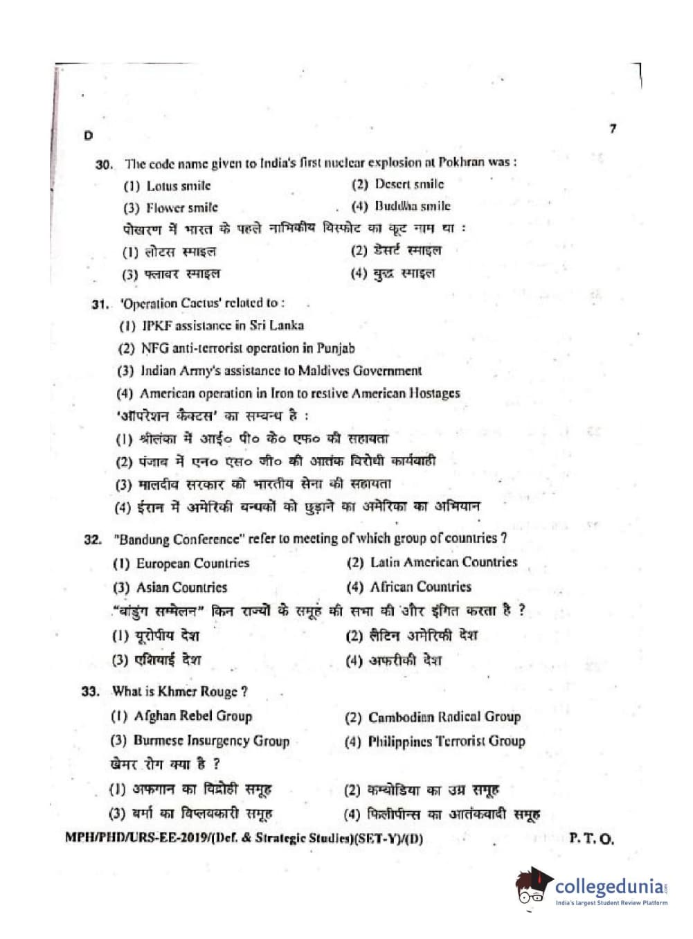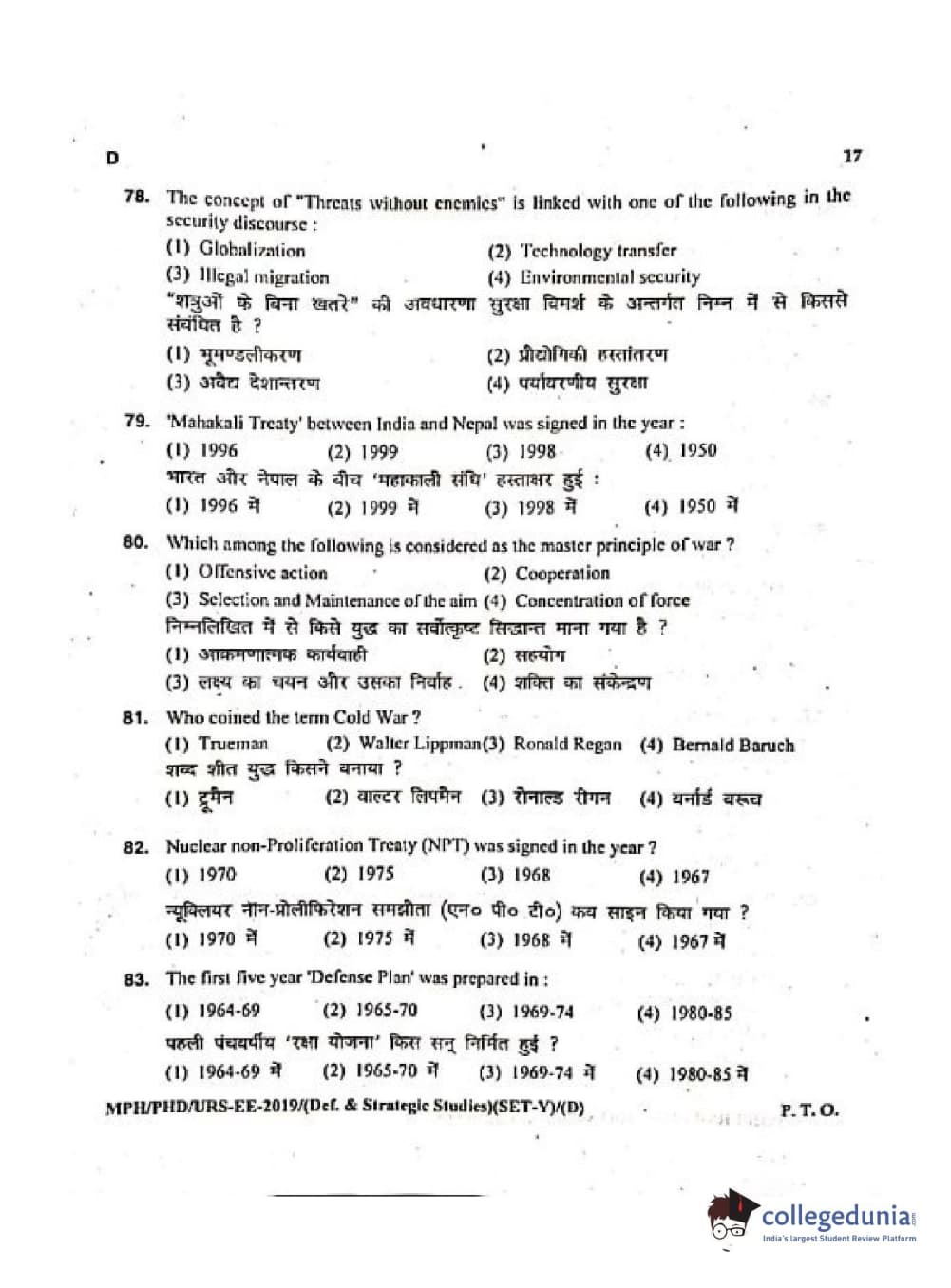 MDUCEE 2019 Ph.D./M.Phil./URS Defence Strategic Studies Set D Question Paper with Answer Key PDFs