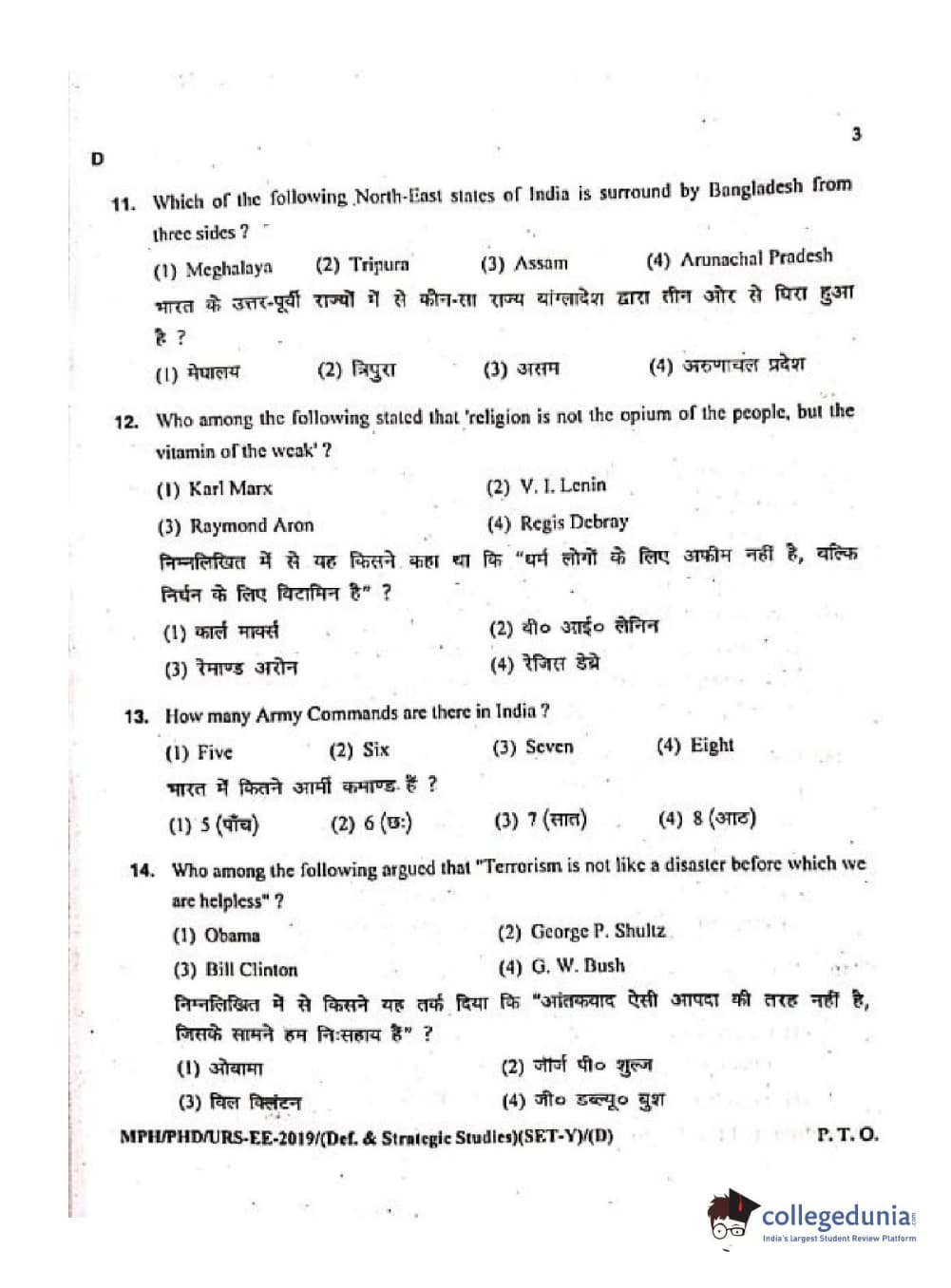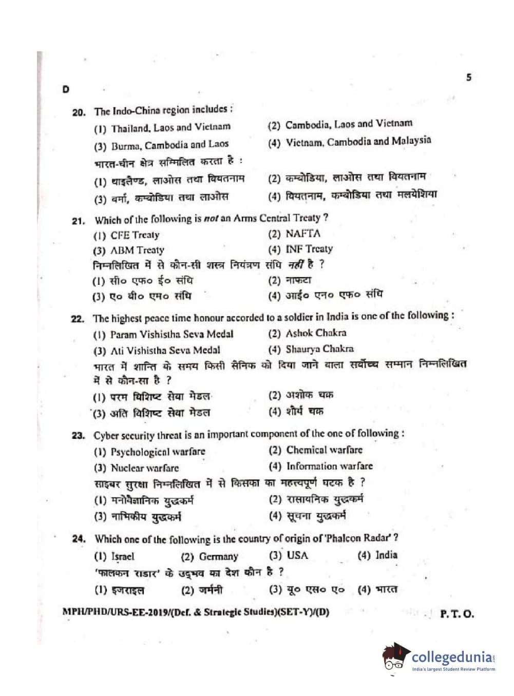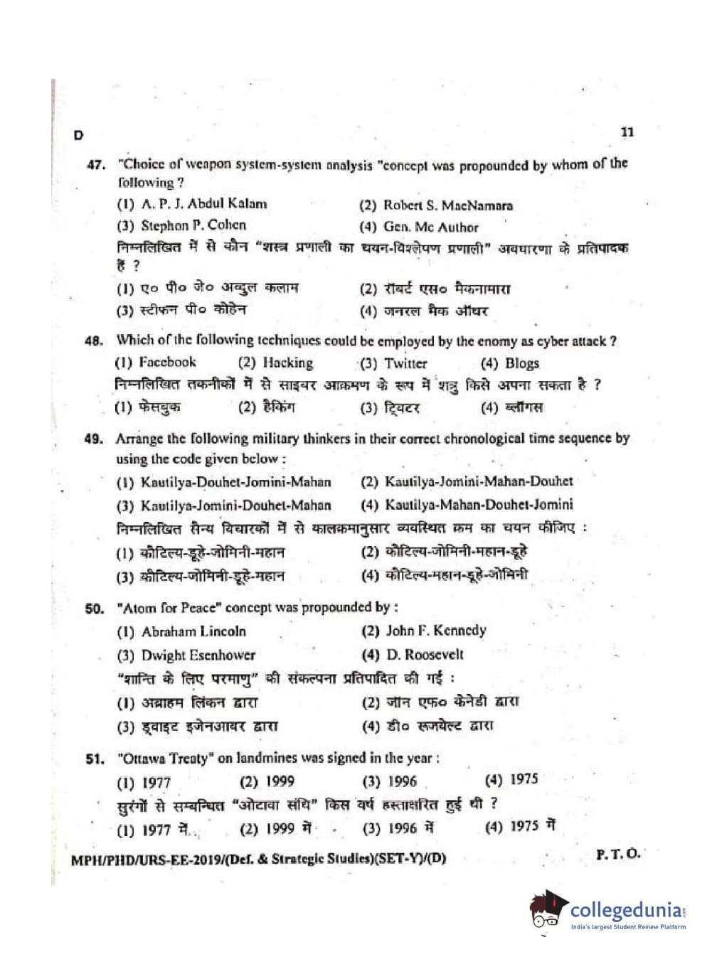 | MDUCEE 2019 Ph.D./M.Phil./URS Defence Strategic Studies Set D Question Paper PDF | MDUCEE 2019 Ph.D./M.Phil./URS Defence Strategic Studies Set D Answer Key PDF |