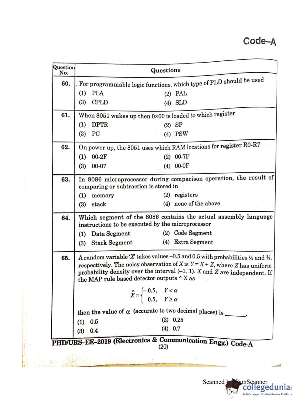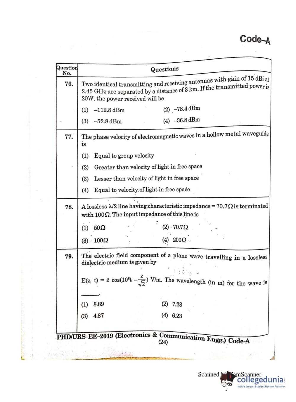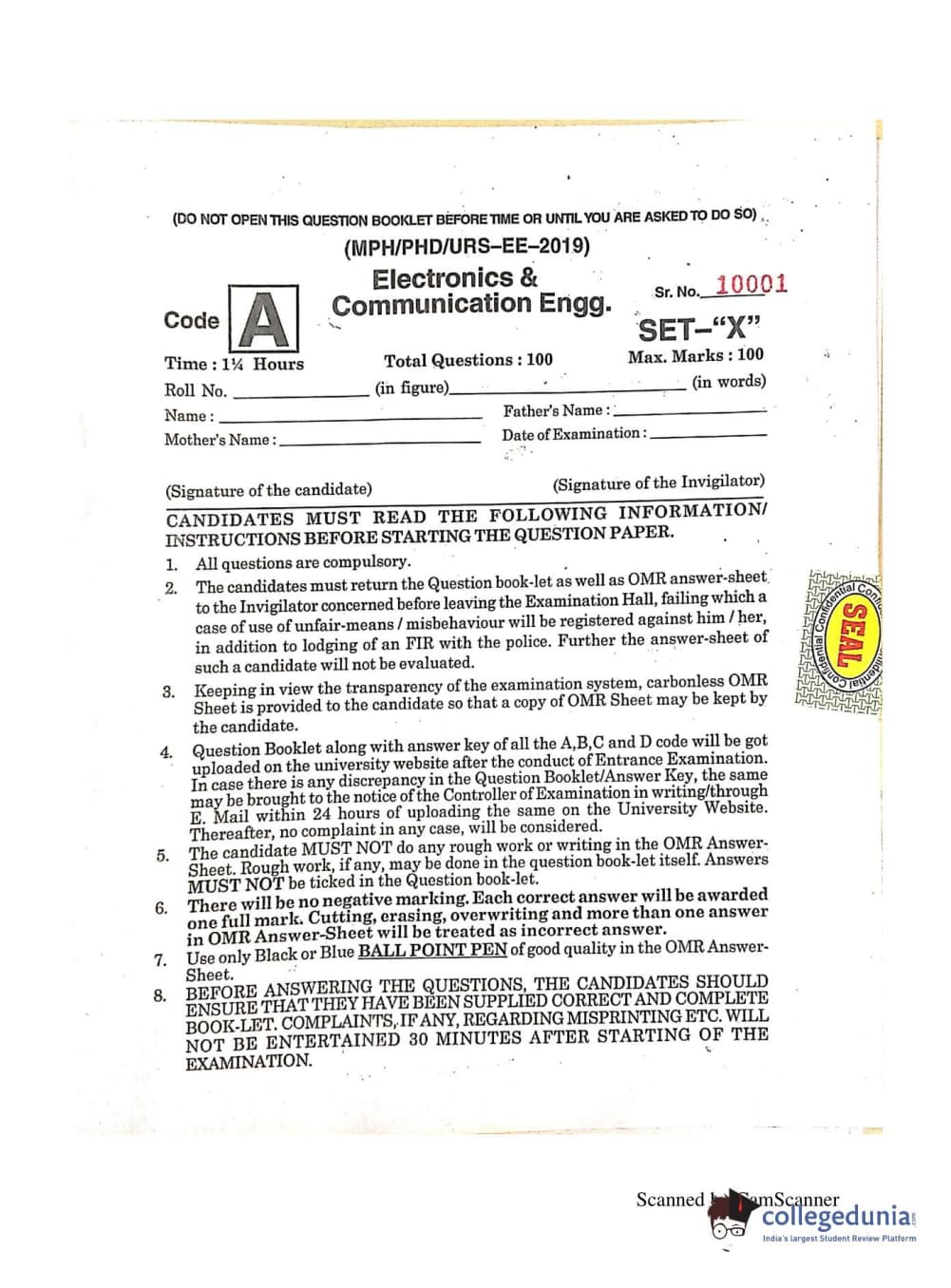 MDUCEE 2019 Ph.D./M.Phil./URS Electronics and Communication Engg. Set A Question Paper with Answer Key PDFs
