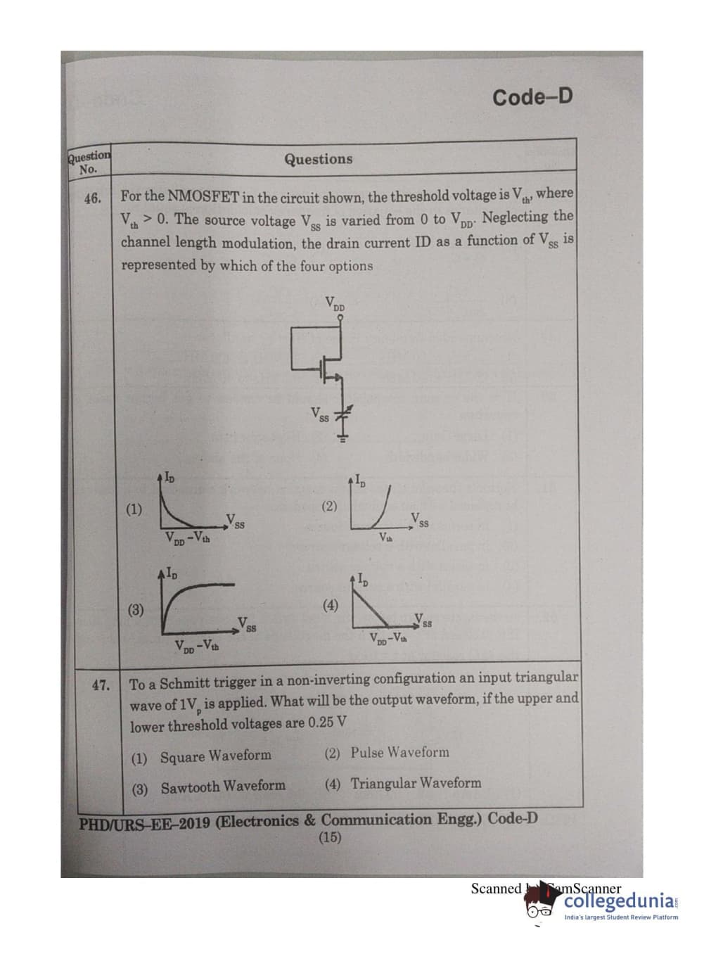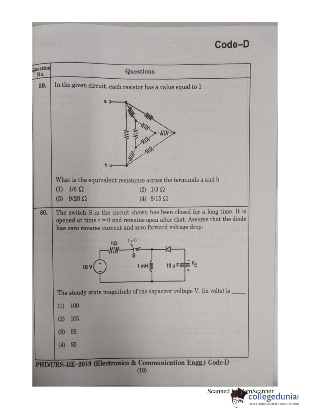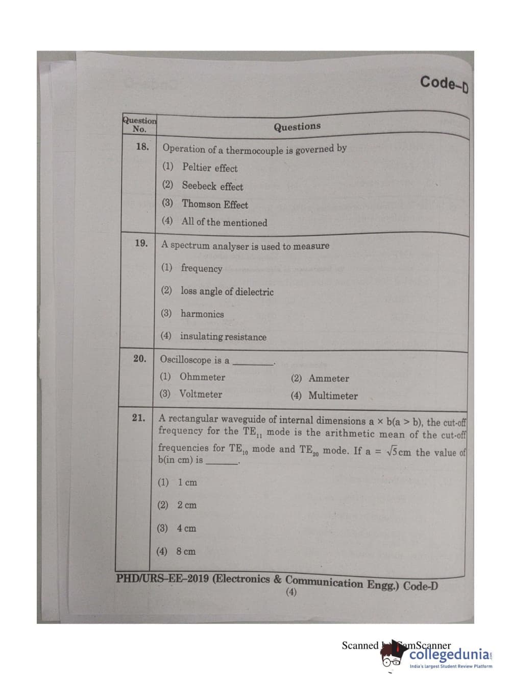 MDUCEE 2019 Ph.D./M.Phil./URS Electonics and Communication Engg. Set D Question Paper with Answer Key PDFs