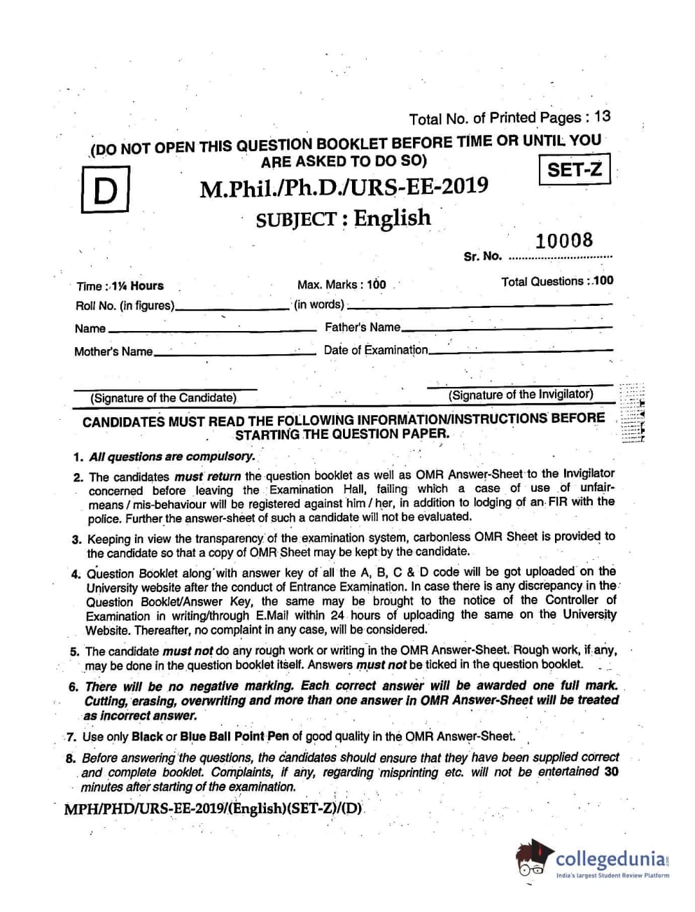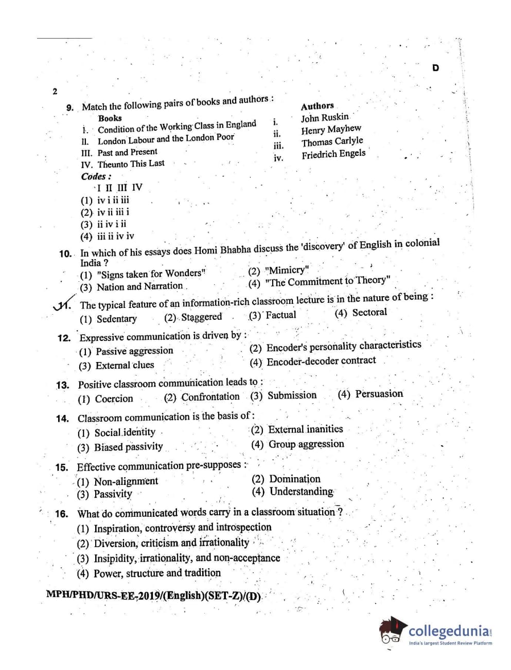 | MDUCEE 2019 Ph.D./M.Phil./URS English Set D Question Paper PDF | MDUCEE 2019 Ph.D./M.Phil./URS English Set D Answer Key PDF |