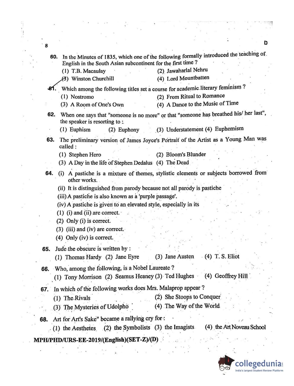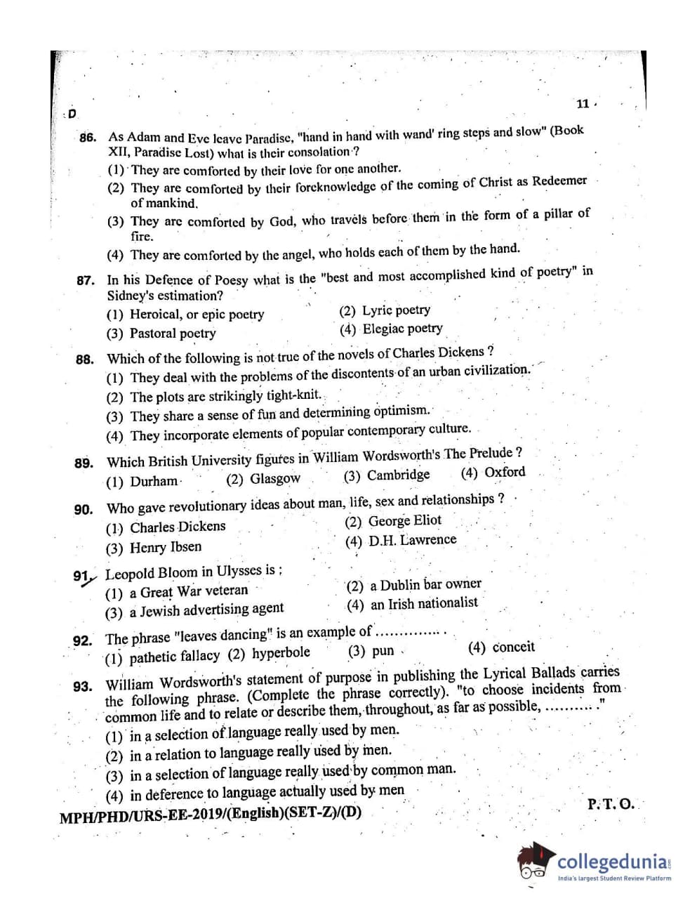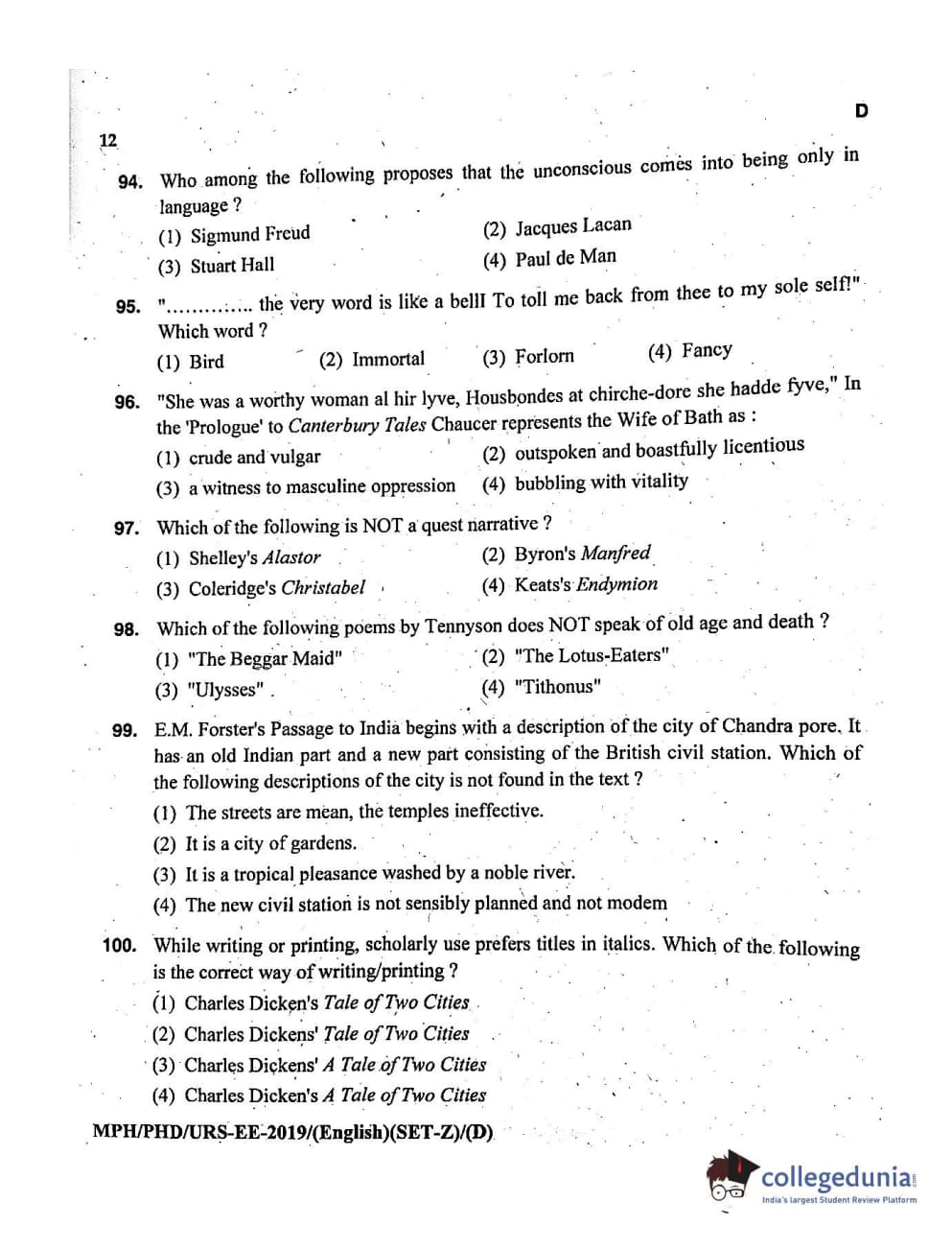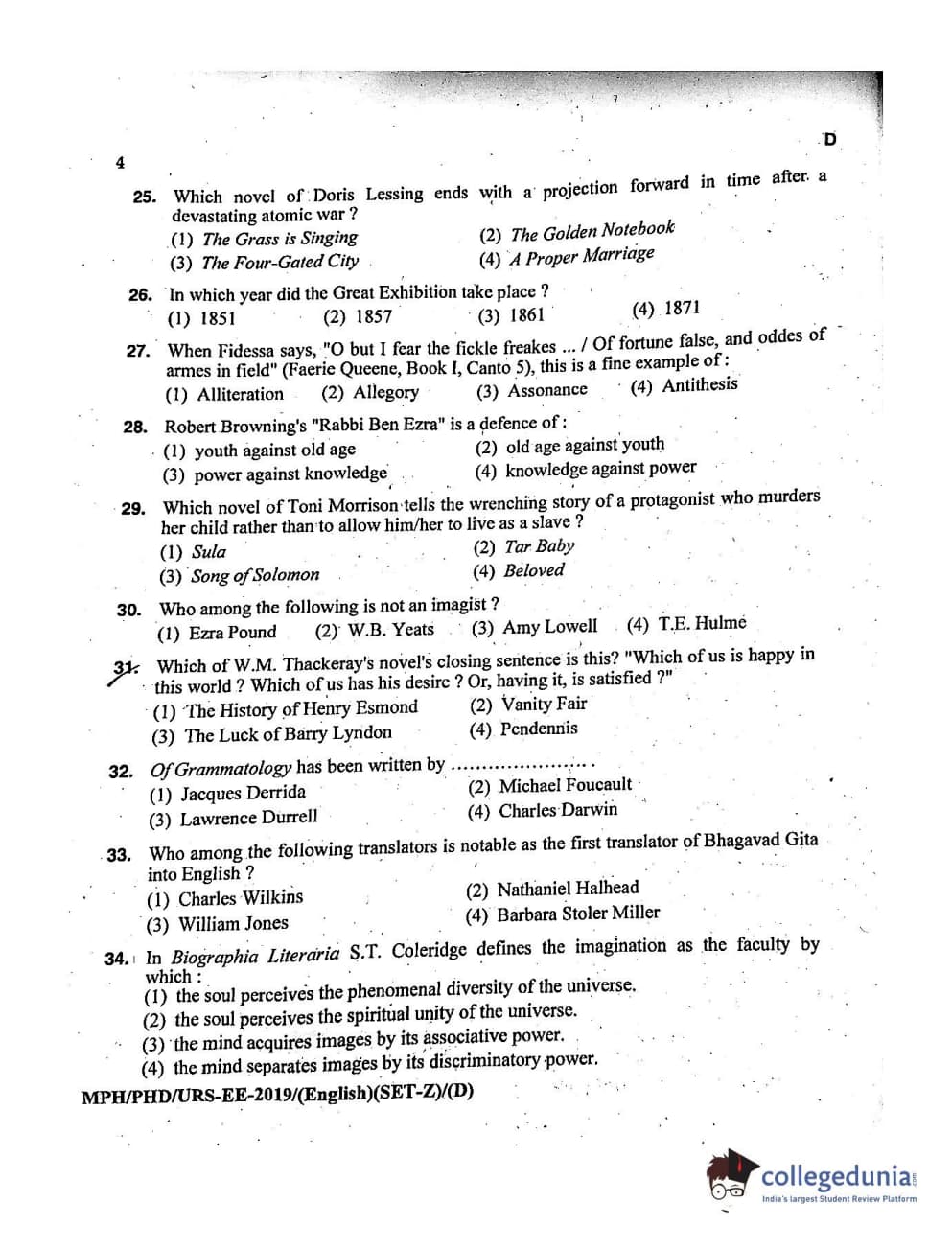 MDUCEE 2019 Ph.D./M.Phil./URS English Set D Question Paper with Answer Key PDFs