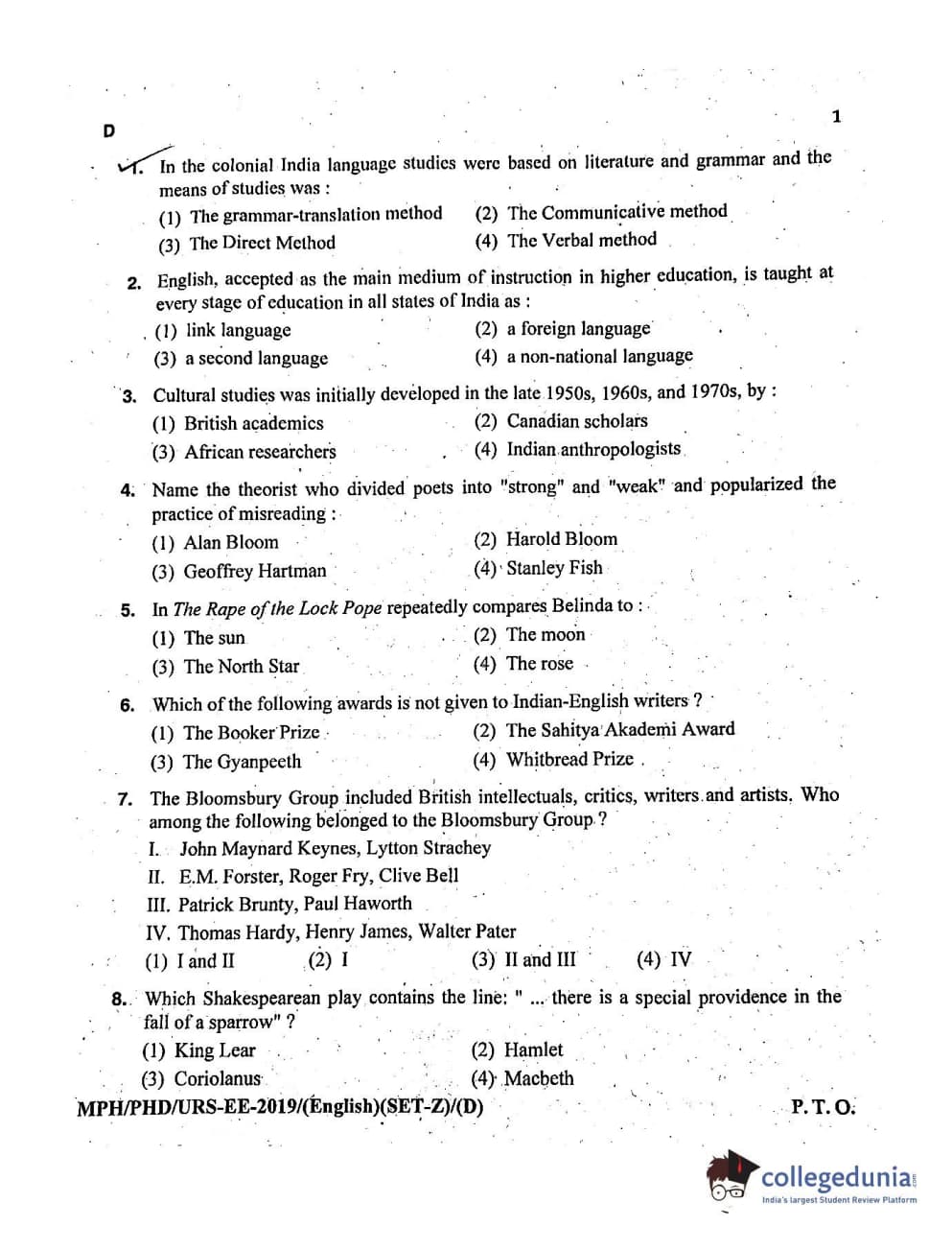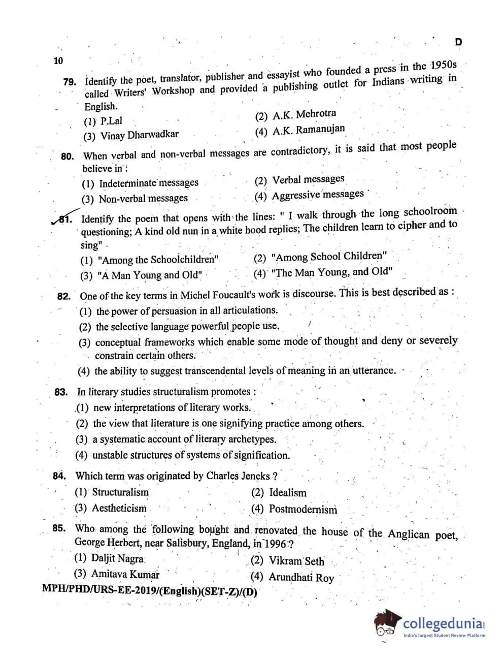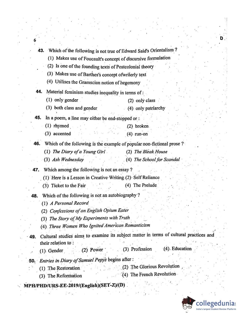 MDUCEE 2019 Ph.D./M.Phil./URS English Set D Question Paper with Answer Key PDFs