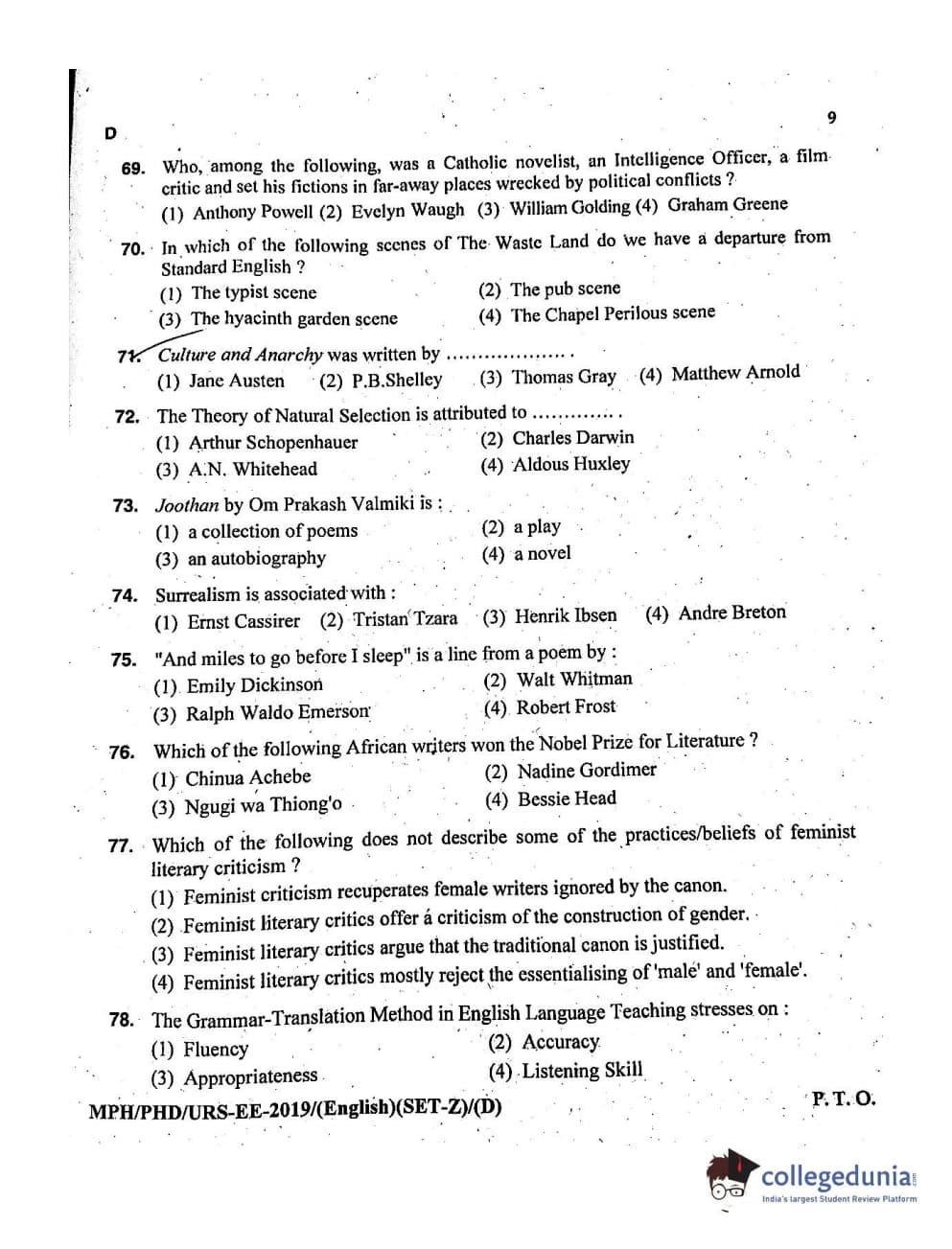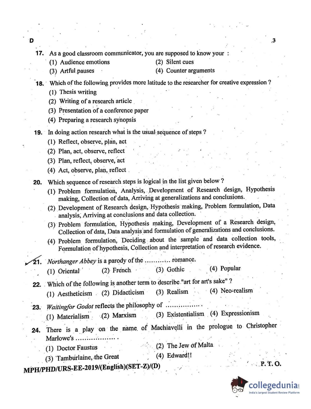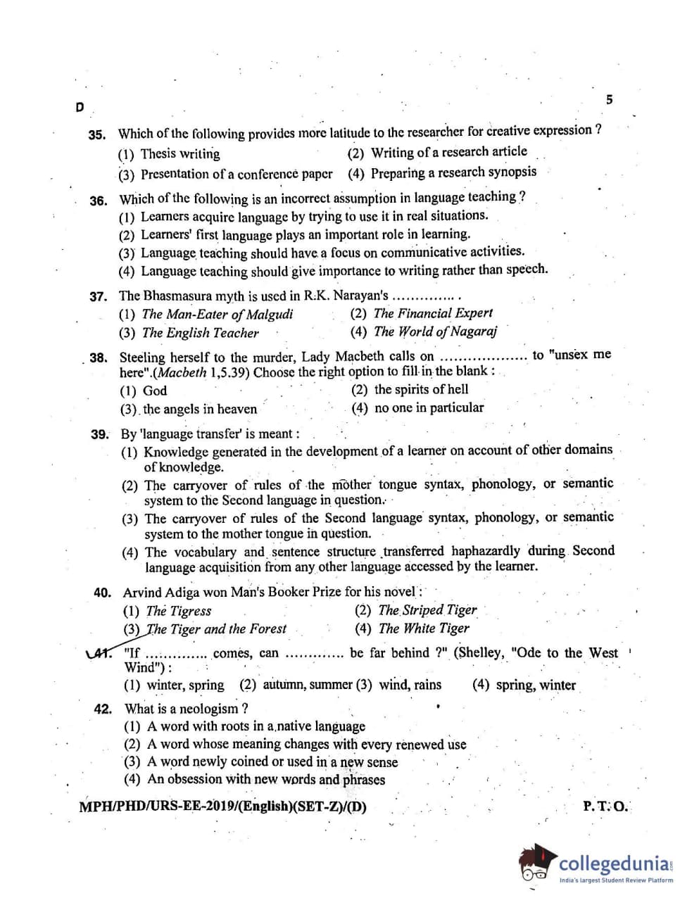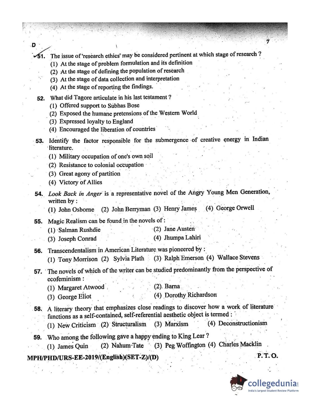 MDUCEE 2019 Ph.D./M.Phil./URS English Set D Question Paper with Answer Key PDFs