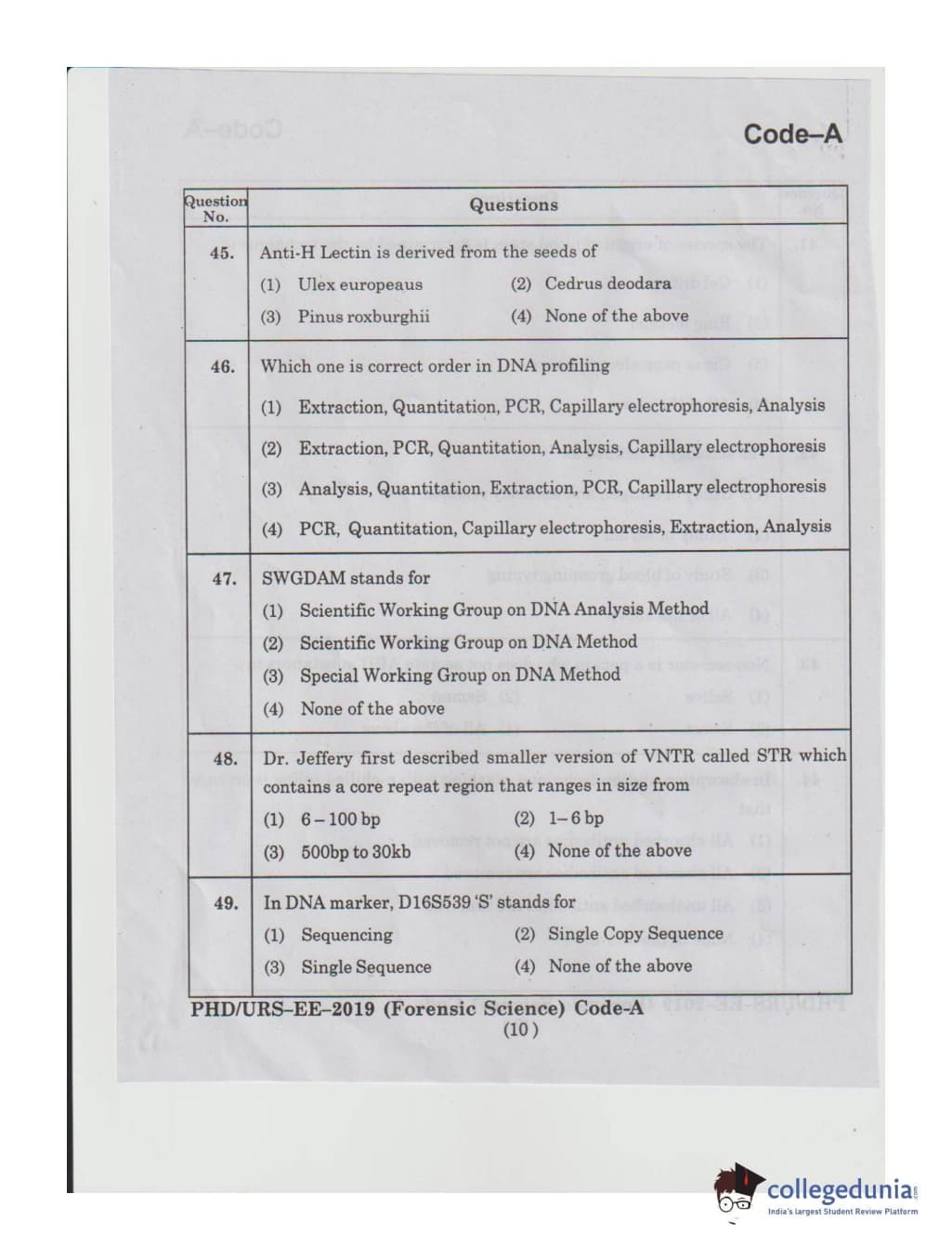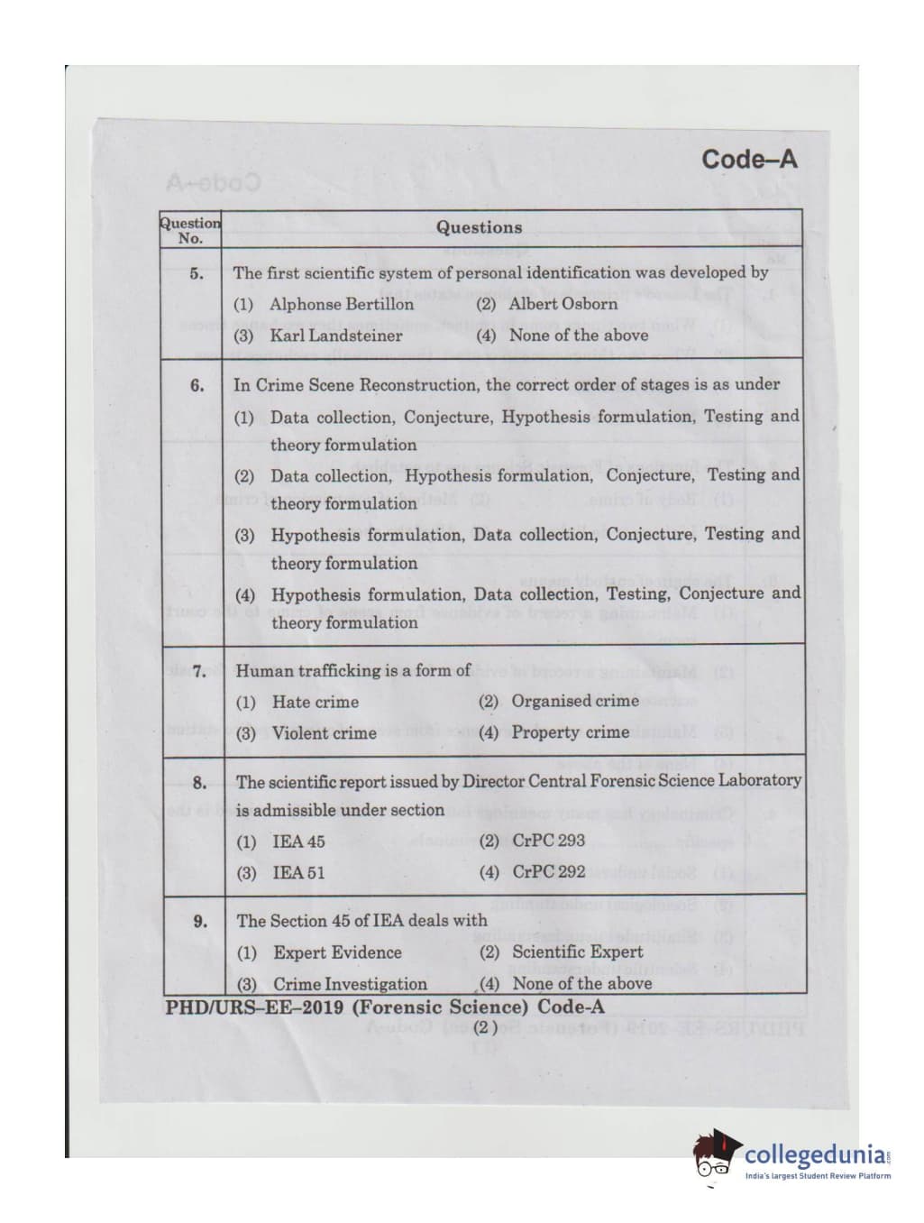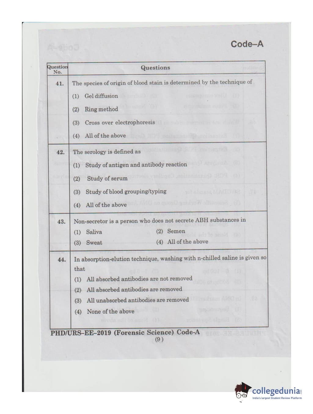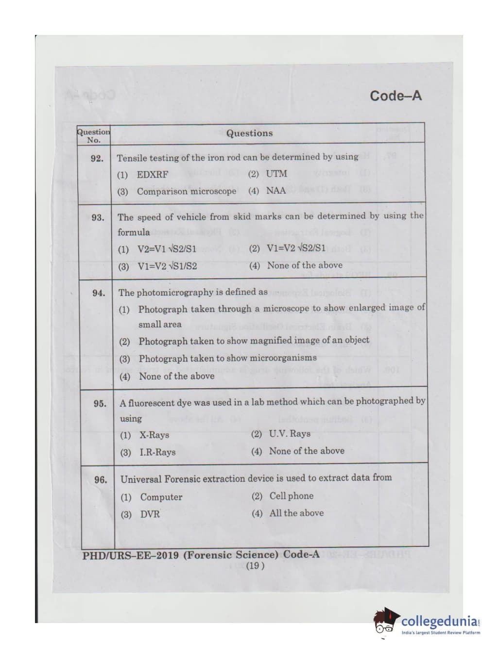 MDUCEE 2019 Ph.D./M.Phil./URS Forensic Science Set A Question Paper with Answer Key PDFs