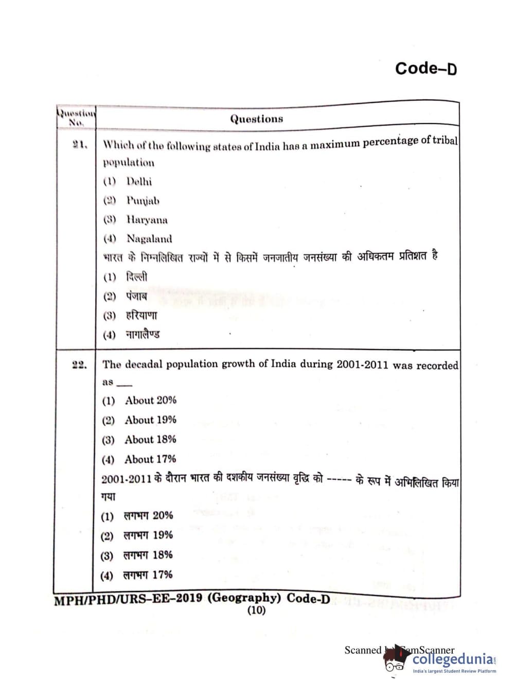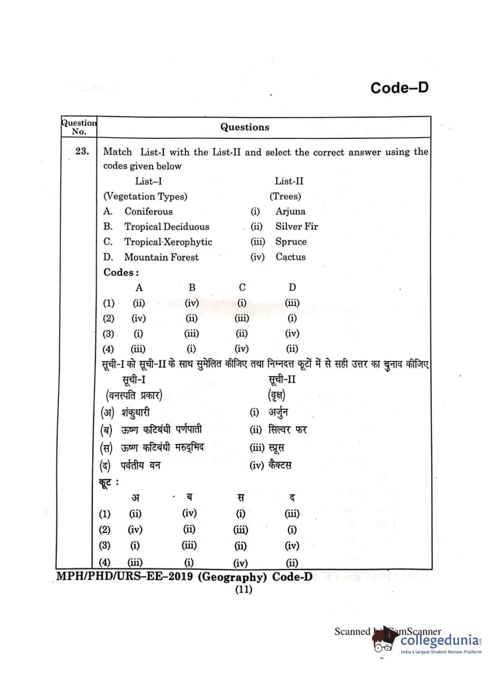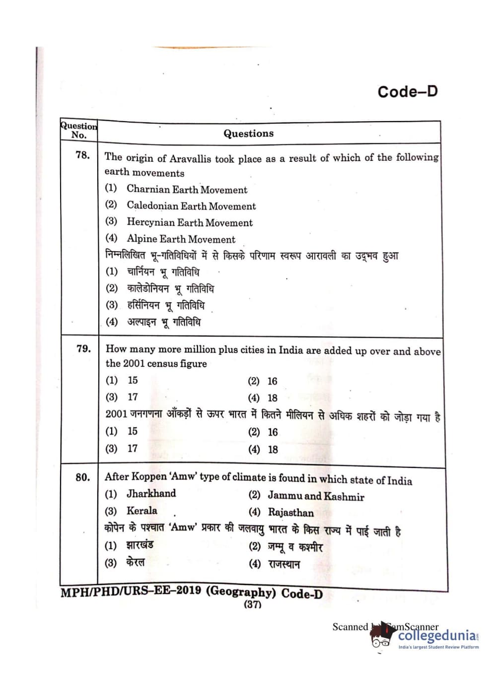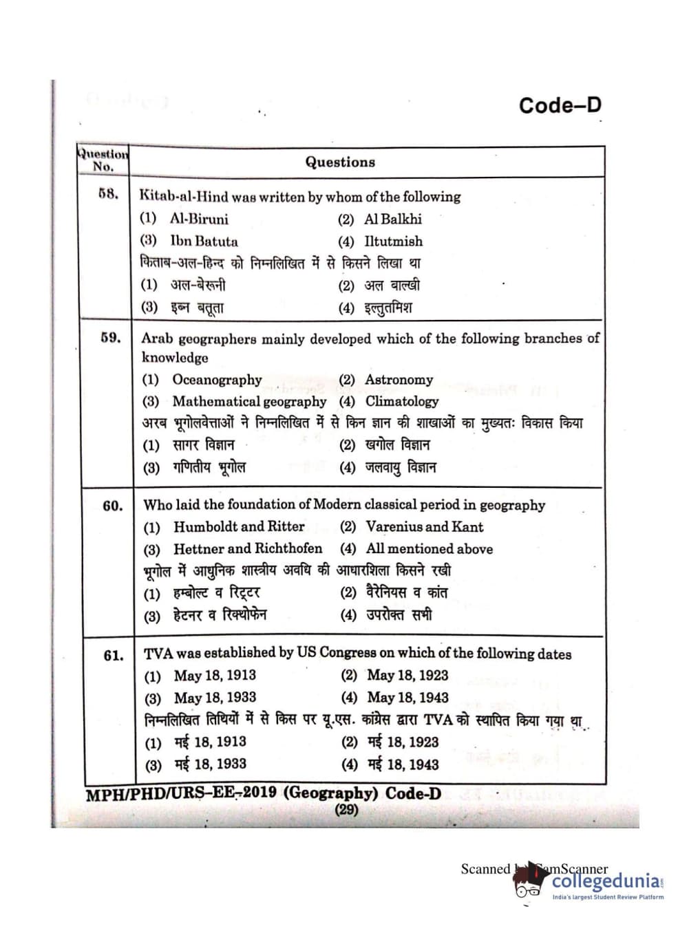 MDUCEE 2019 Ph.D./M.Phil./URS Geography Set D Question Paper with Answer Key PDFs