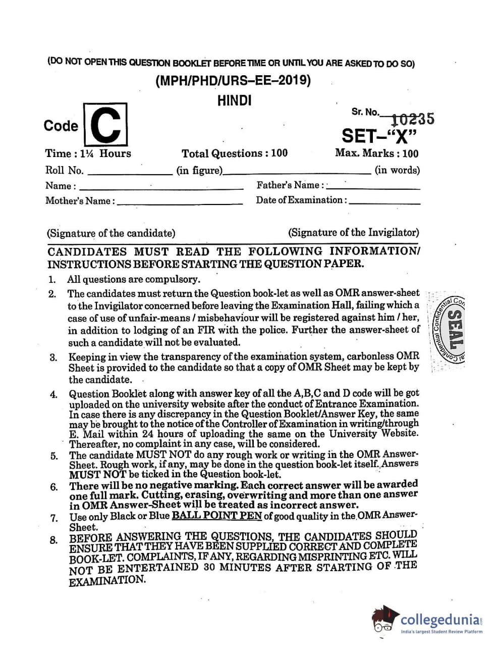 MDUCEE 2019 Ph.D./M.Phil./URS Hindi Set C Question paper with answer key pdf is available for download. The exam was successfully organized by Maharishi Dayanand University. The question paper comprised a total of 100 questions.