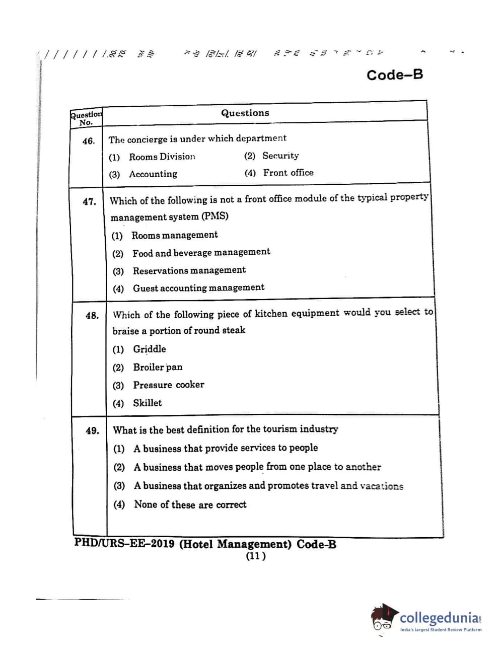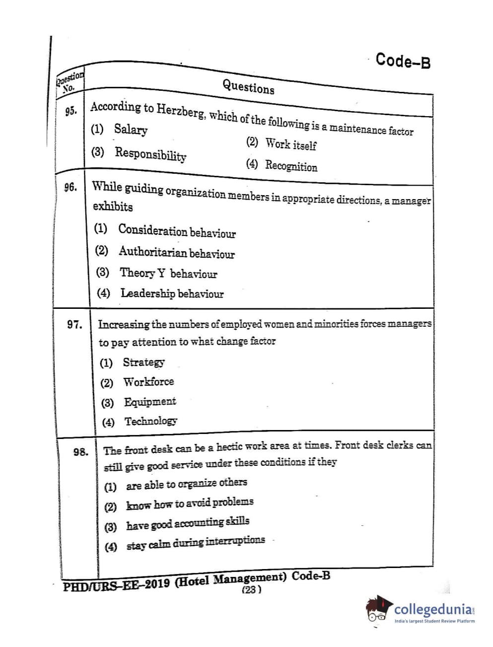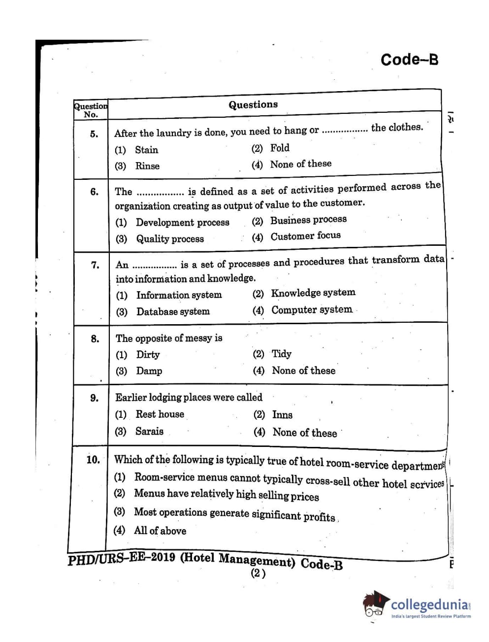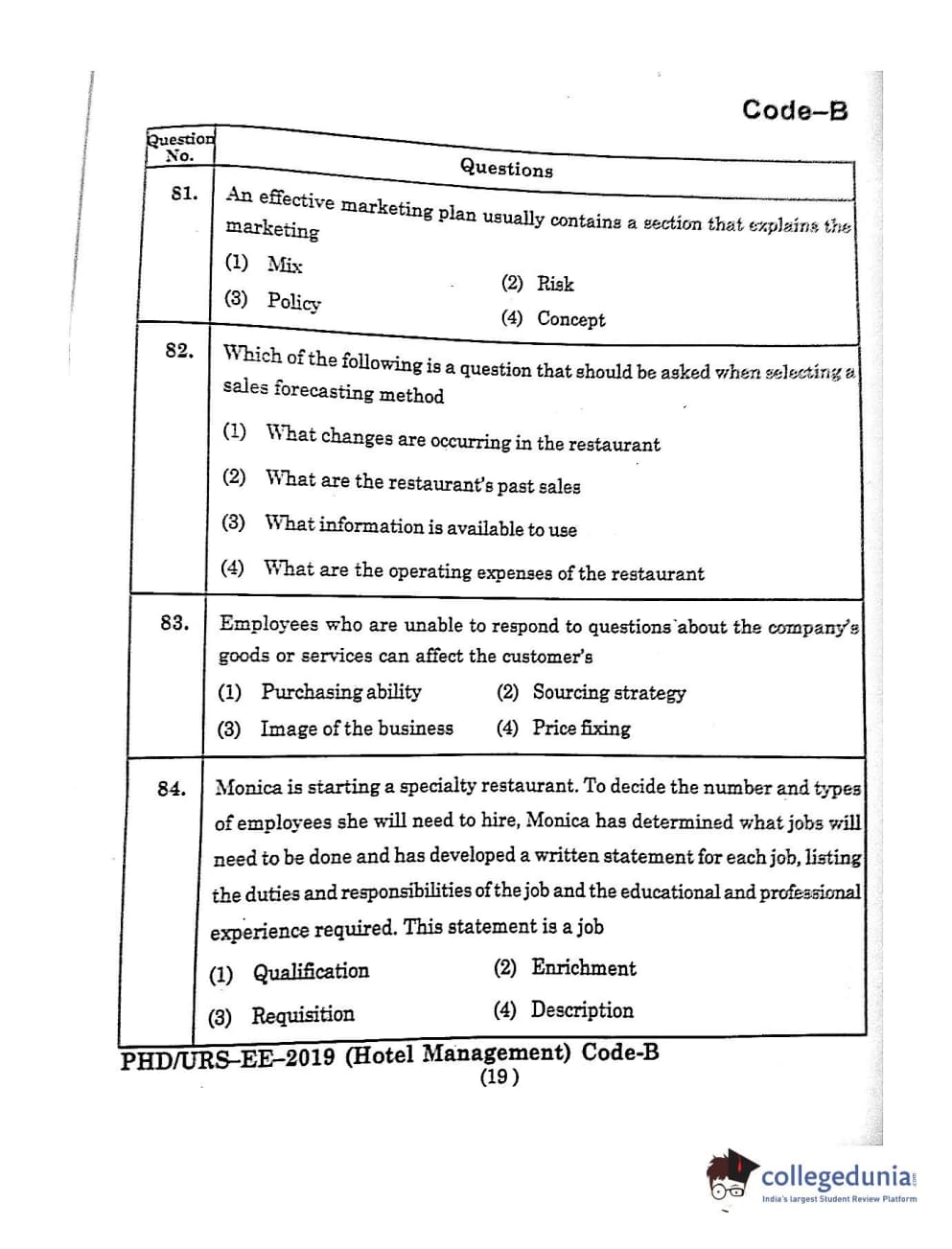 MDUCEE 2019 Ph.D./M.Phil./URS Hotel Management Set B Question Paper with Answer Key PDFs