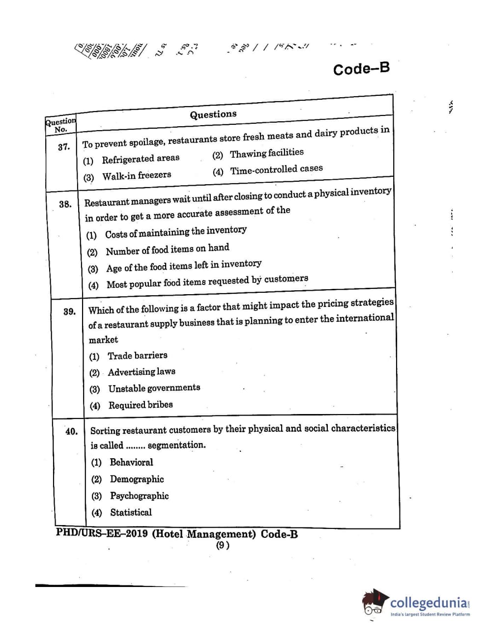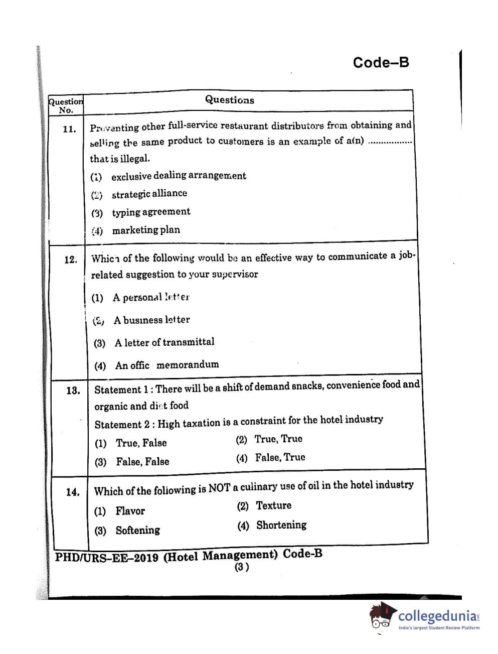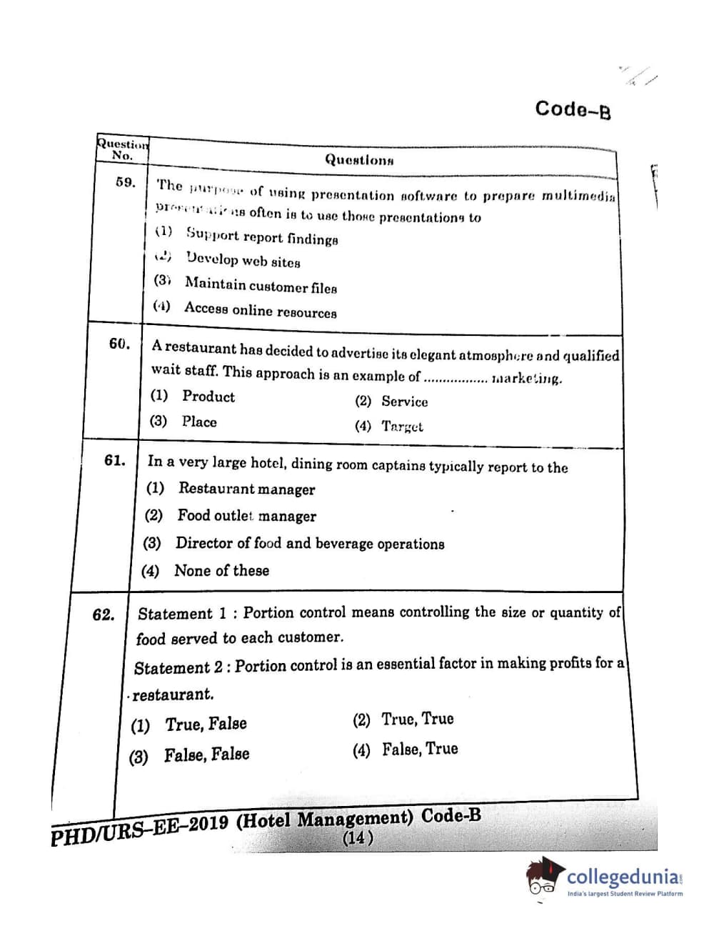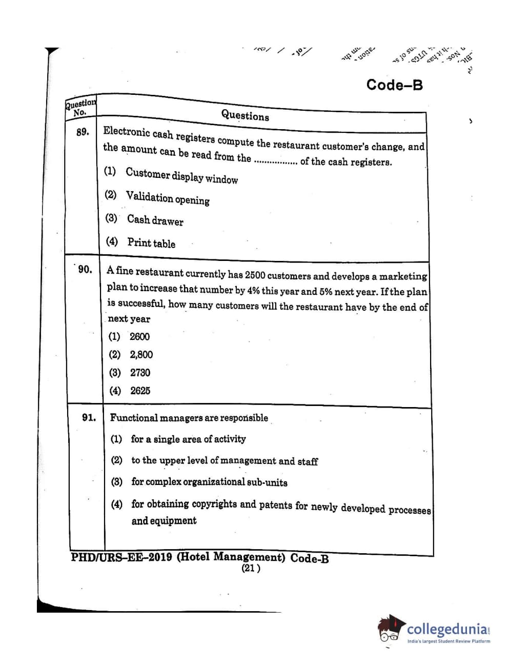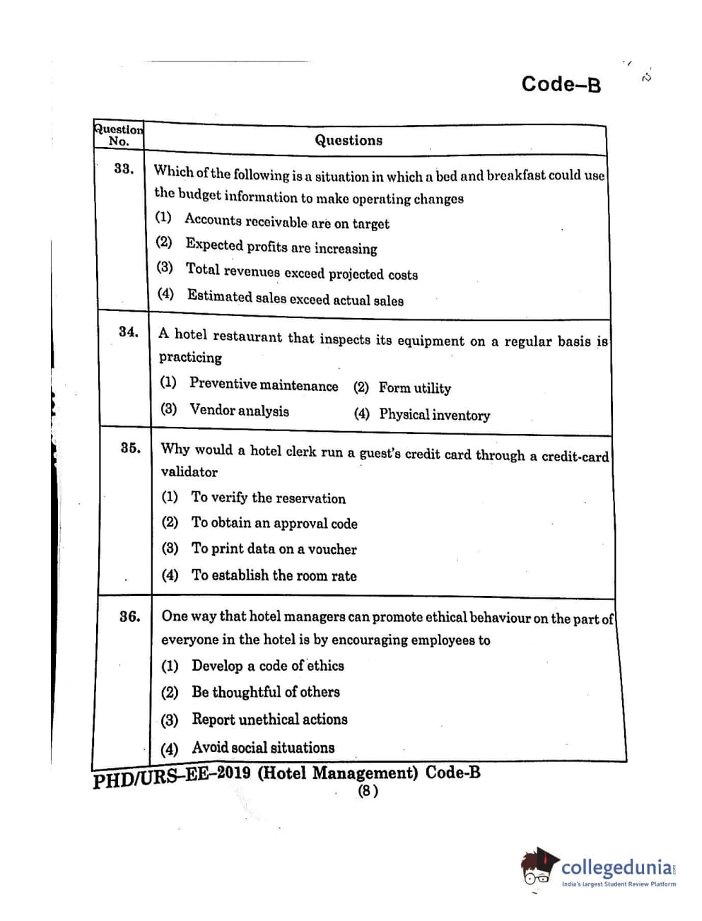 MDUCEE 2019 Ph.D./M.Phil./URS Hotel Management Set B Question Paper with Answer Key PDFs