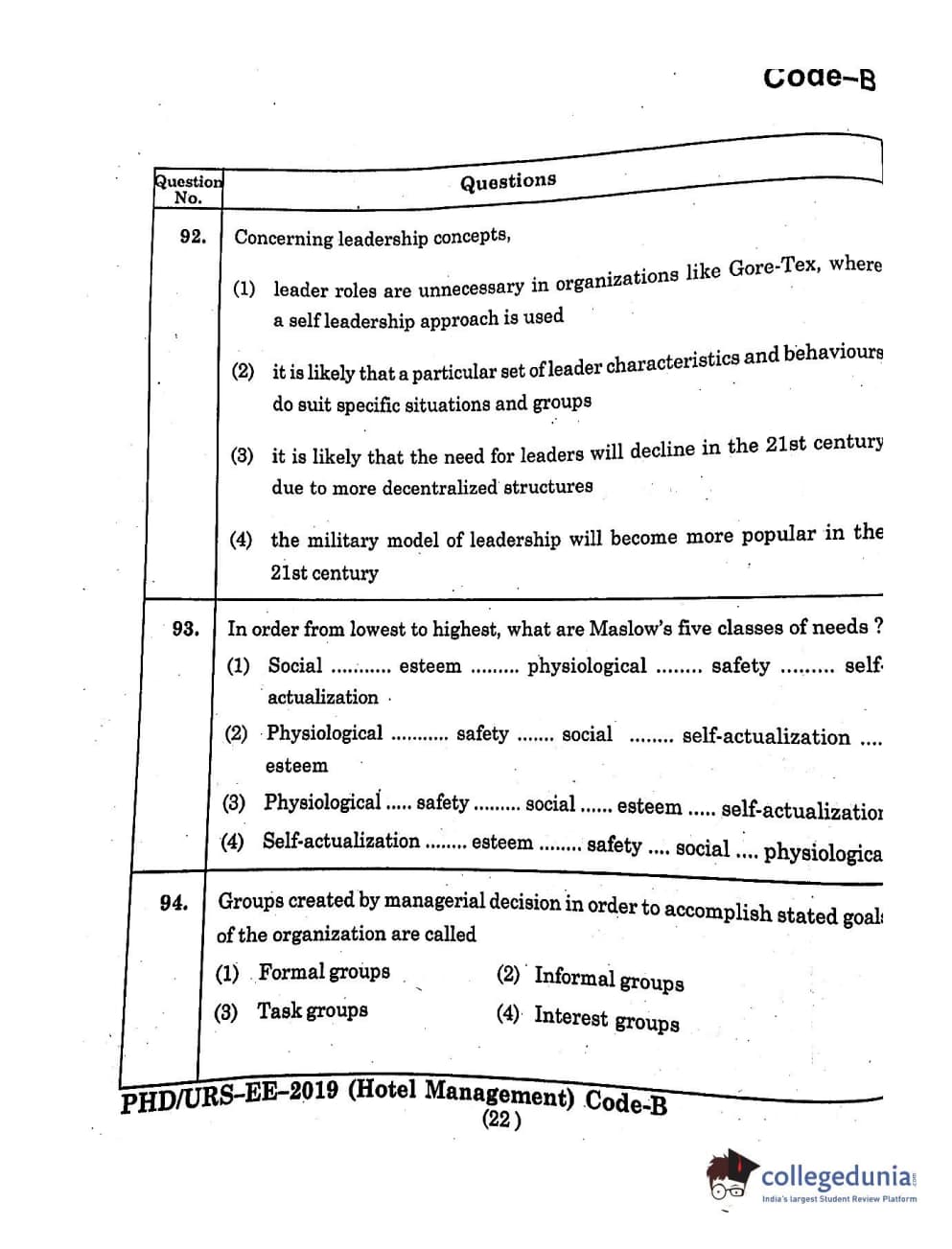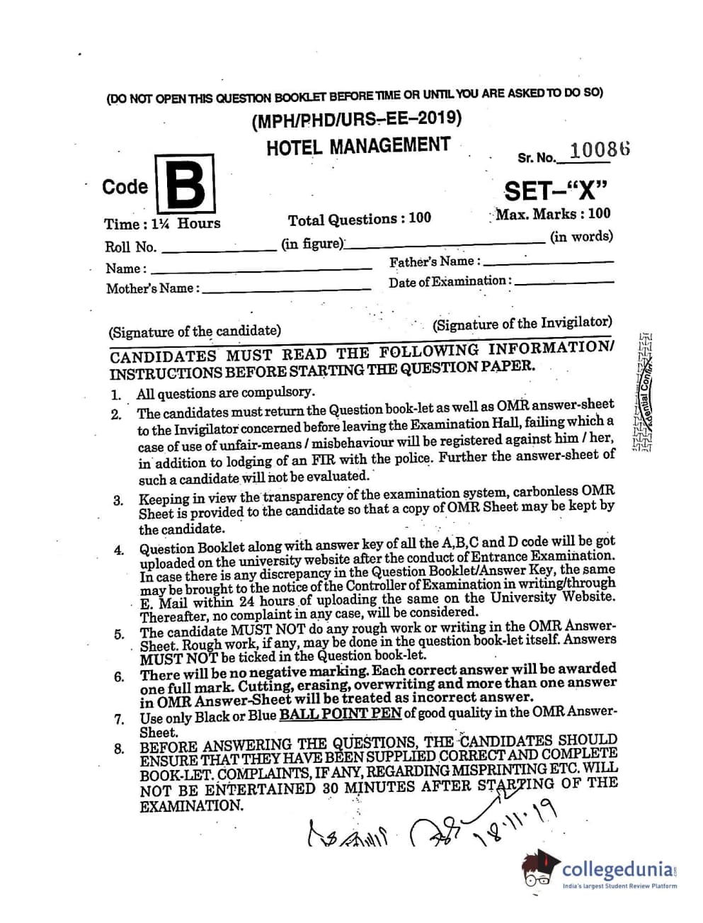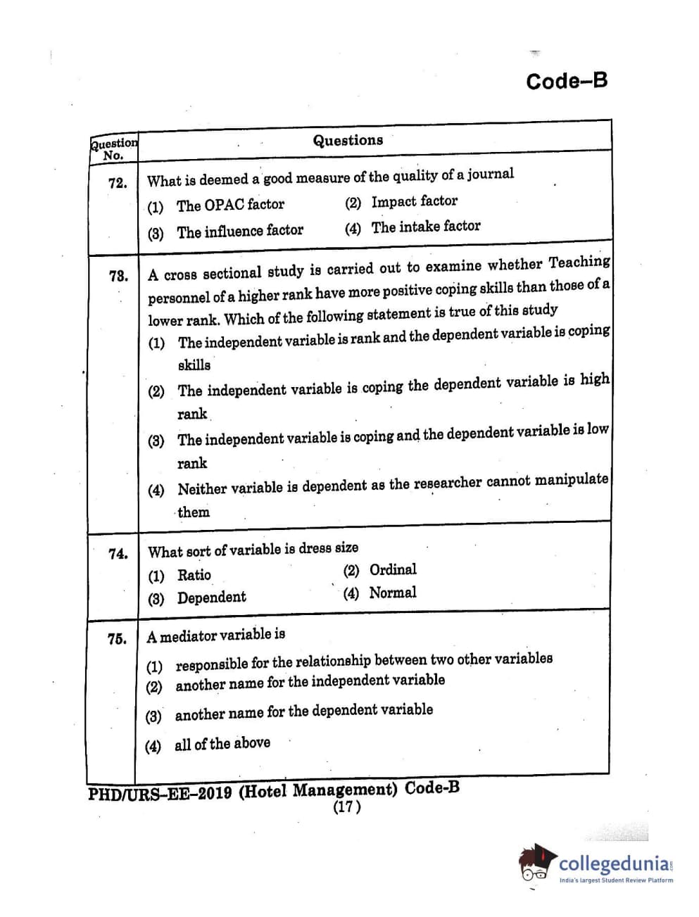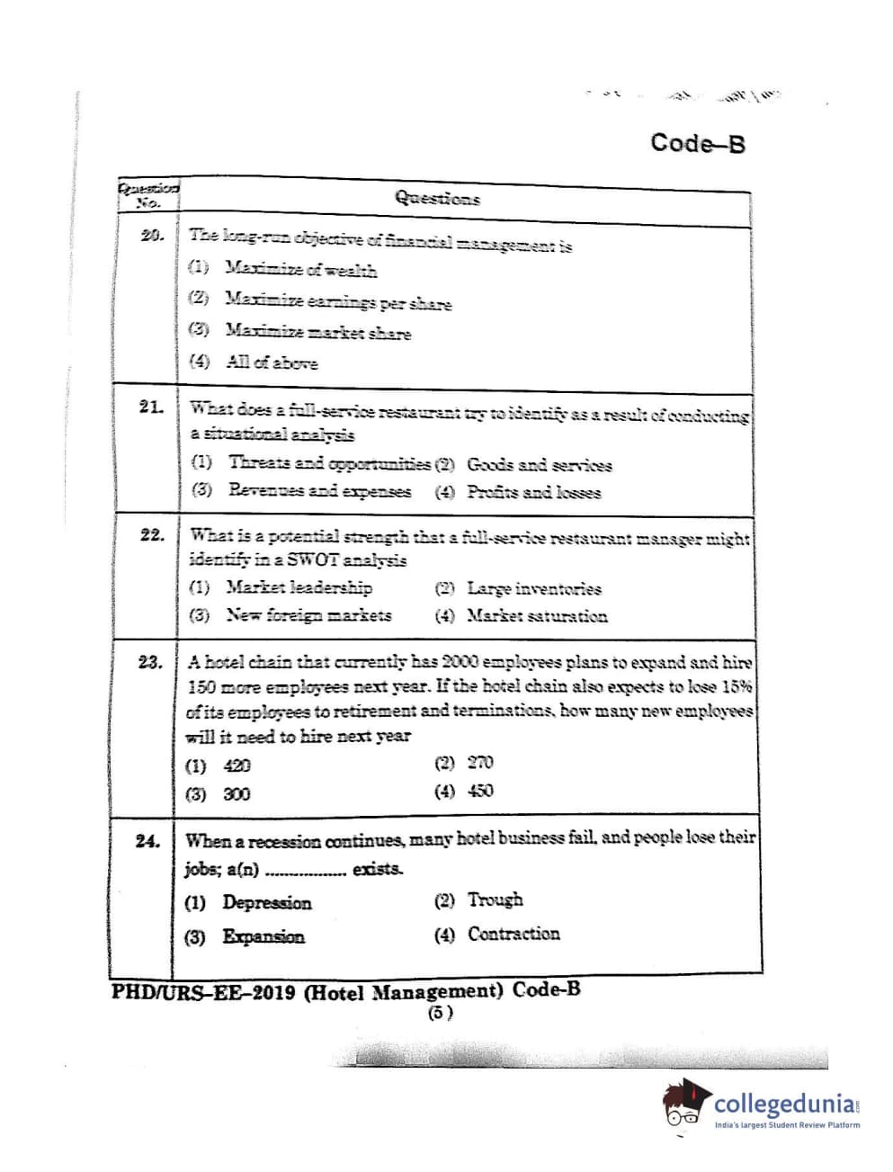 MDUCEE 2019 Ph.D./M.Phil./URS Hotel Management Set B Question Paper with Answer Key PDFs