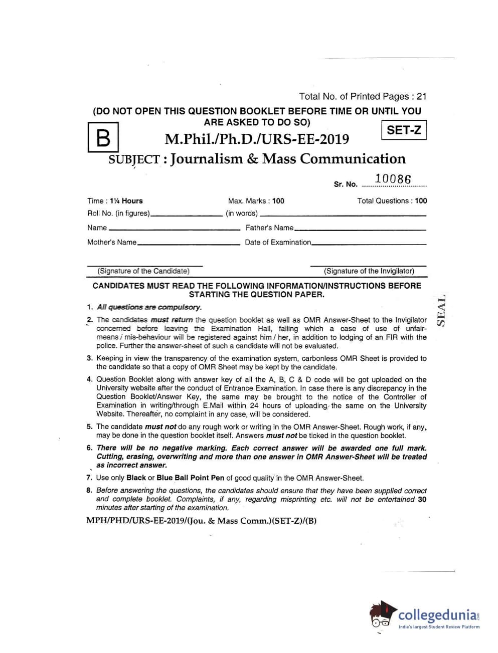 MDUCEE 2019 Ph.D./M.Phil./URS Journalism and Mass Communication Set B Question paper with answer key pdf is available for download. The exam was successfully organized by Maharishi Dayanand University. The question paper comprised a total of 100 questions.