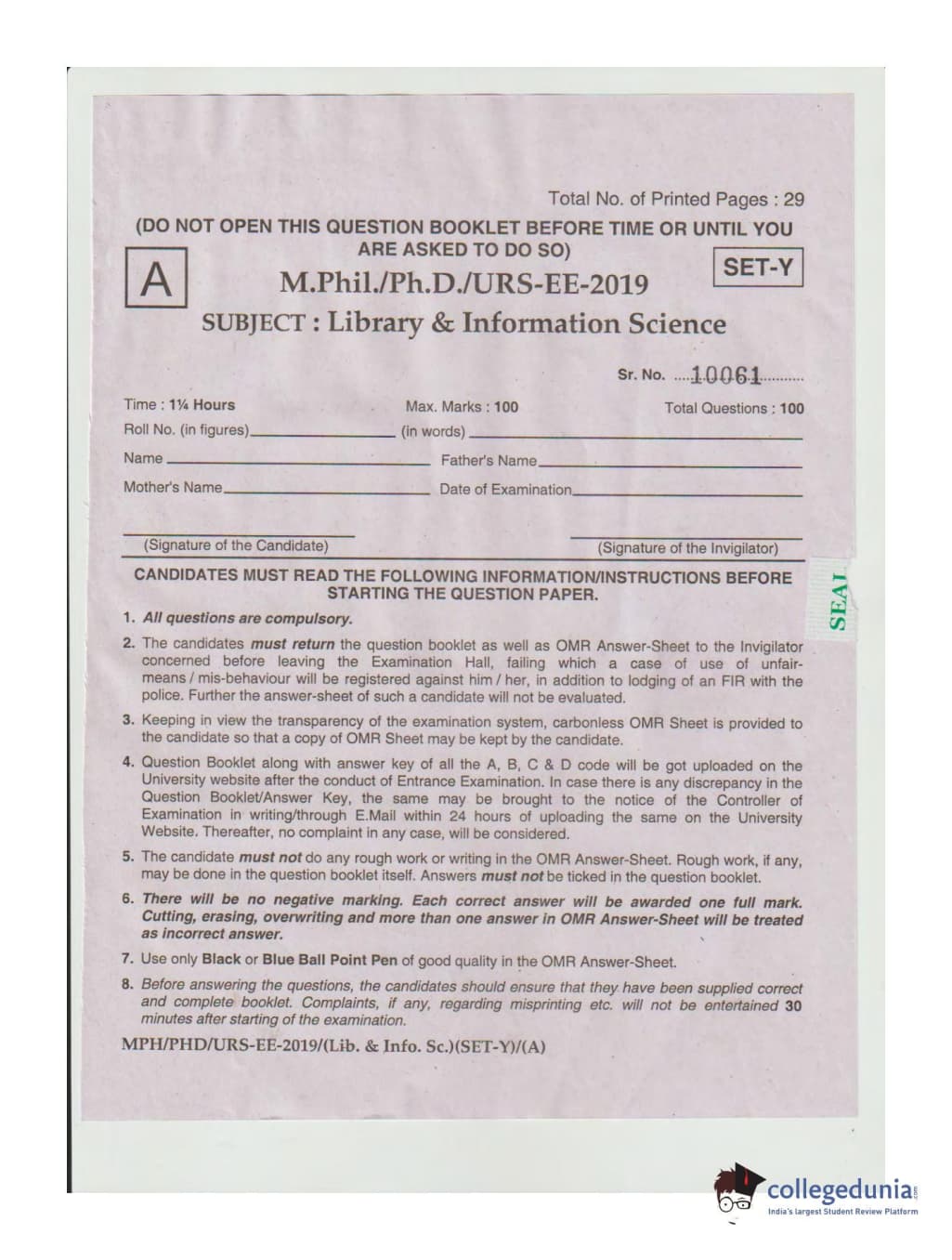 | MDUCEE 2019 Ph.D./M.Phil./URS Library and Information Sciences Set A Question Paper PDF | MDUCEE 2019 Ph.D./M.Phil./URS Library and Information Sciences Set A Answer Key PDF |