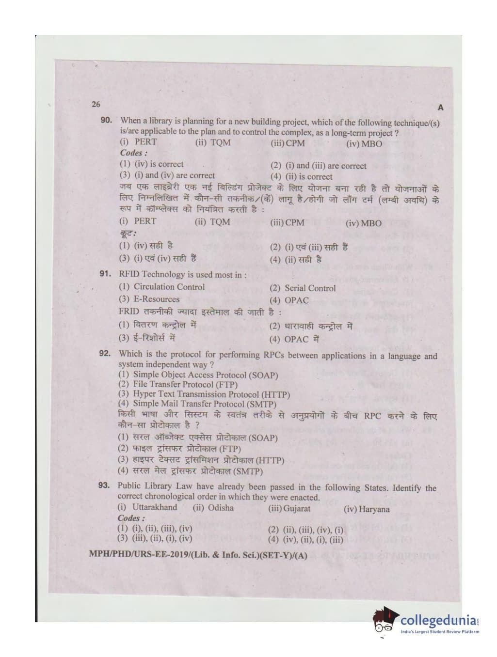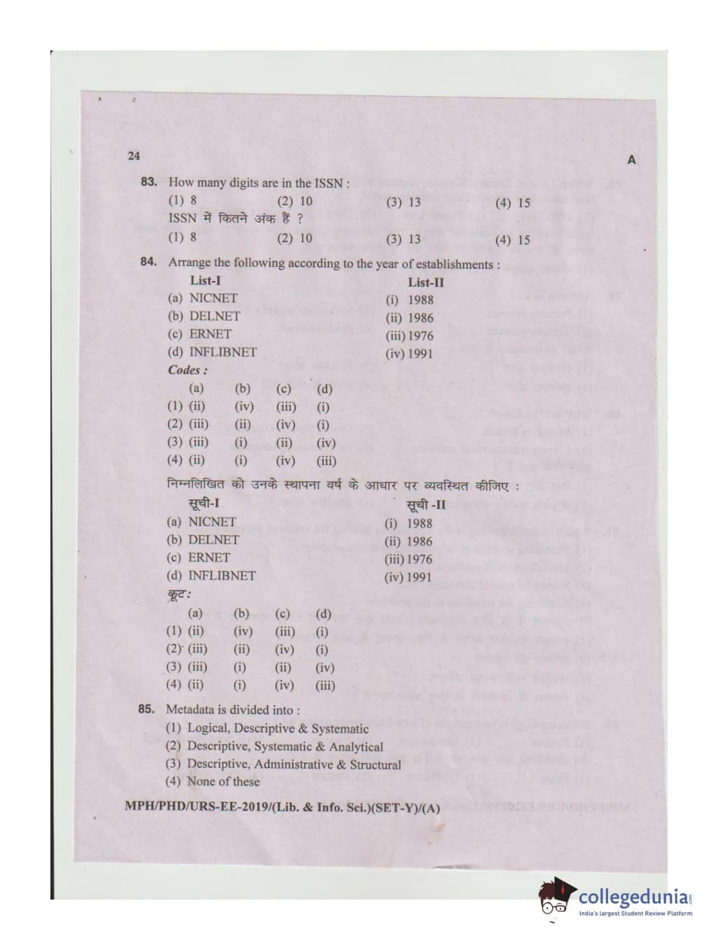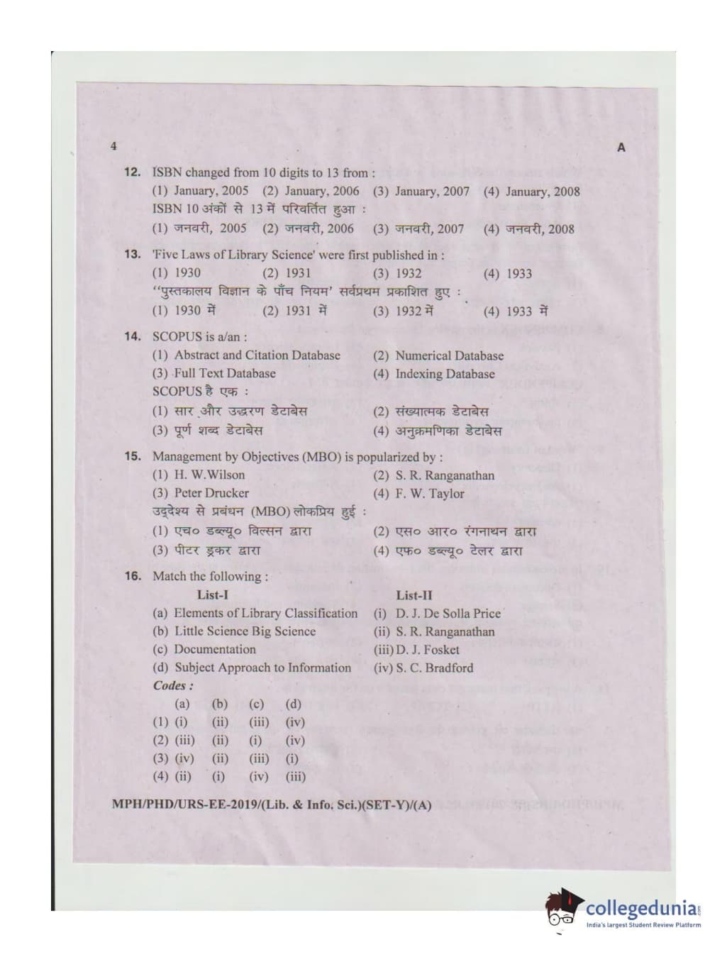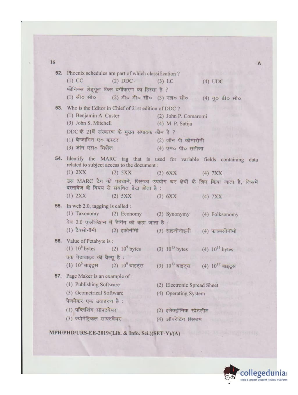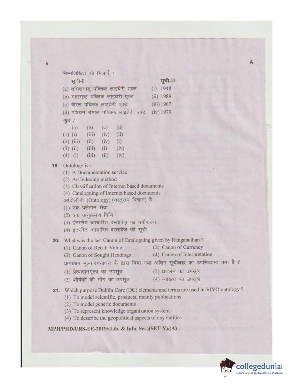 MDUCEE 2019 Ph.D./M.Phil./URS Library and Information Sciences Set A Question Paper with Answer Key PDFs