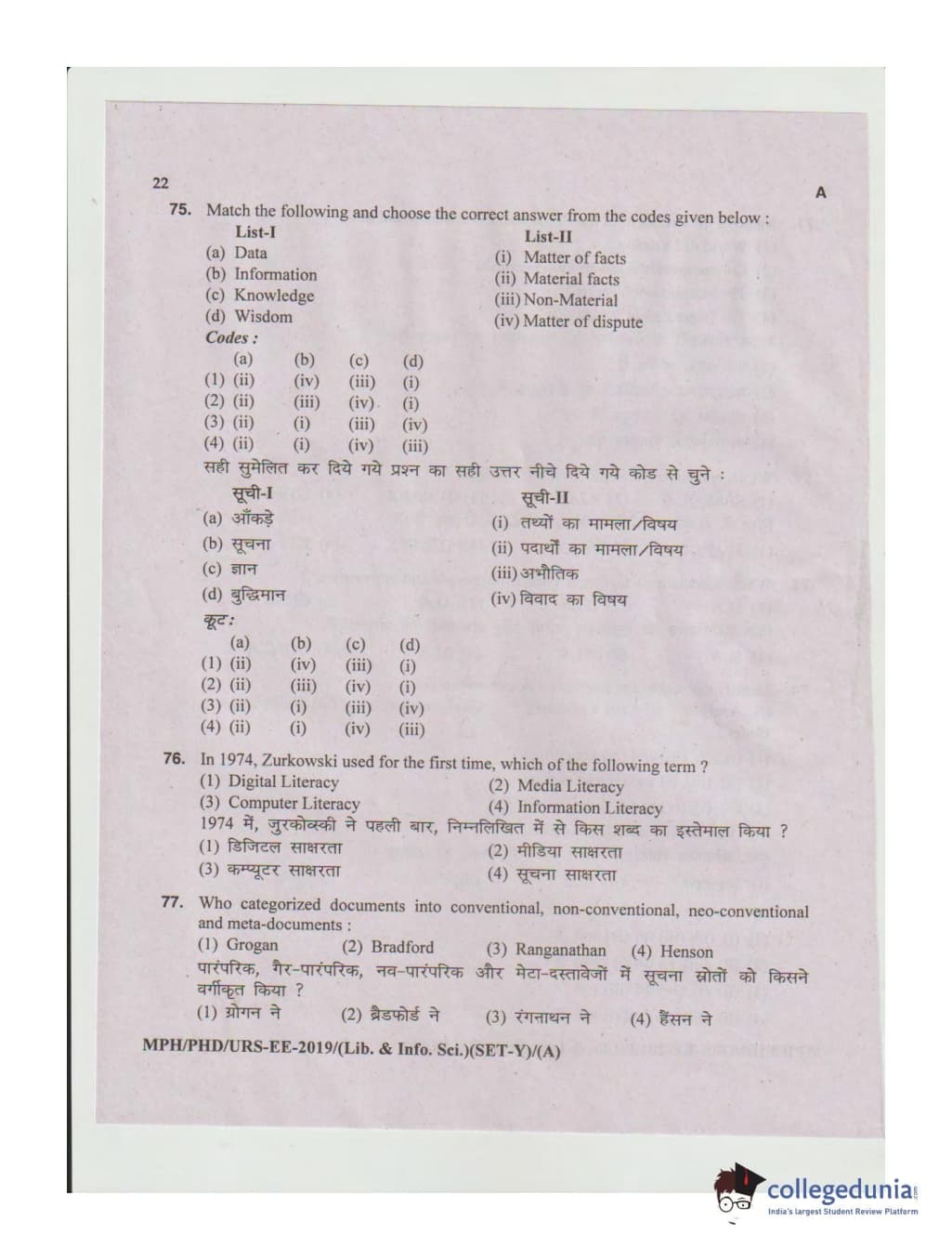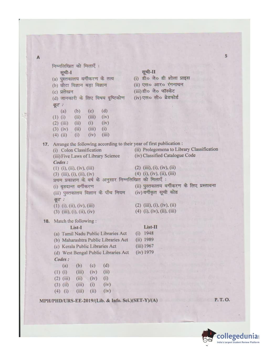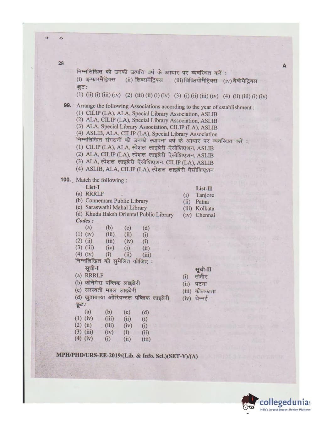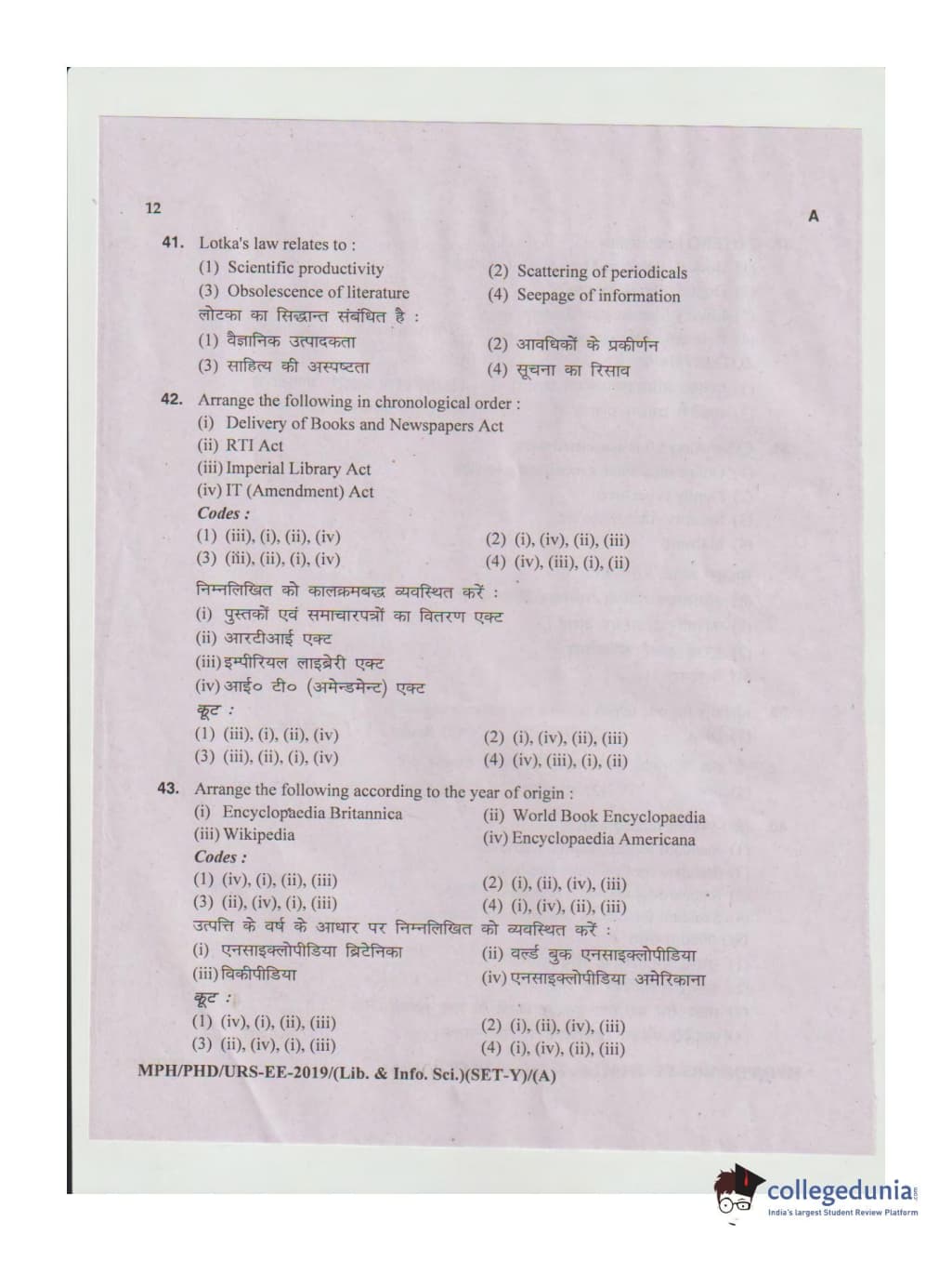MDUCEE 2019 Ph.D./M.Phil./URS Library and Information Sciences Set A Question Paper with Answer Key PDFs