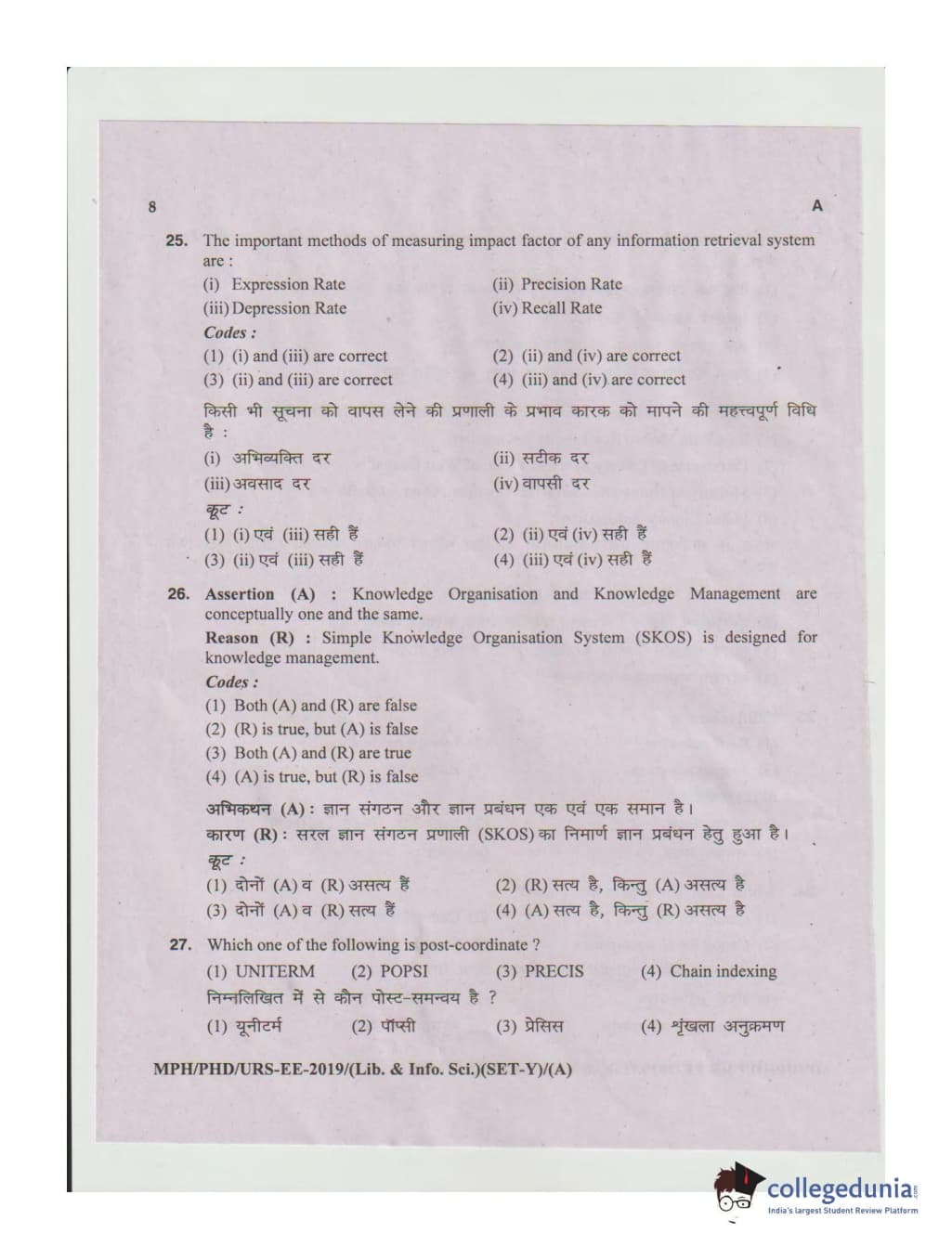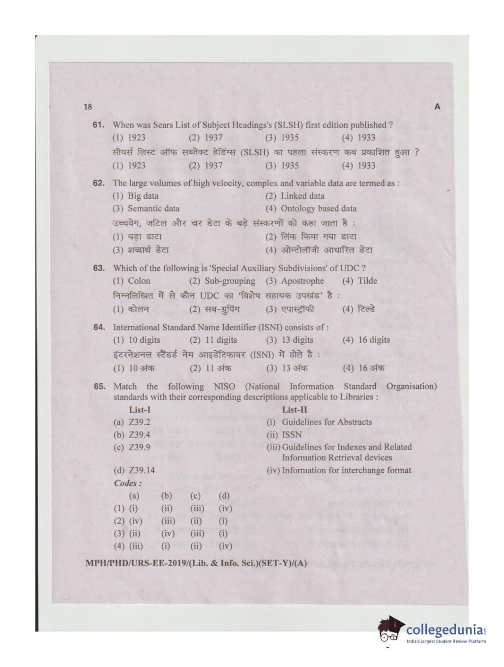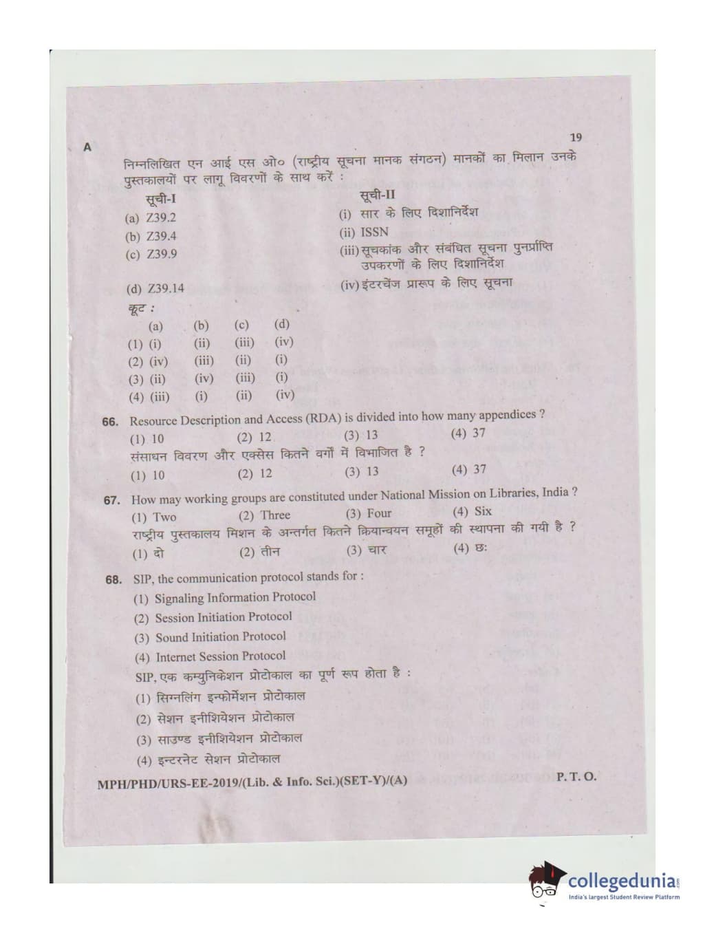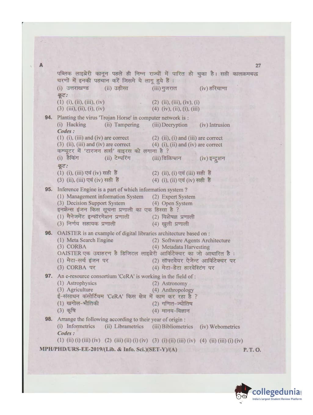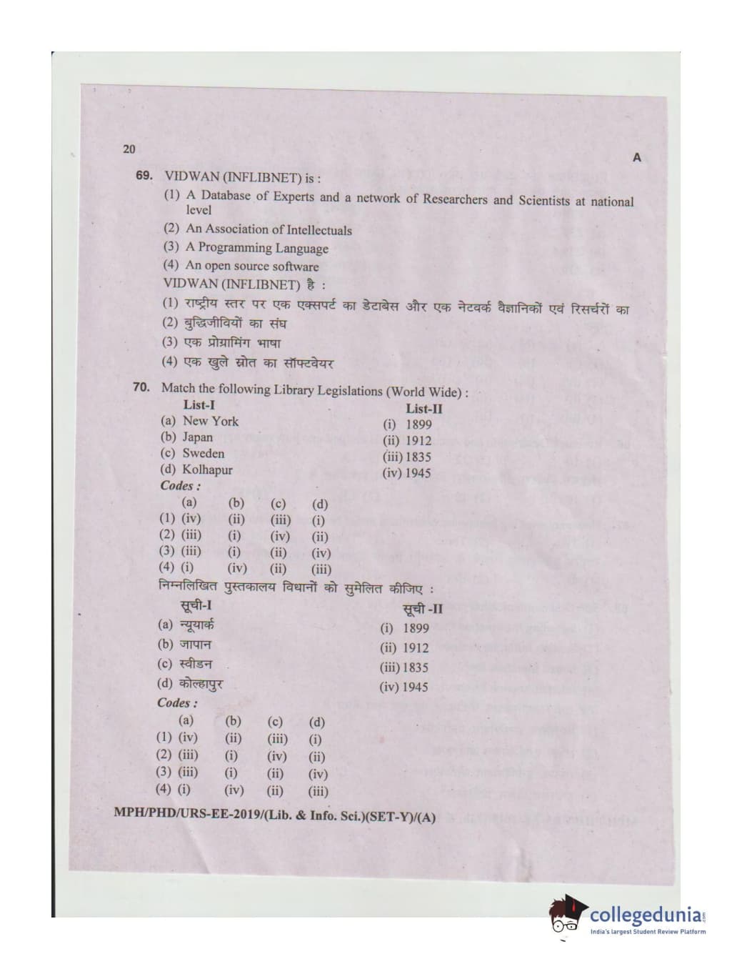 MDUCEE 2019 Ph.D./M.Phil./URS Library and Information Sciences Set A Question Paper with Answer Key PDFs