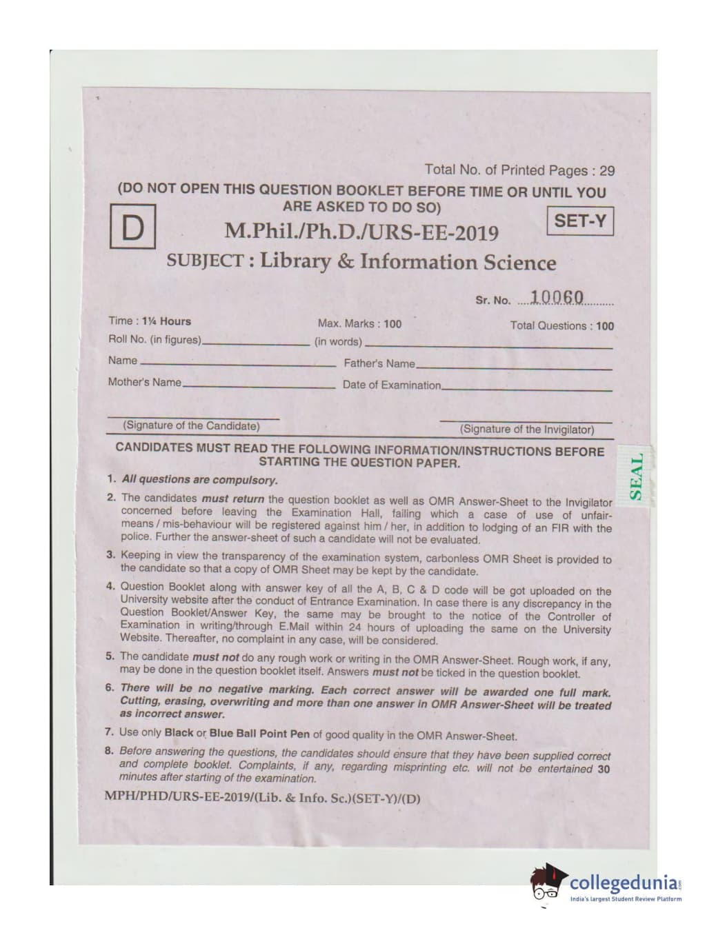 MDUCEE 2019 Ph.D./M.Phil./URS Library and Information Sciences Set D Question paper with answer key pdf is available for download. The exam was successfully organized by Maharishi Dayanand University. The question paper comprised a total of 100 questions.