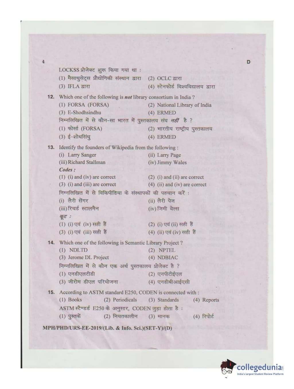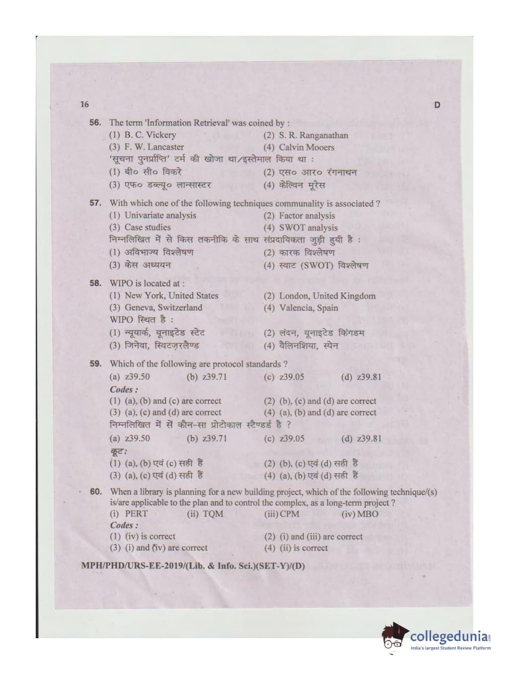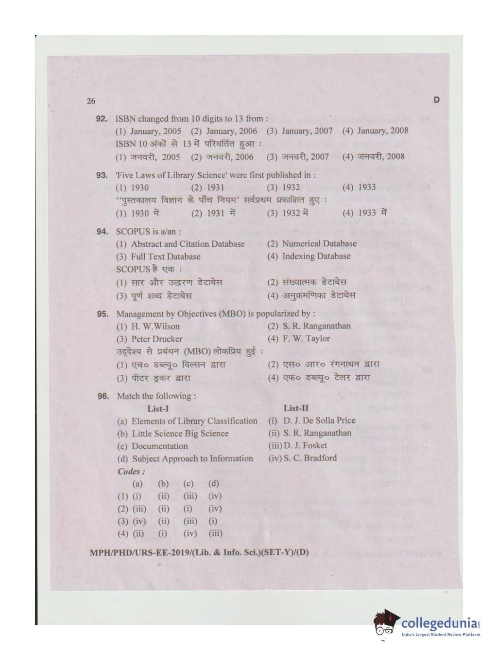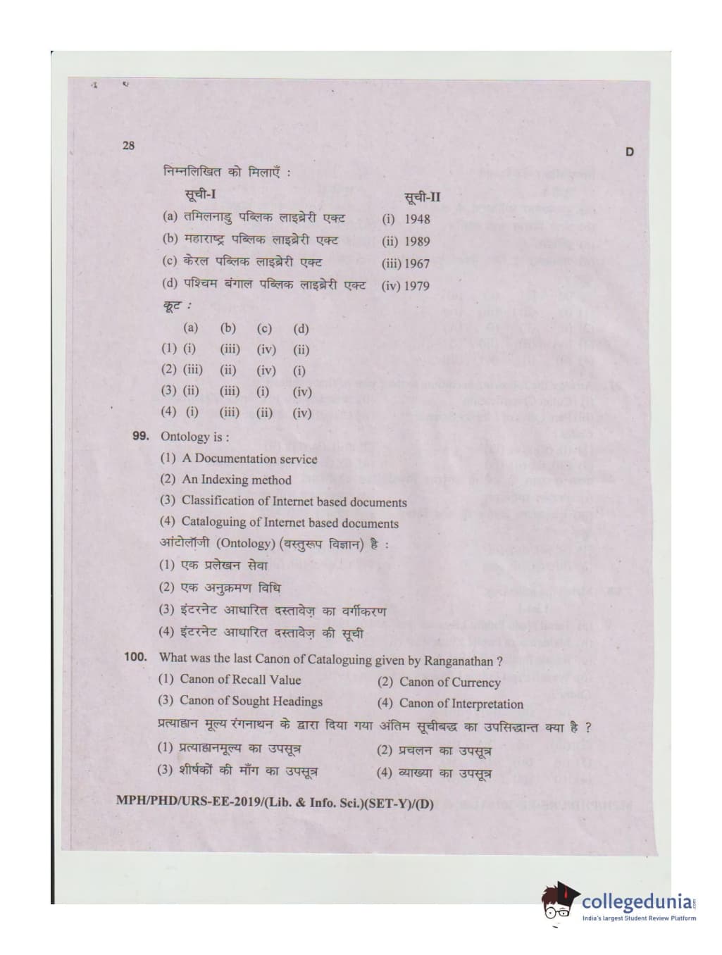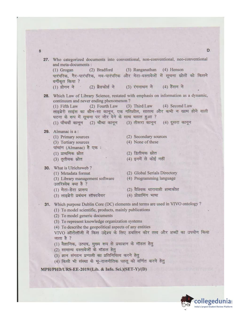MDUCEE 2019 Ph.D./M.Phil./URS Library and Information Sciences Set D Question Paper with Answer Key PDFs