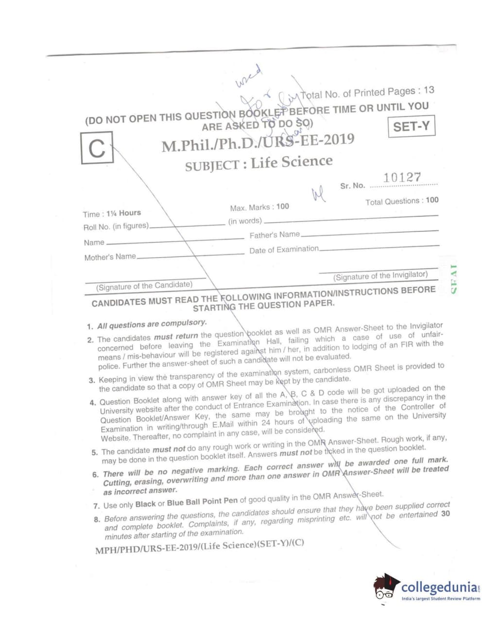 | MDUCEE 2019 Ph.D./M.Phil./URS Life Sciences Set C Question Paper PDF | MDUCEE 2019 Ph.D./M.Phil./URS Life Sciences Set C Answer Key PDF |