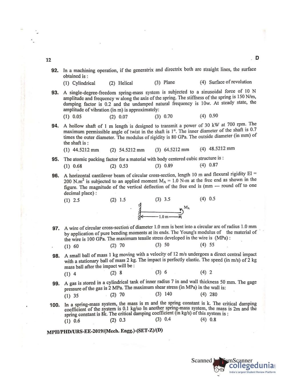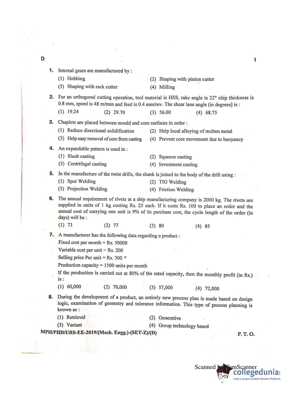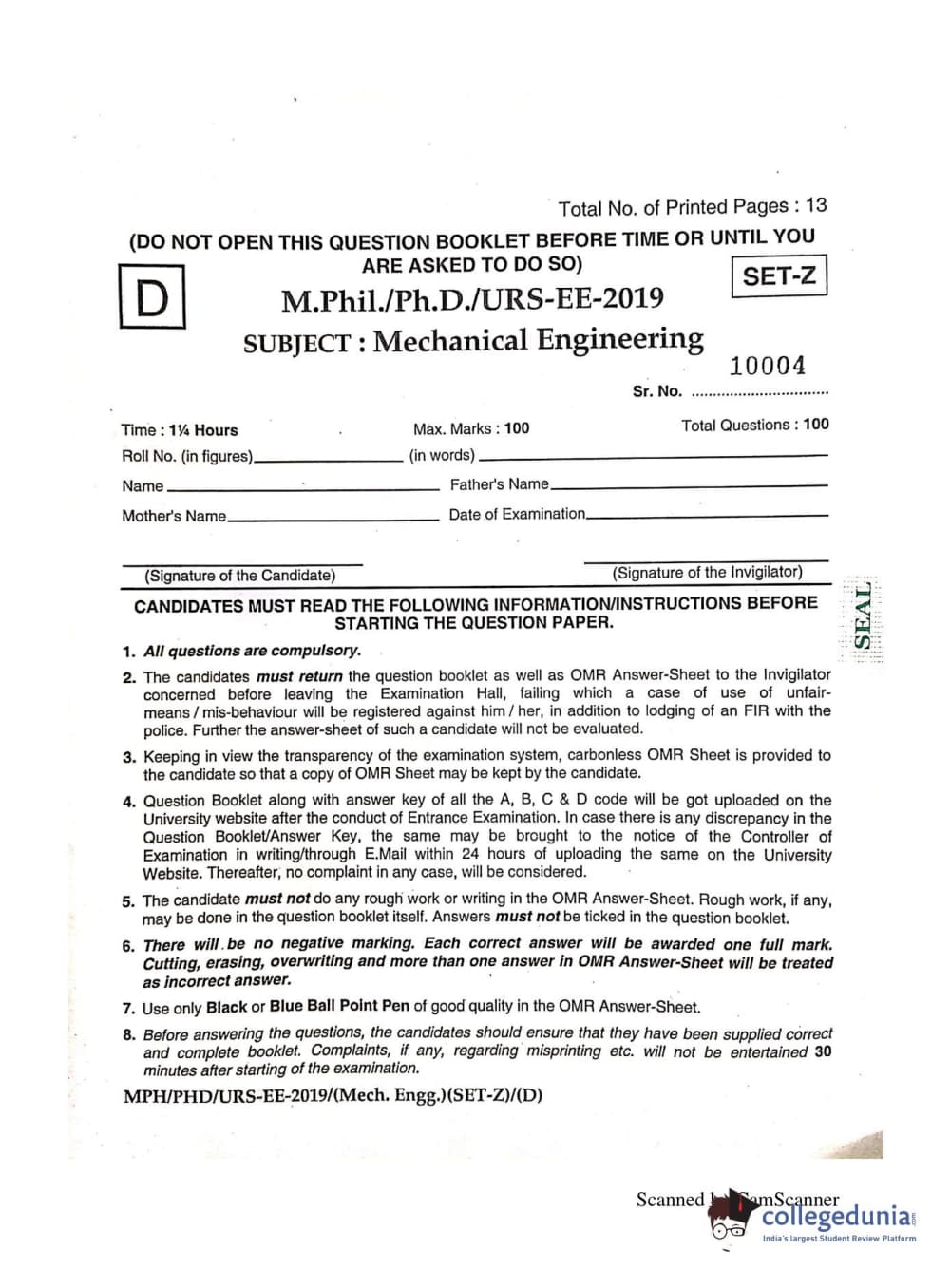 | MDUCEE 2019 Ph.D./M.Phil./URS Mechenical Engineering Set D Question Paper PDF | MDUCEE 2019 Ph.D./M.Phil./URS Mechenical Engineering Set D Answer Key PDF |