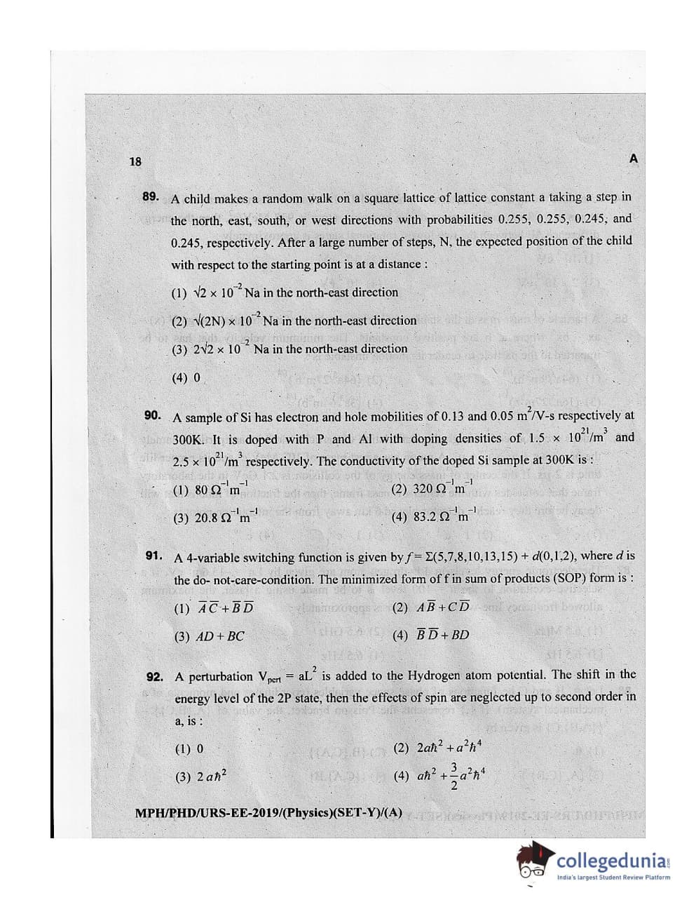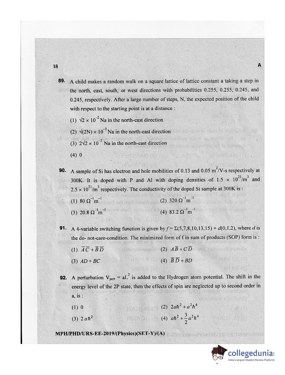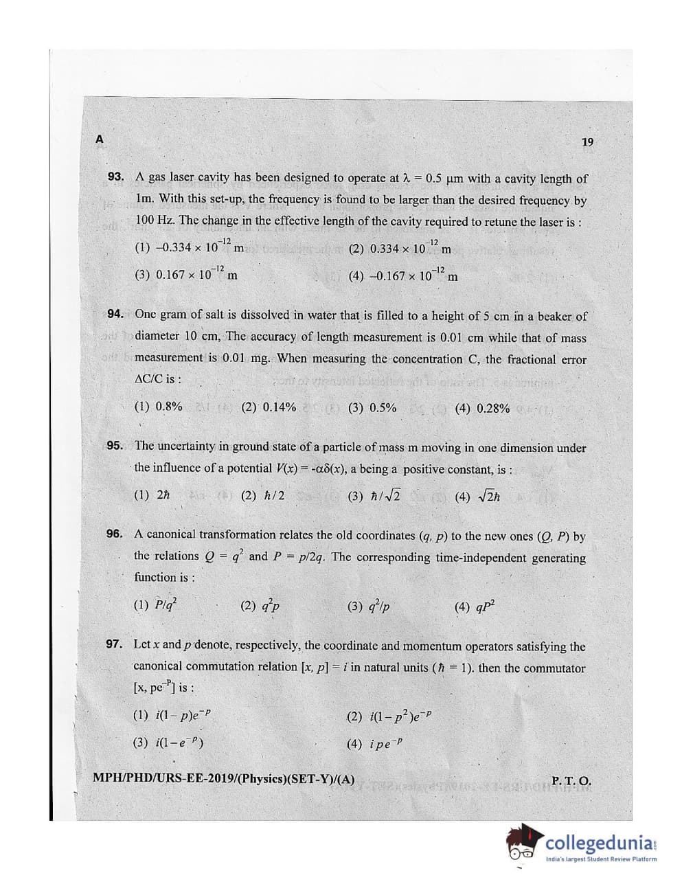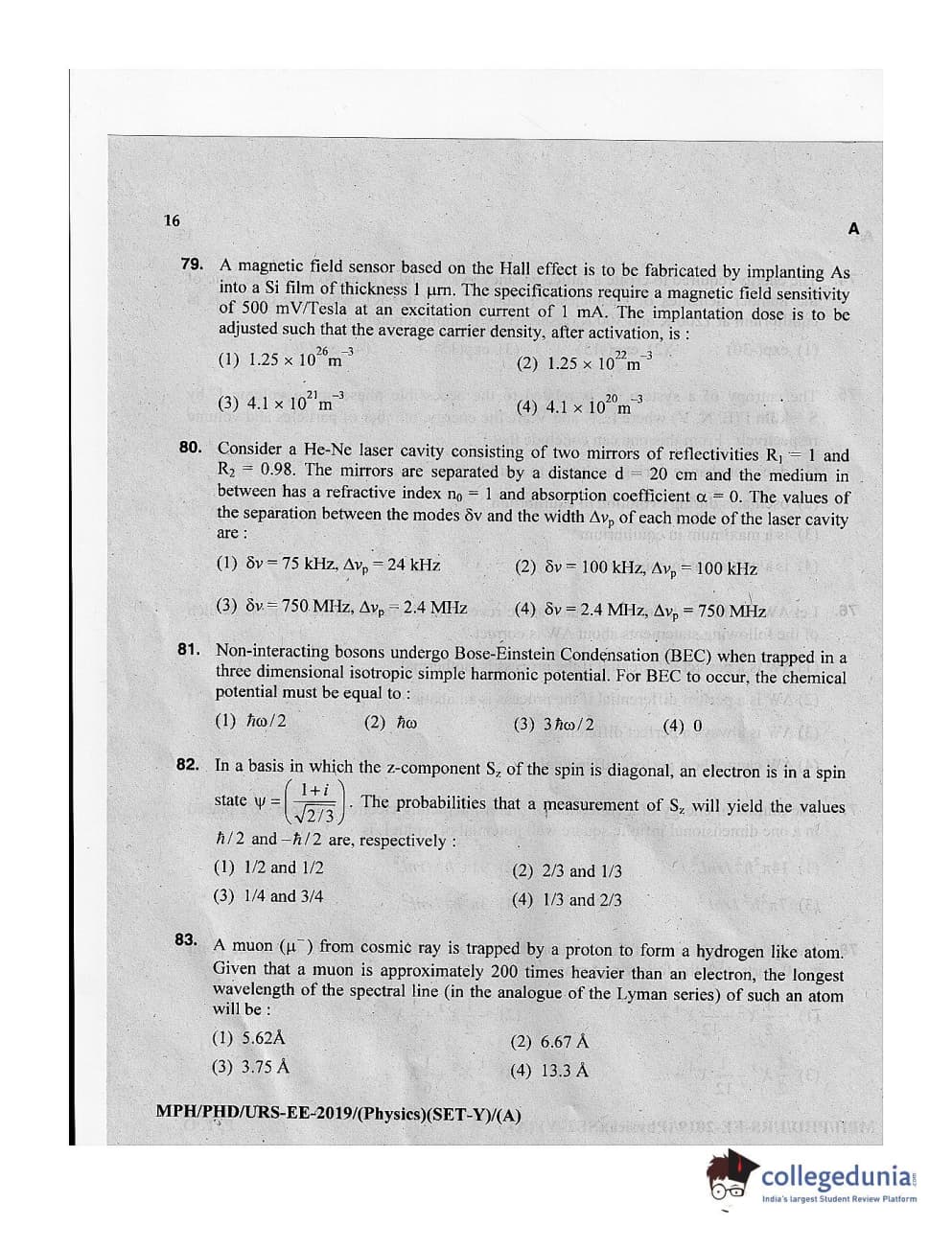 MDUCEE 2019 Ph.D./M.Phil./URS Physics Set A Question Paper with Answer Key PDFs
