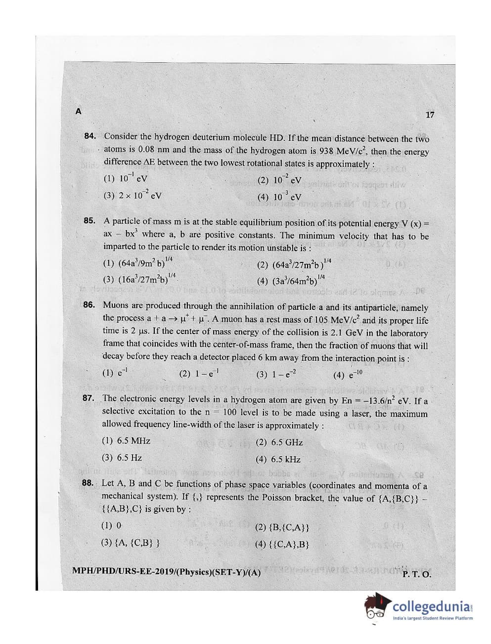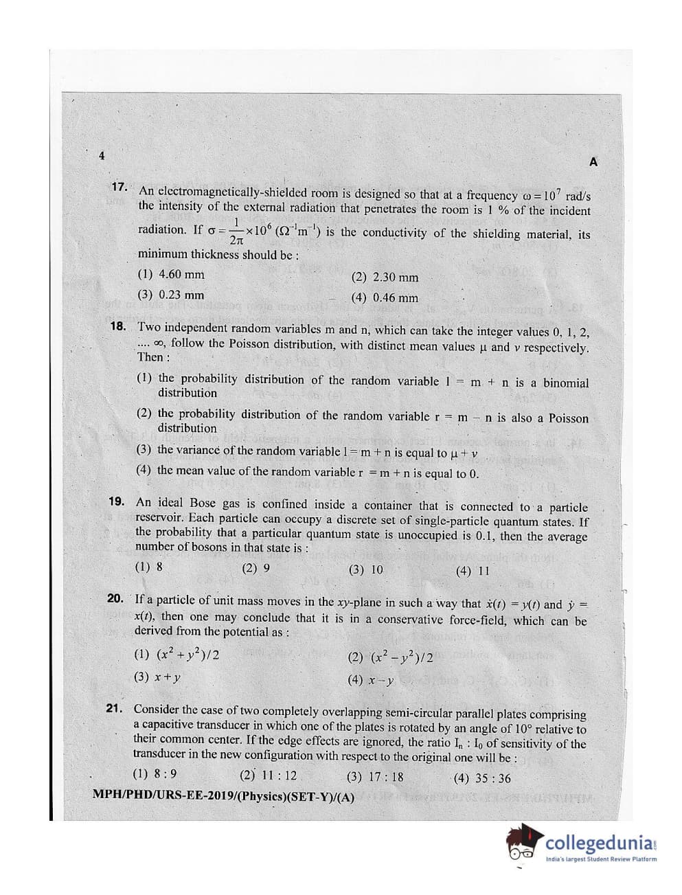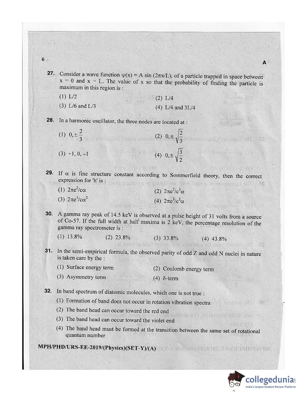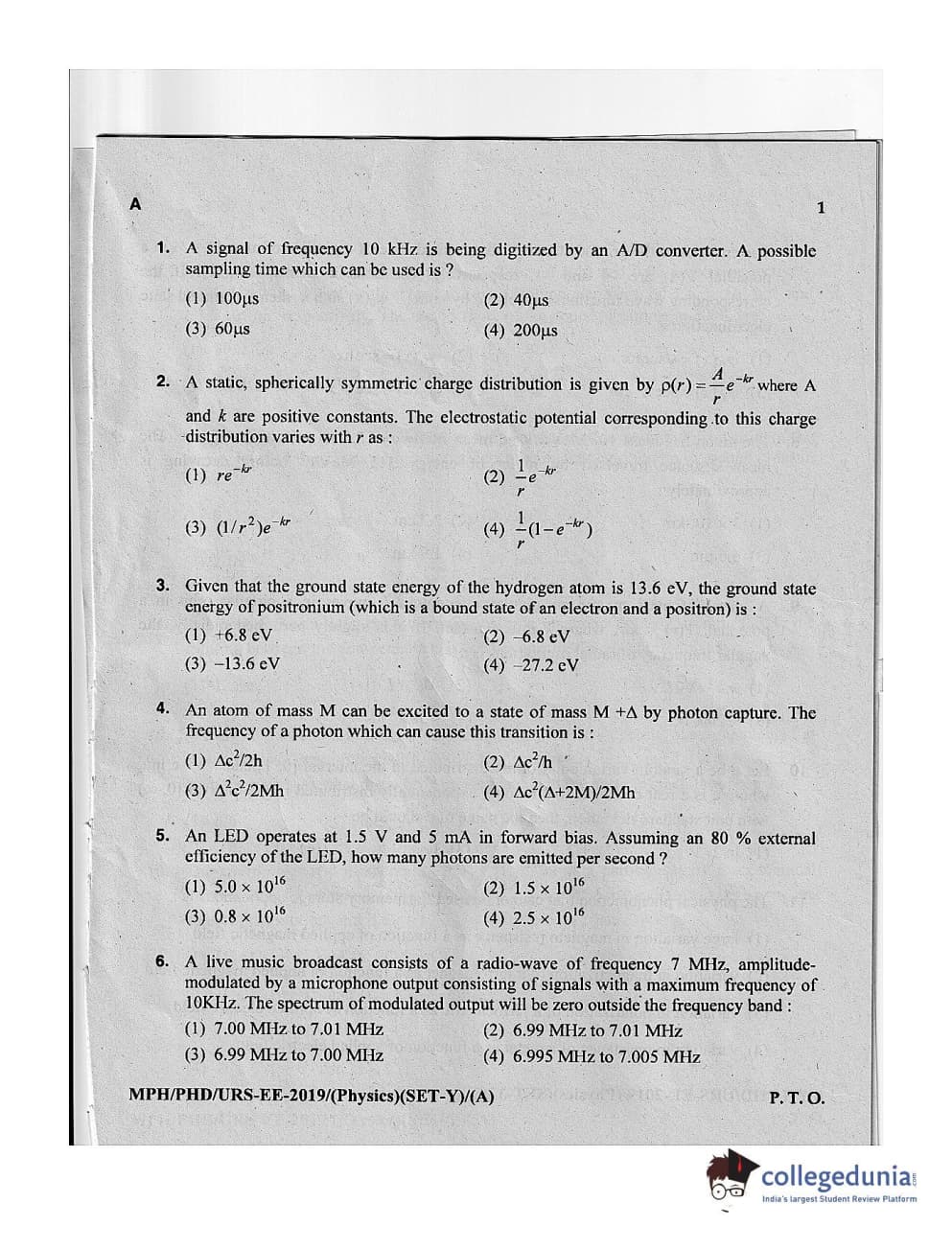 MDUCEE 2019 Ph.D./M.Phil./URS Physics Set A Question Paper with Answer Key PDFs