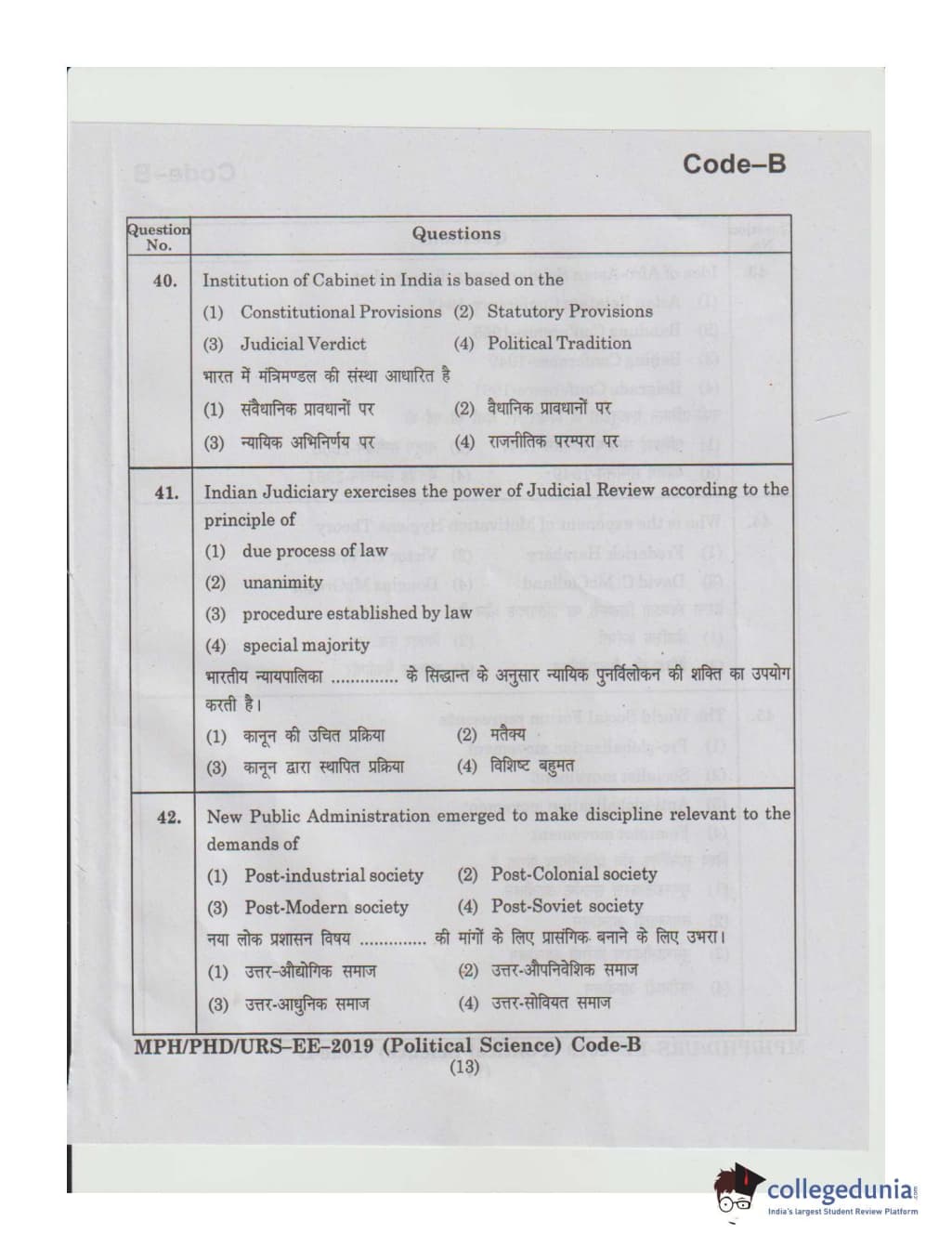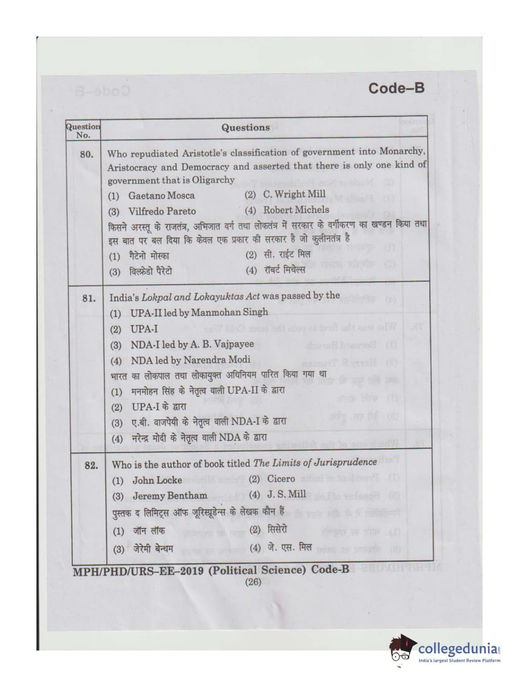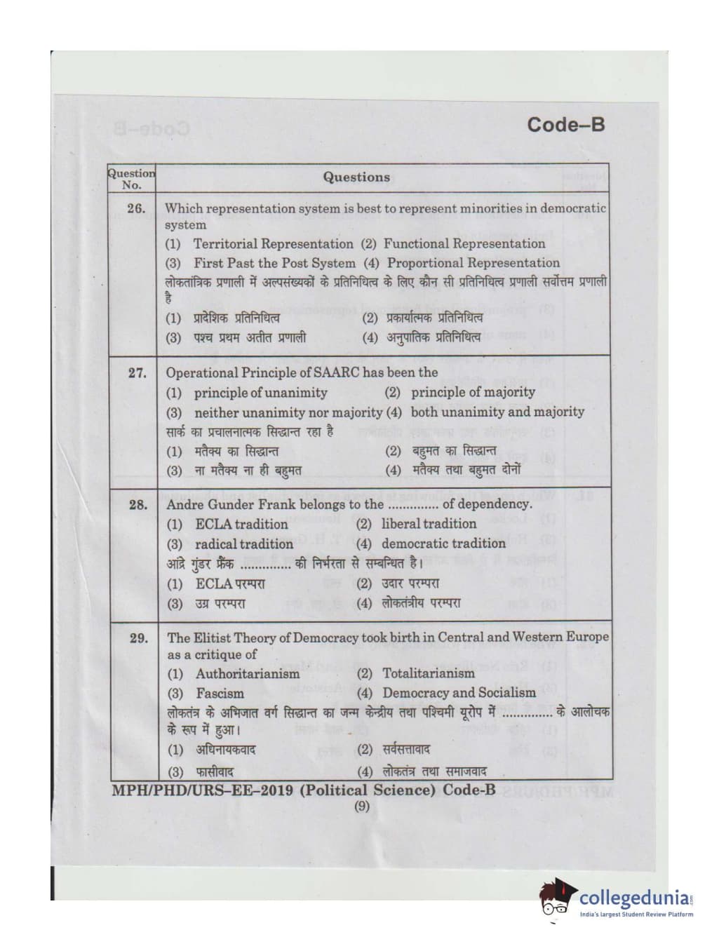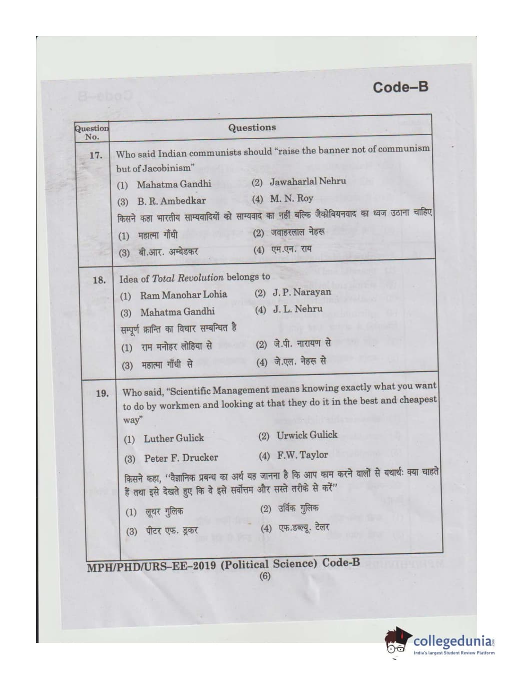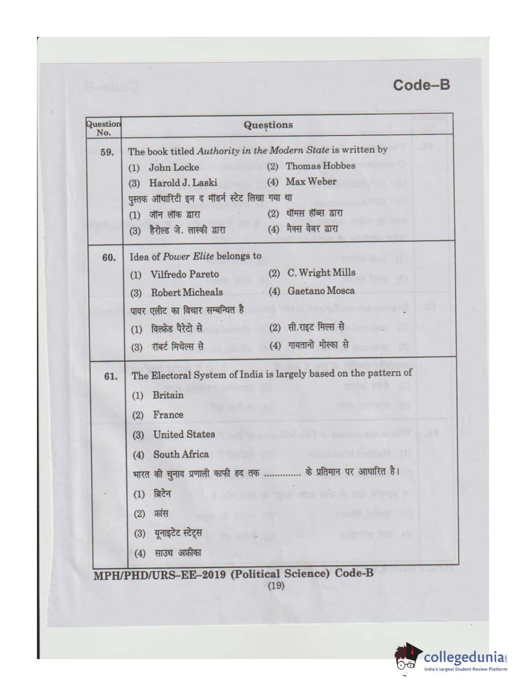 MDUCEE 2019 Ph.D./M.Phil./URS Political Science Set B Question Paper with Answer Key PDFs