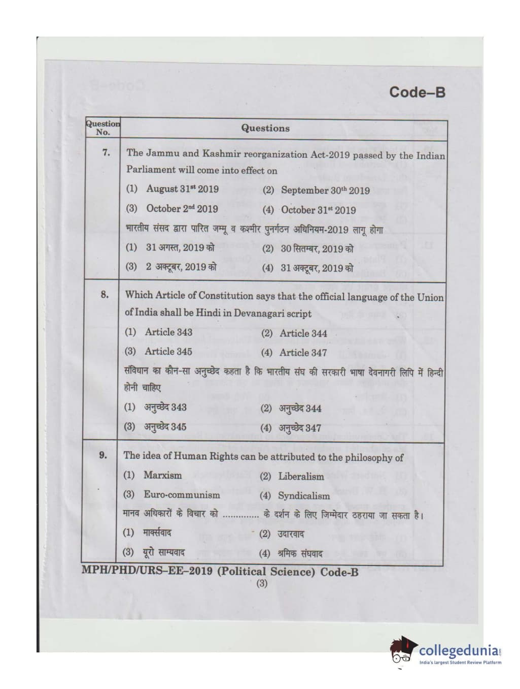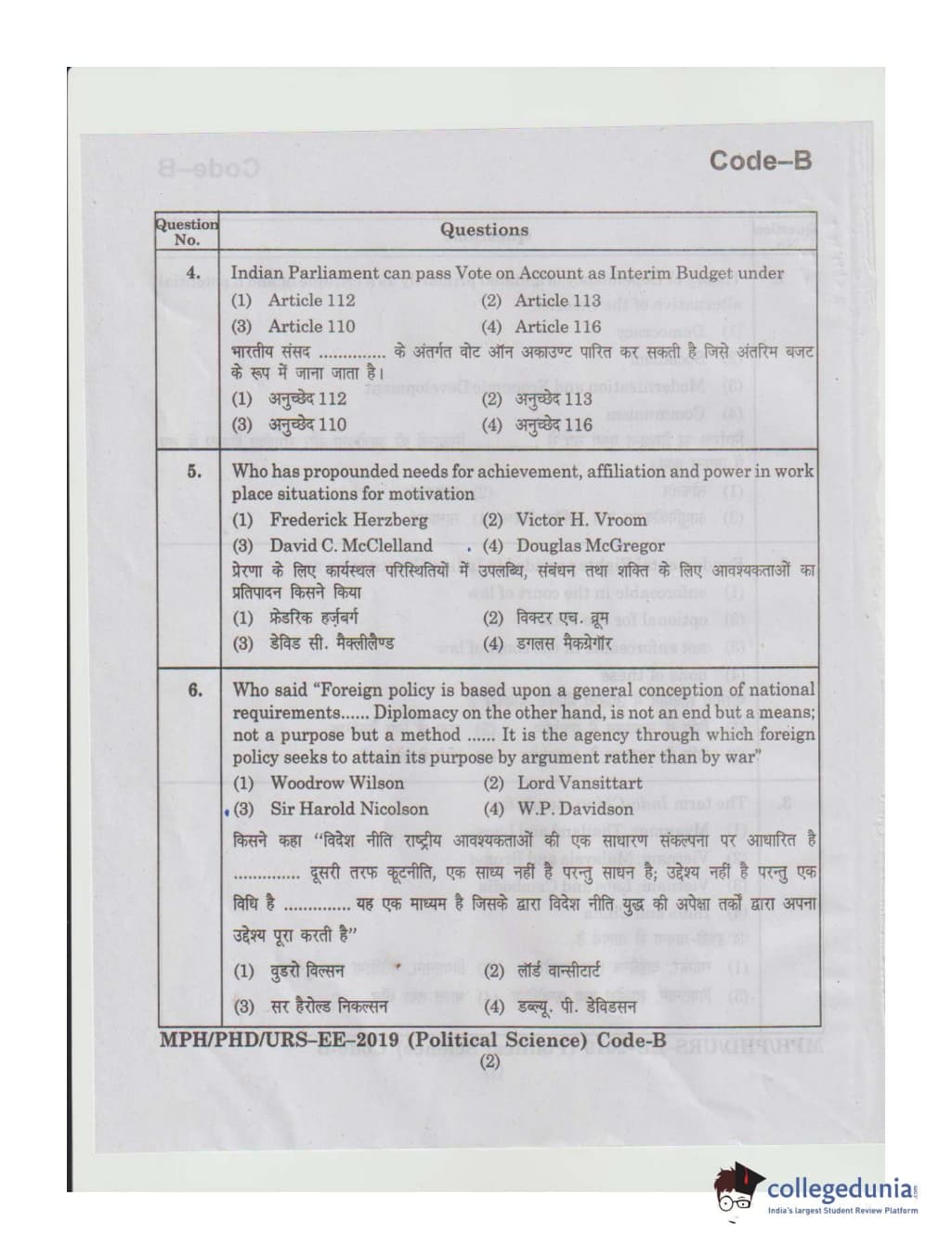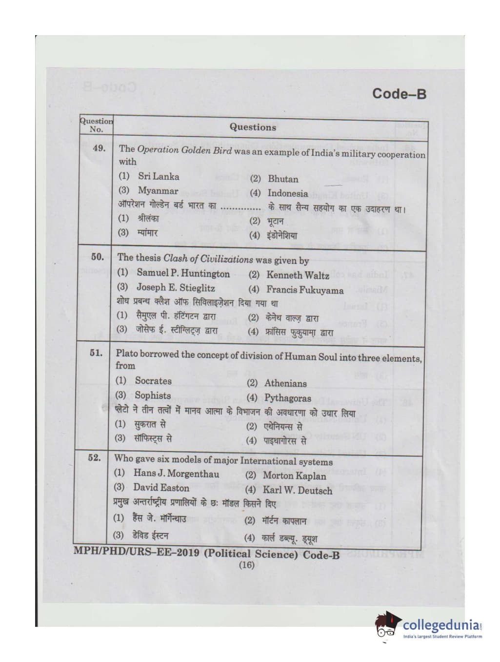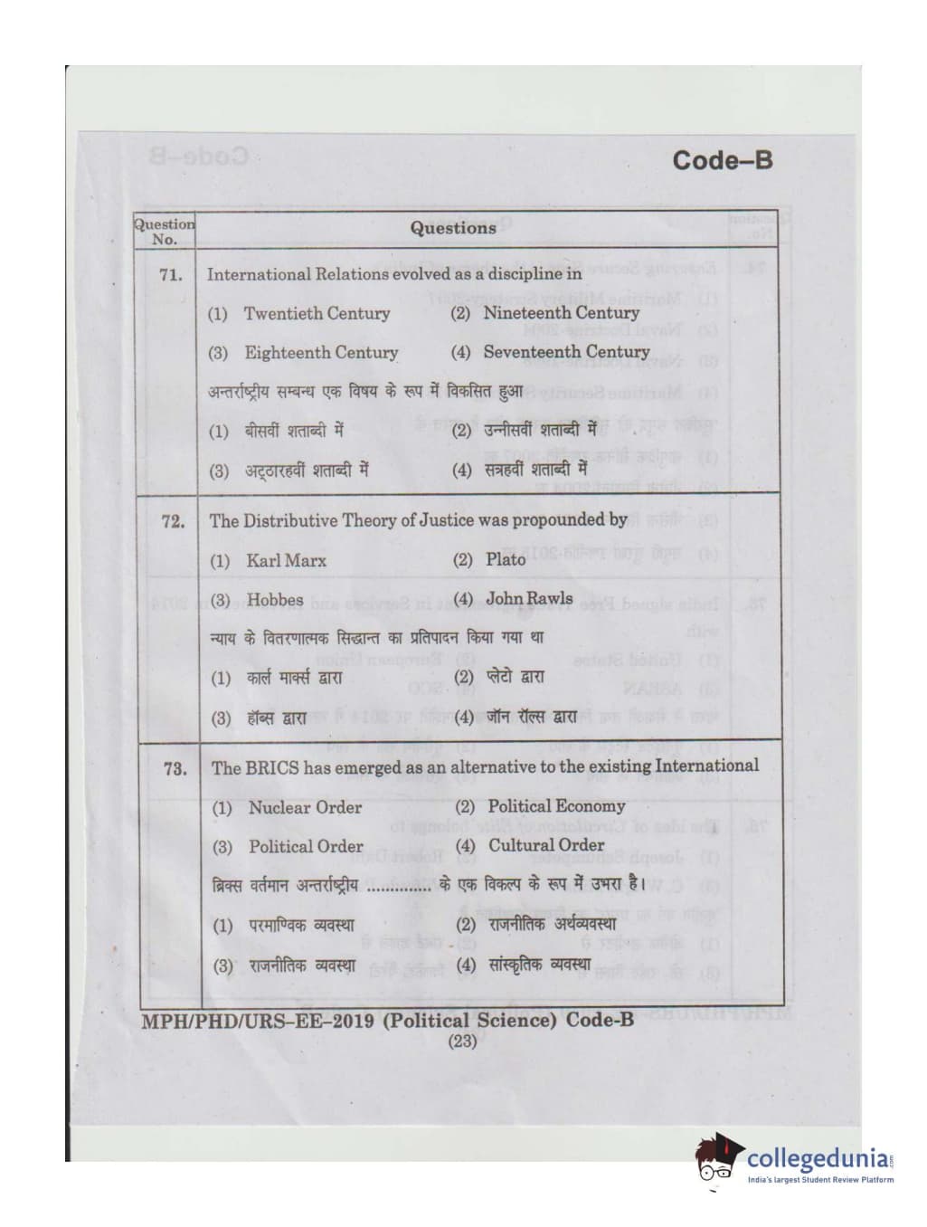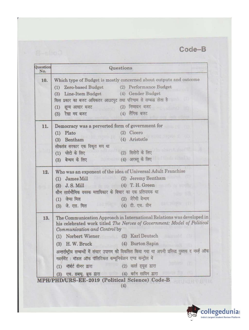 MDUCEE 2019 Ph.D./M.Phil./URS Political Science Set B Question Paper with Answer Key PDFs