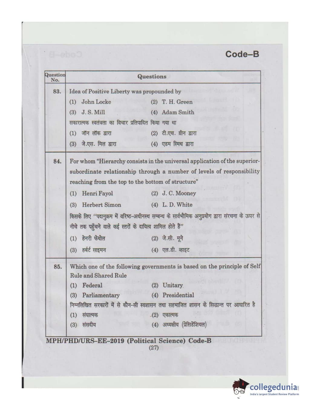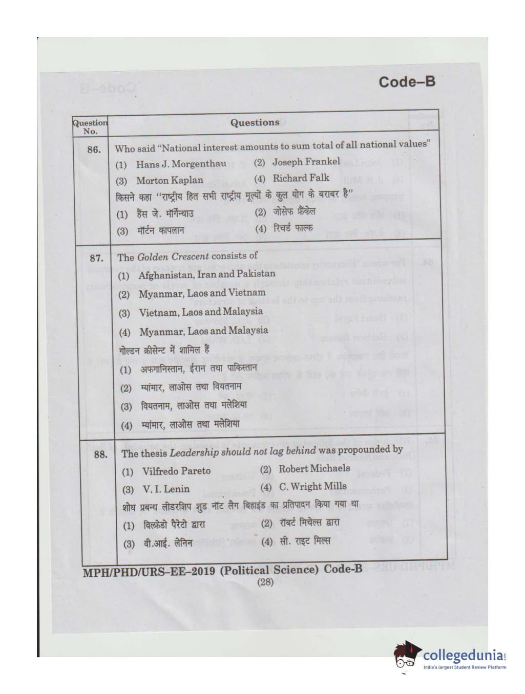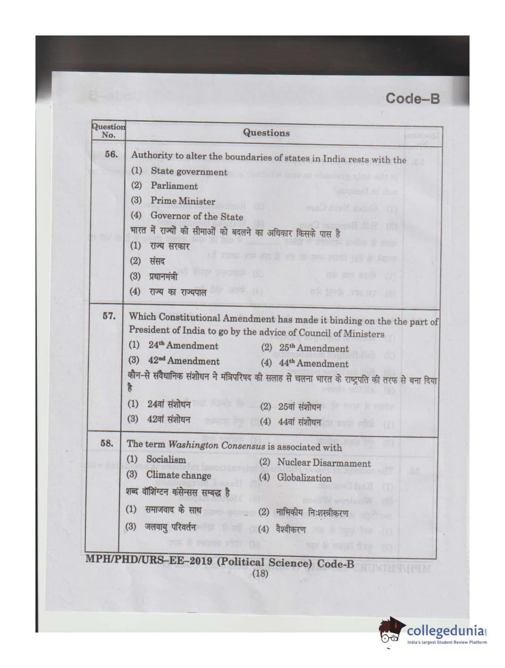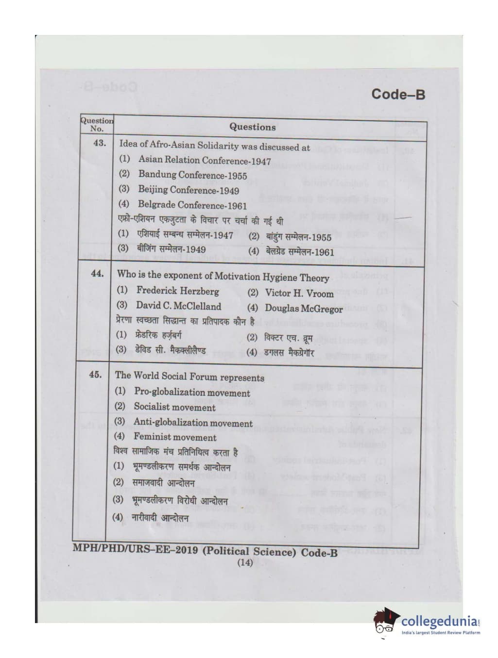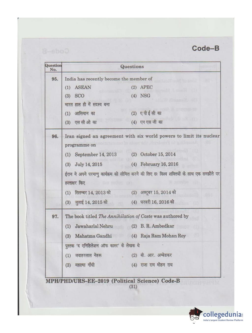 MDUCEE 2019 Ph.D./M.Phil./URS Political Science Set B Question Paper with Answer Key PDFs