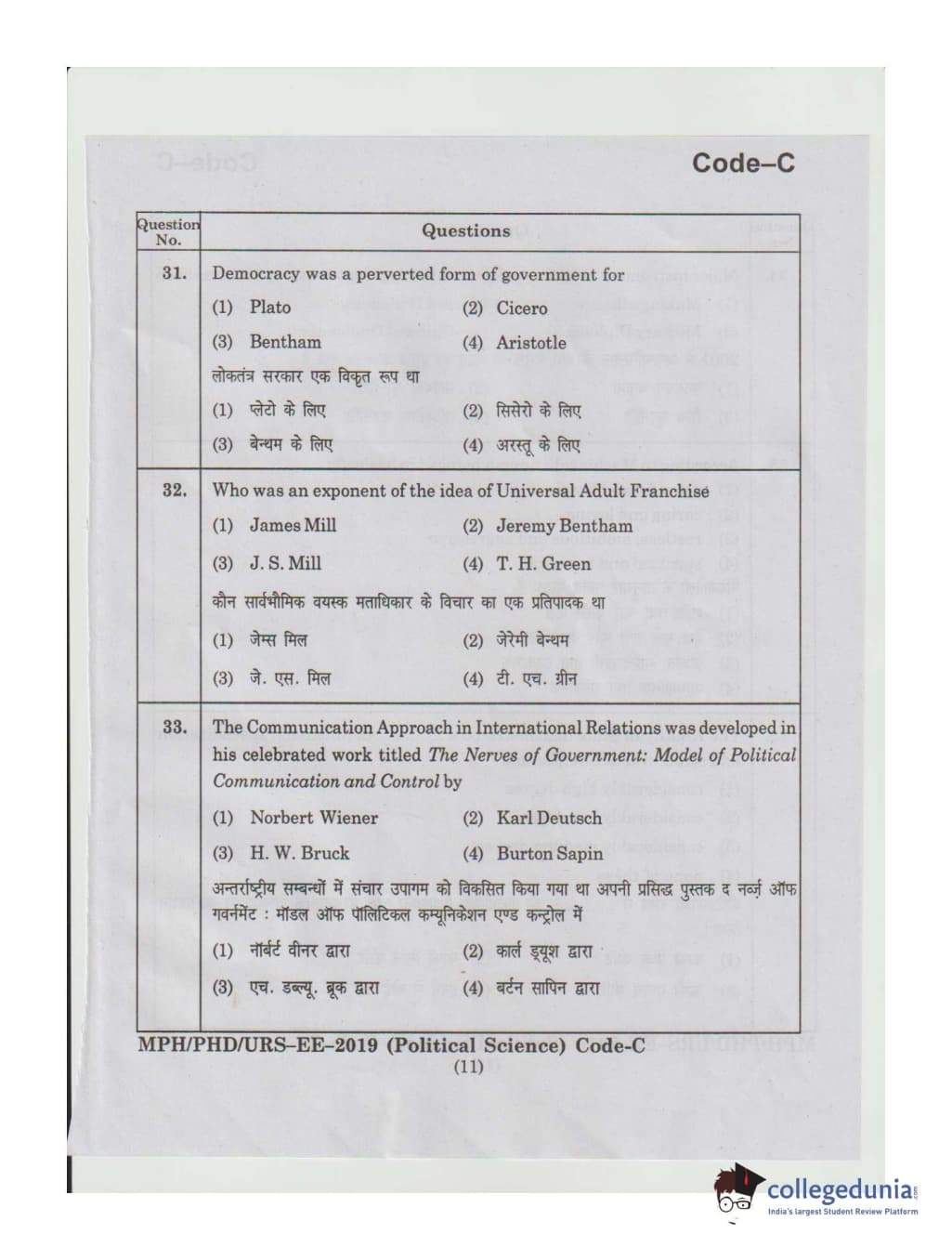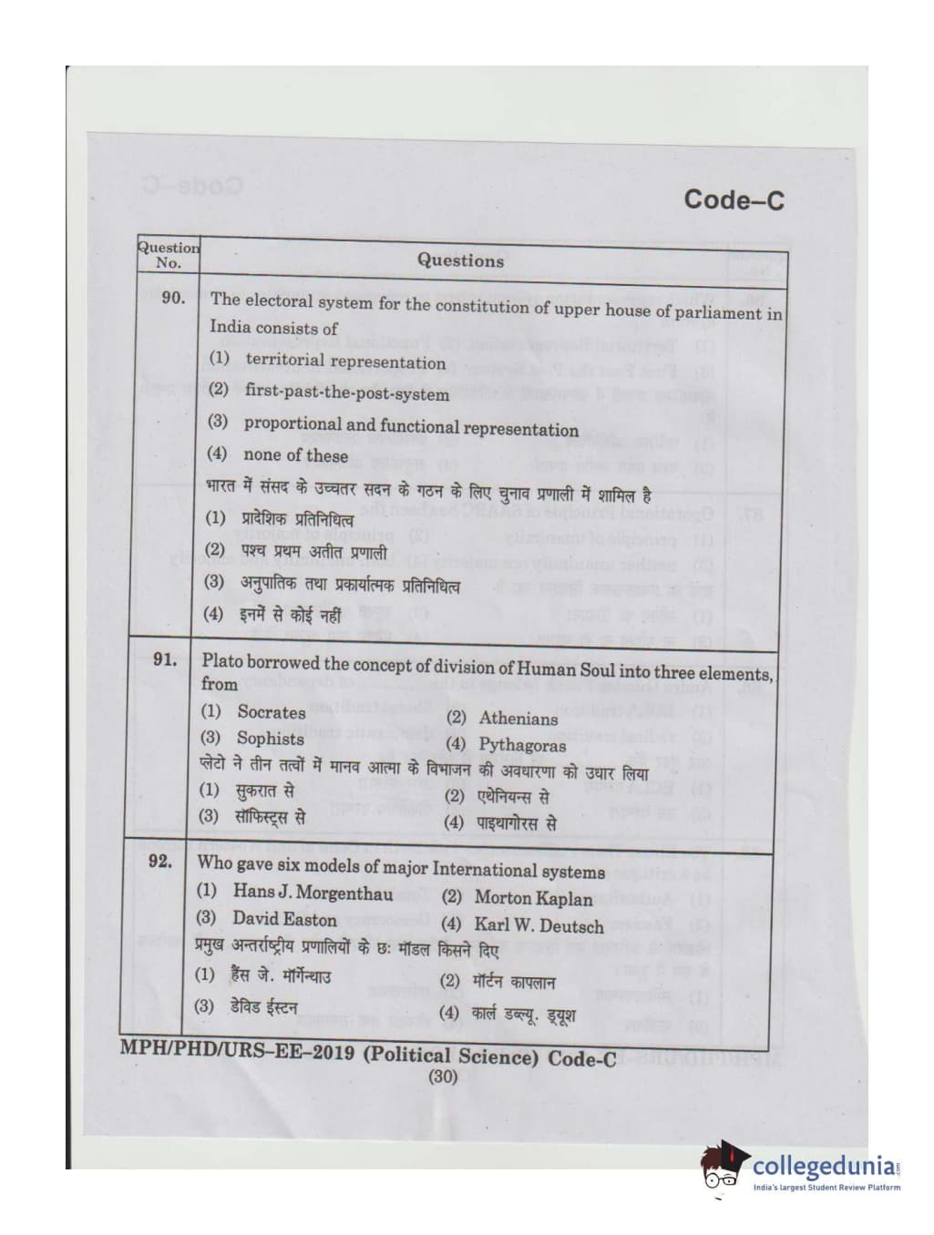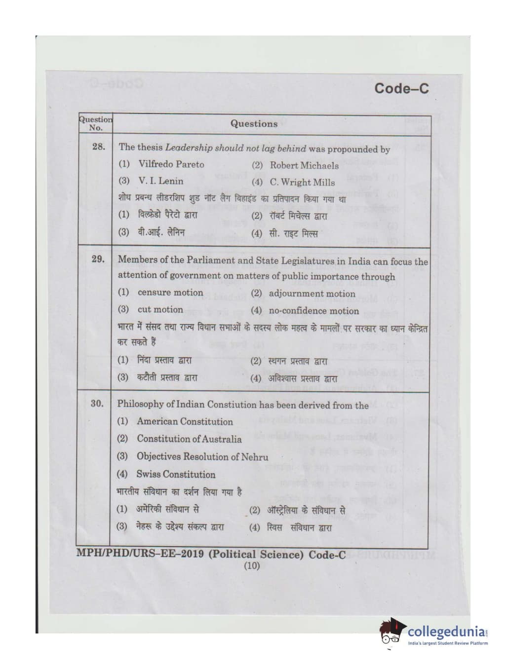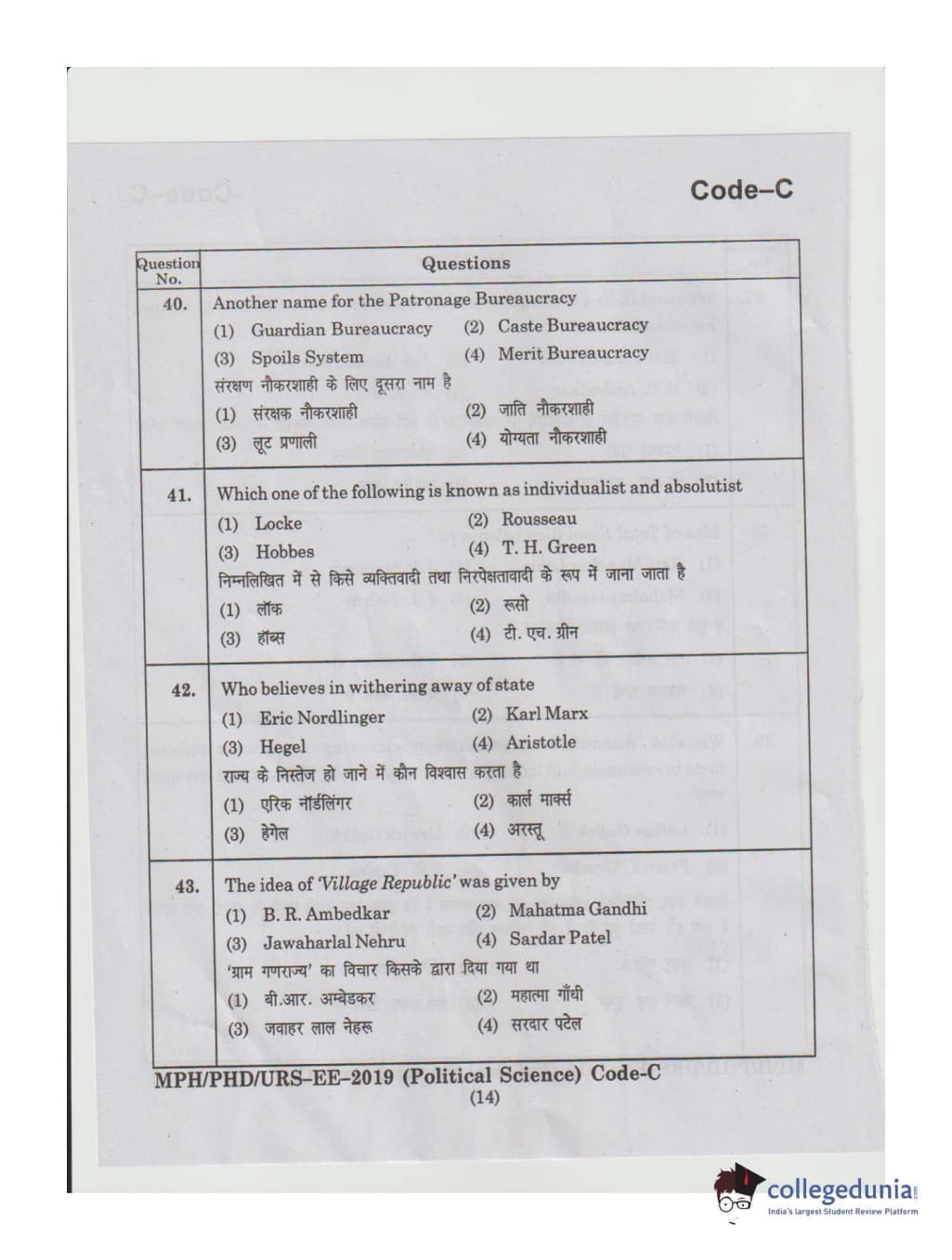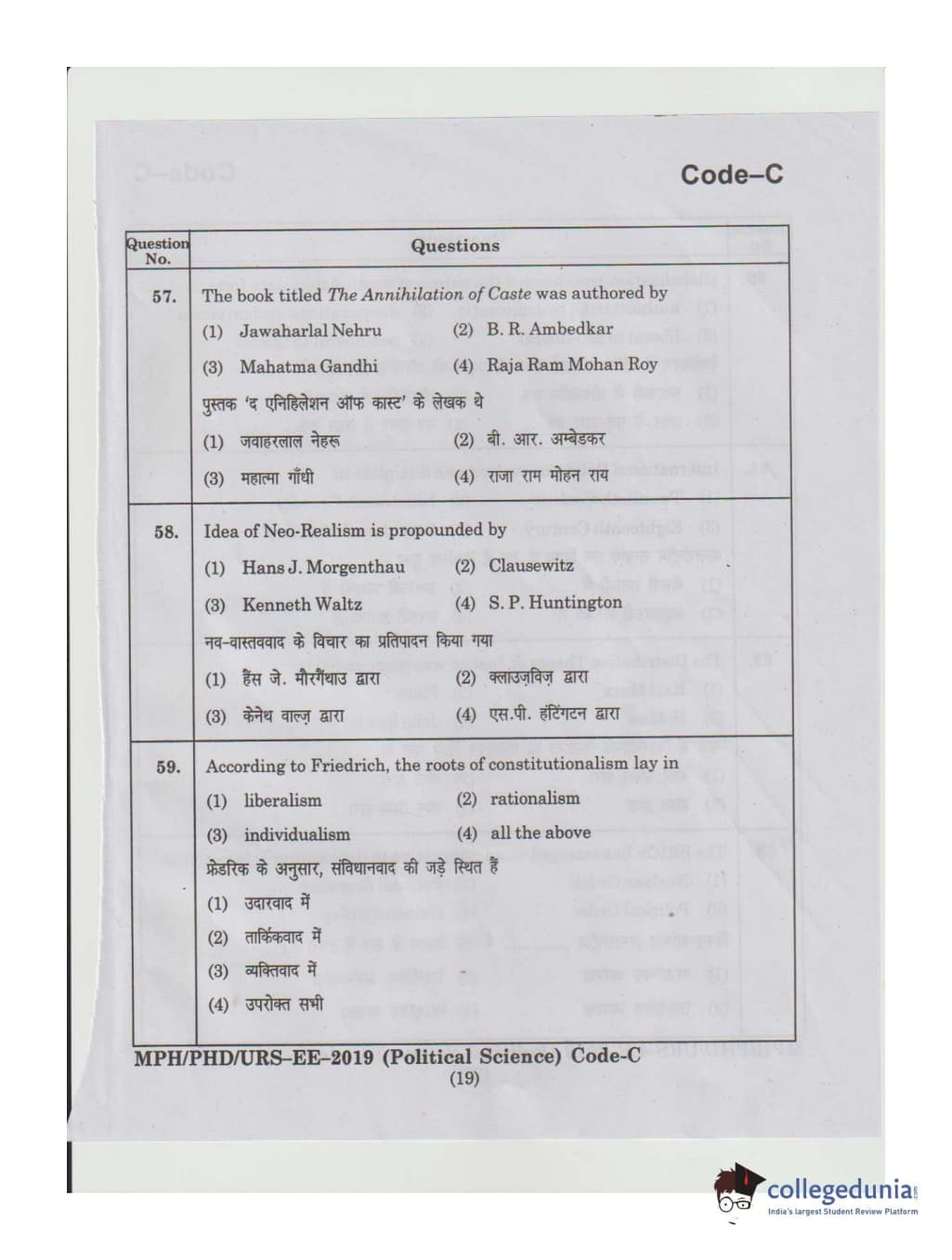 MDUCEE 2019 Ph.D./M.Phil./URS Political Science Set C Question Paper with Answer Key PDFs