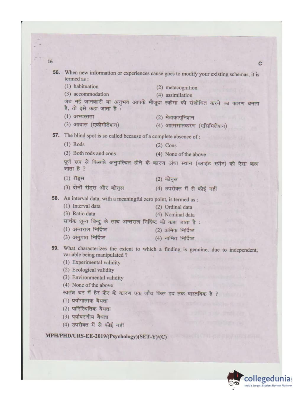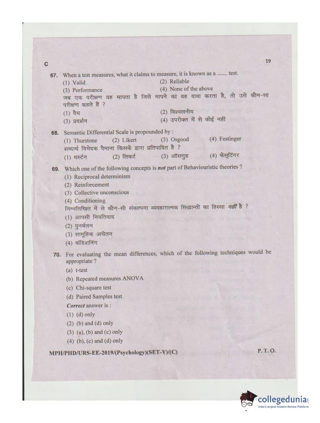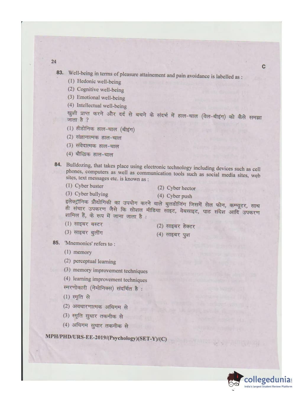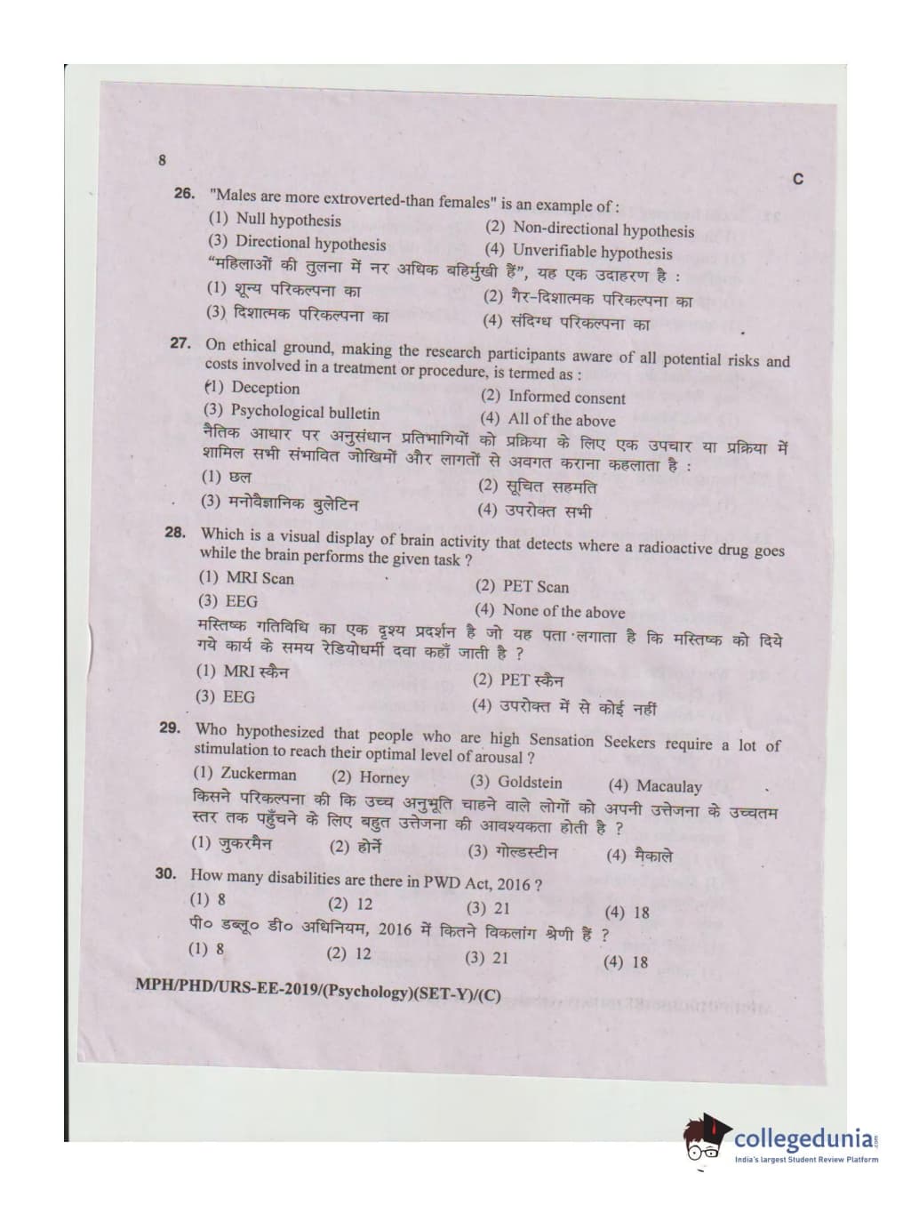 MDUCEE 2019 Ph.D./M.Phil./URS Psychology Set C Question Paper with Answer Key PDFs