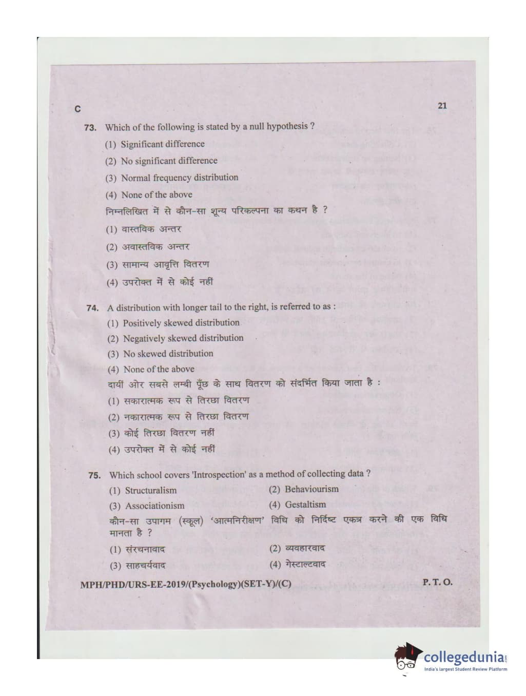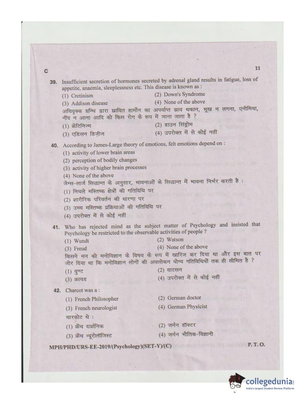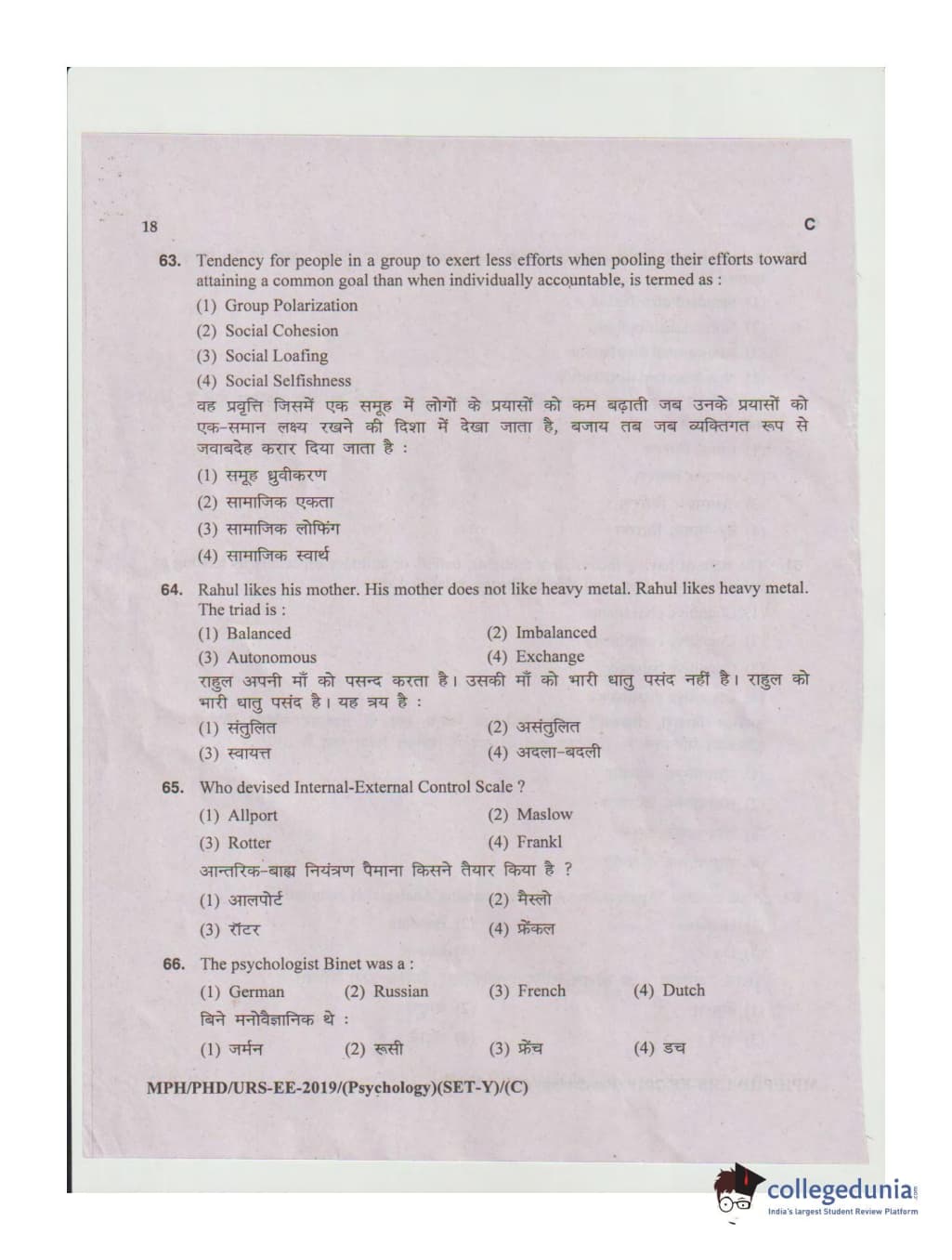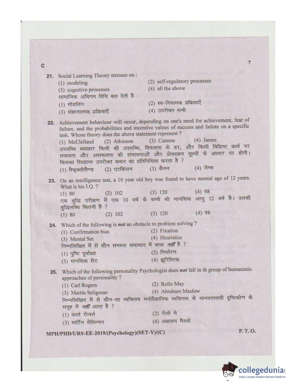 MDUCEE 2019 Ph.D./M.Phil./URS Psychology Set C Question Paper with Answer Key PDFs