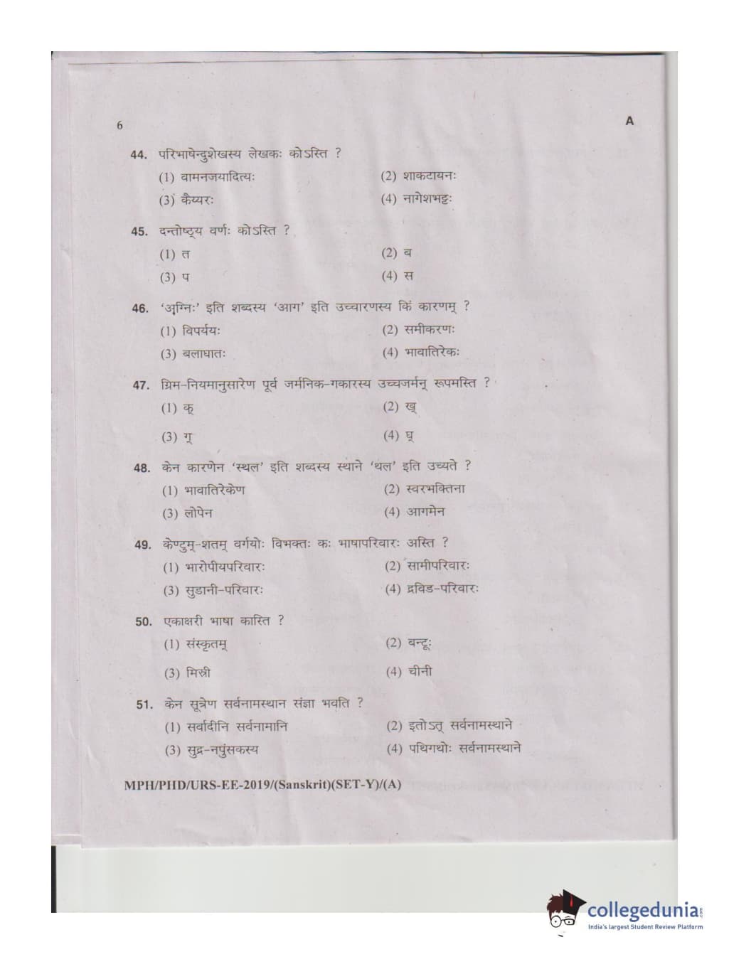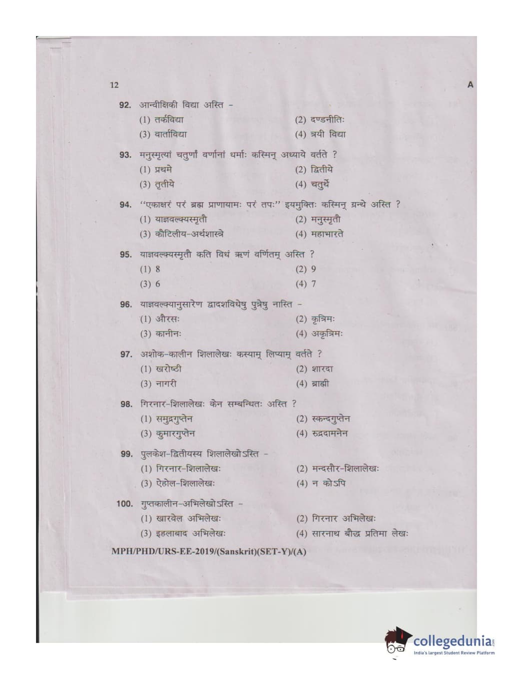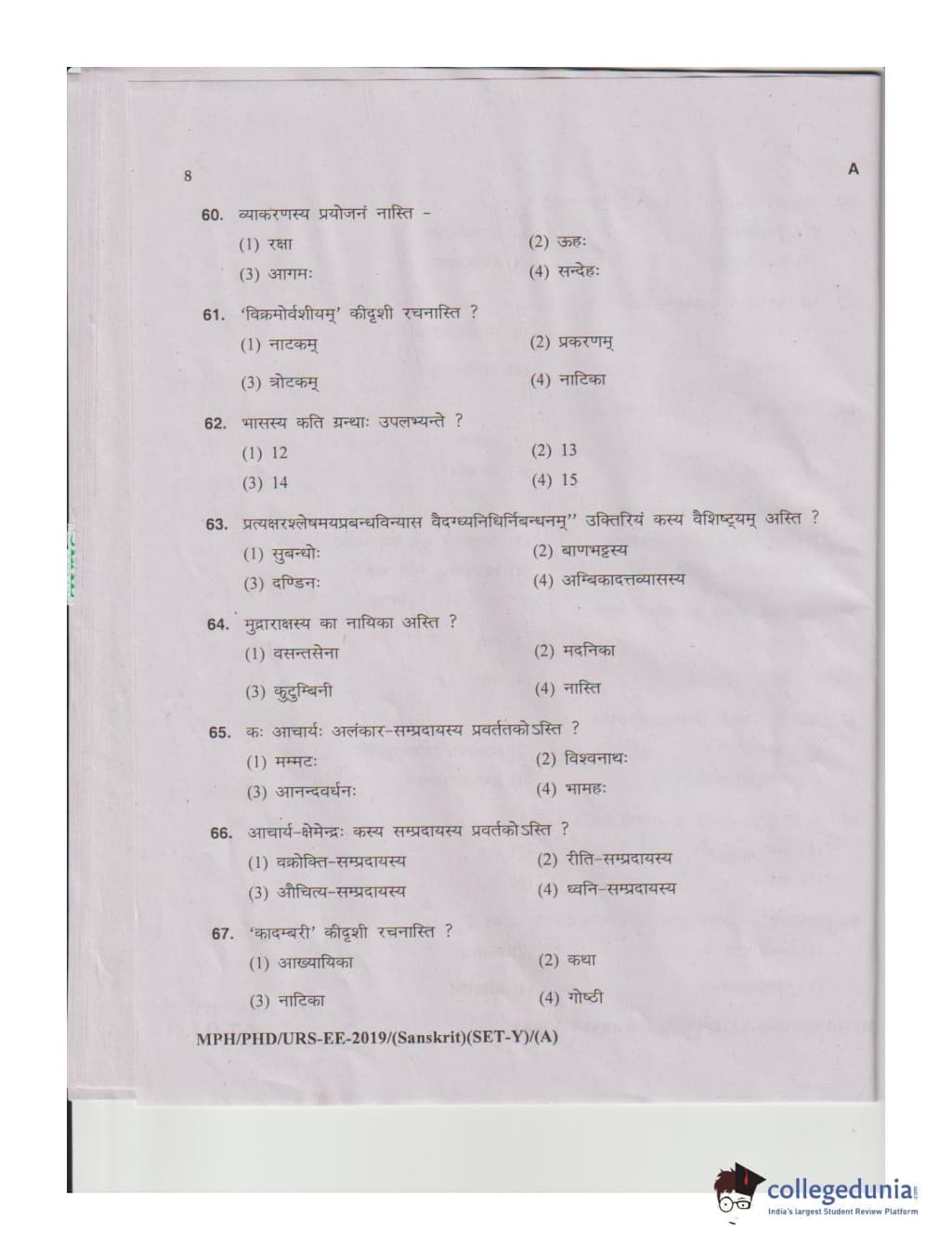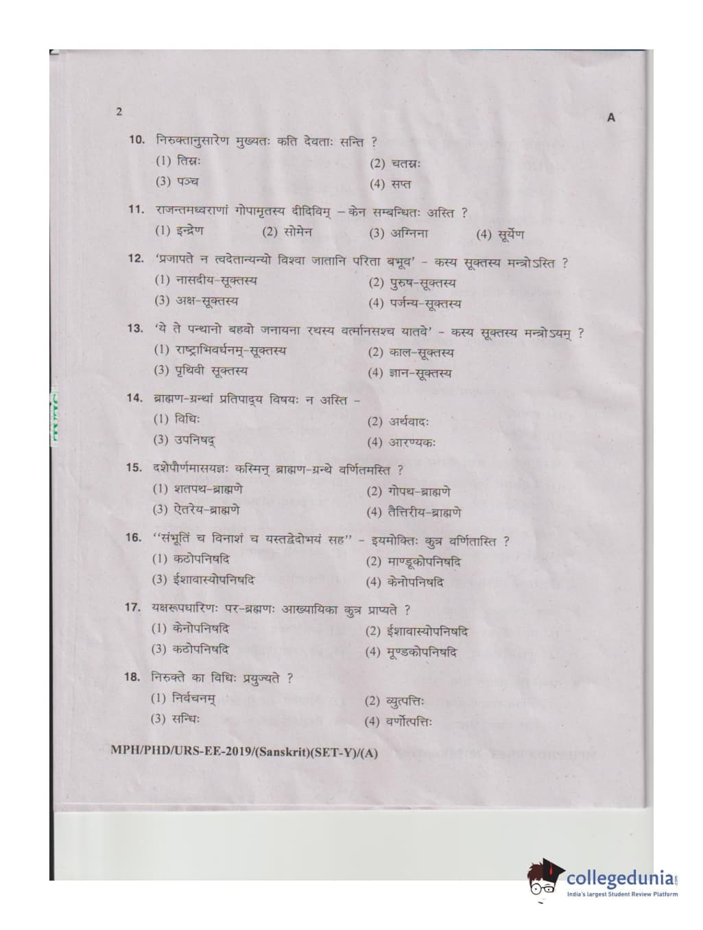 MDUCEE 2019 Ph.D./M.Phil./URS Sanskrit Set A Question Paper with Answer Key PDFs