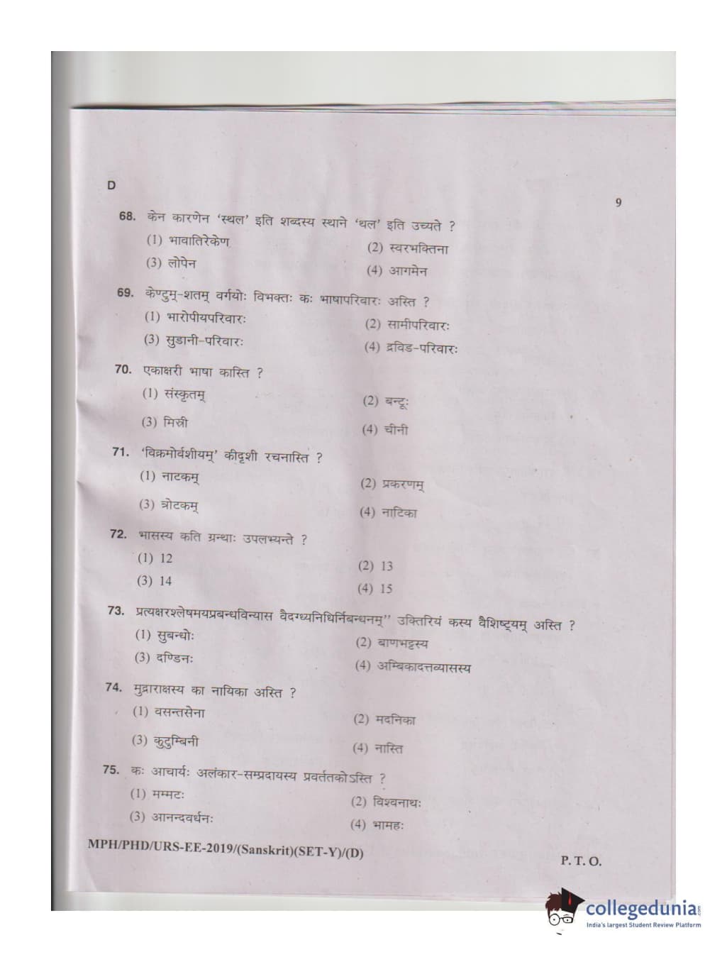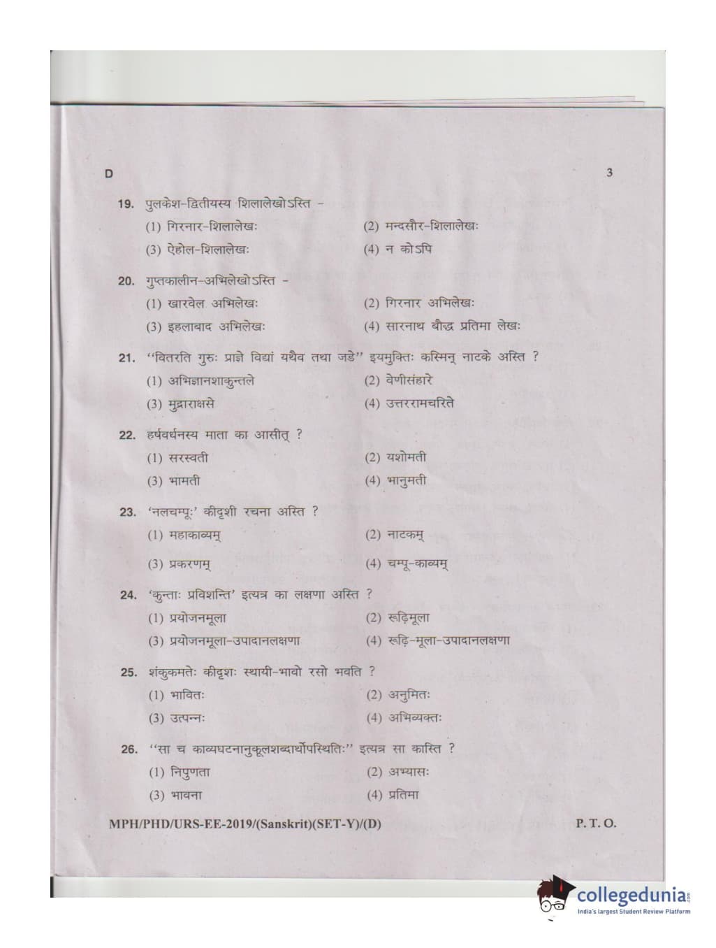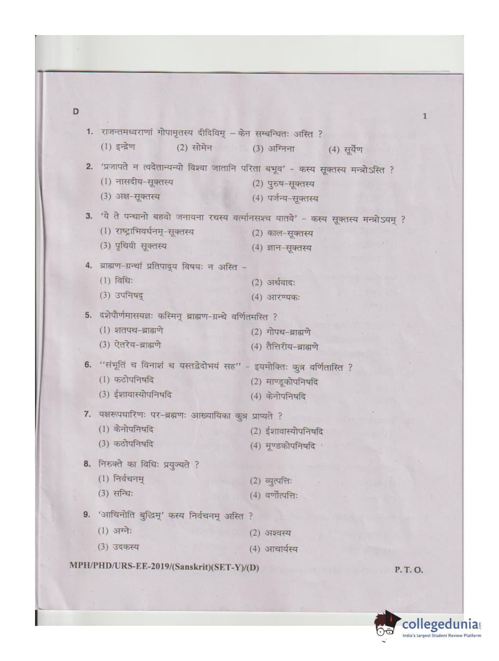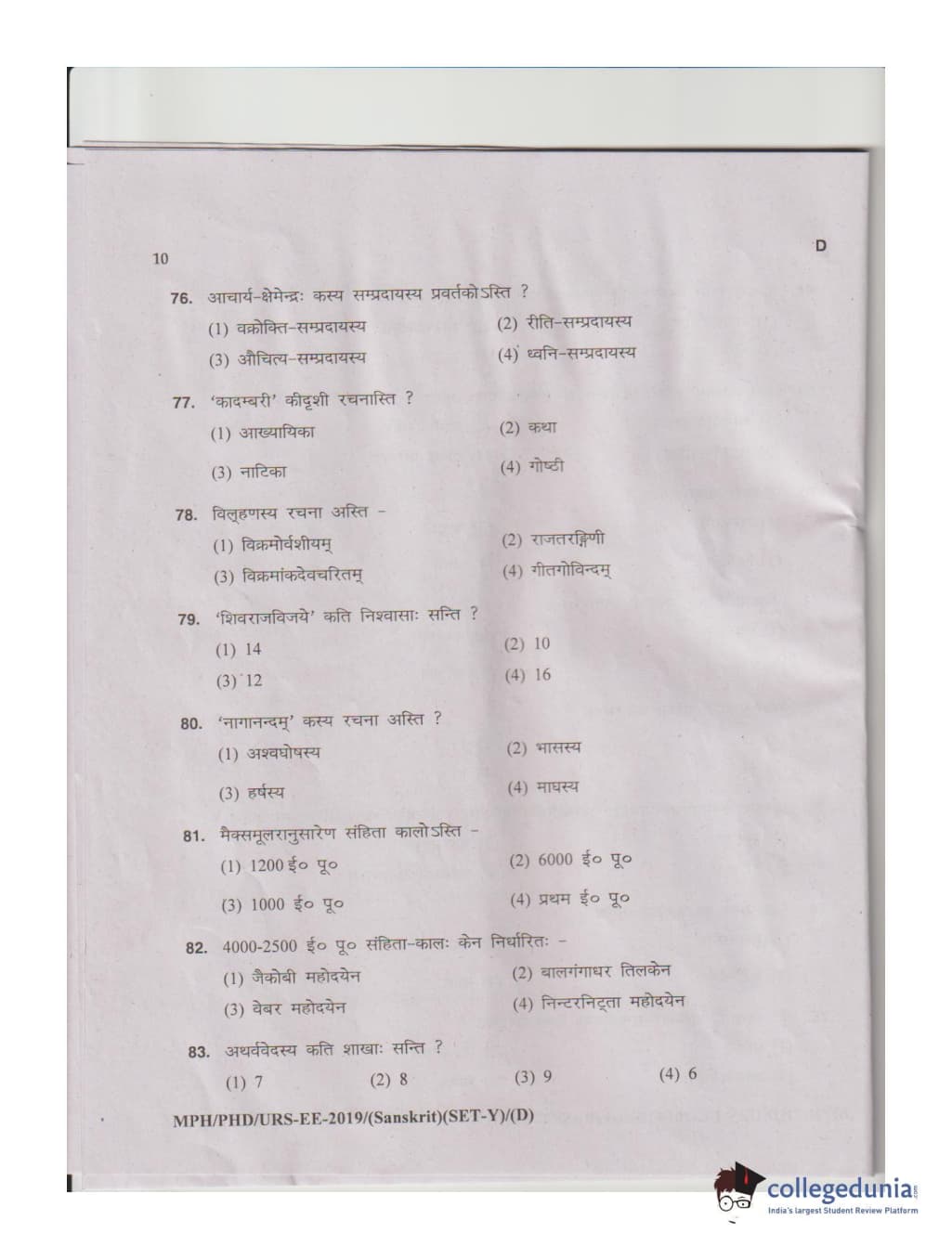 MDUCEE 2019 Ph.D./M.Phil./URS Sanskrit Set D Question Paper with Answer Key PDFs