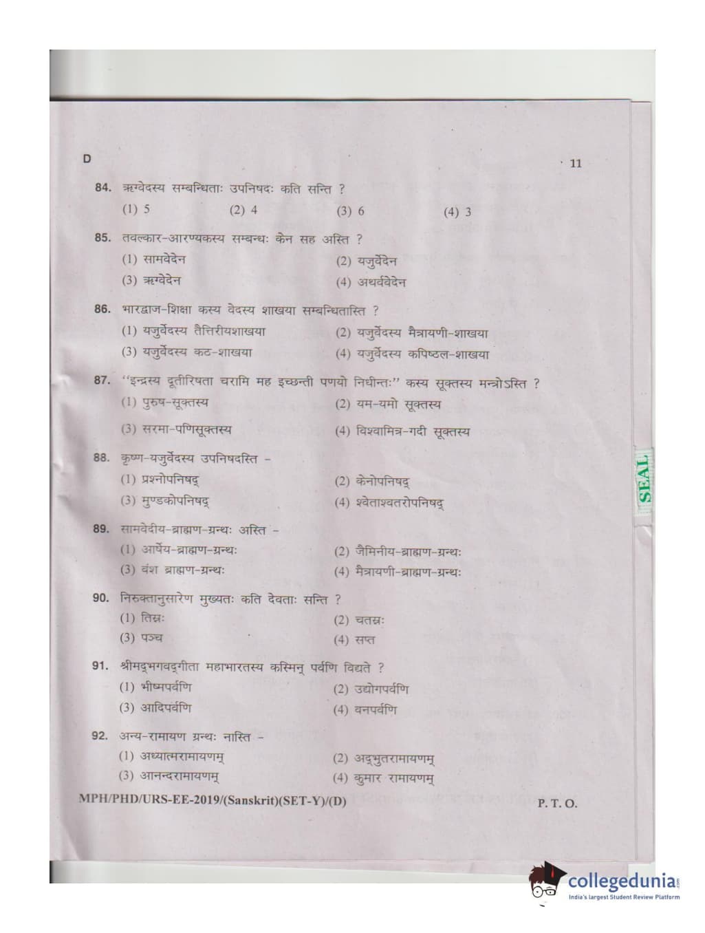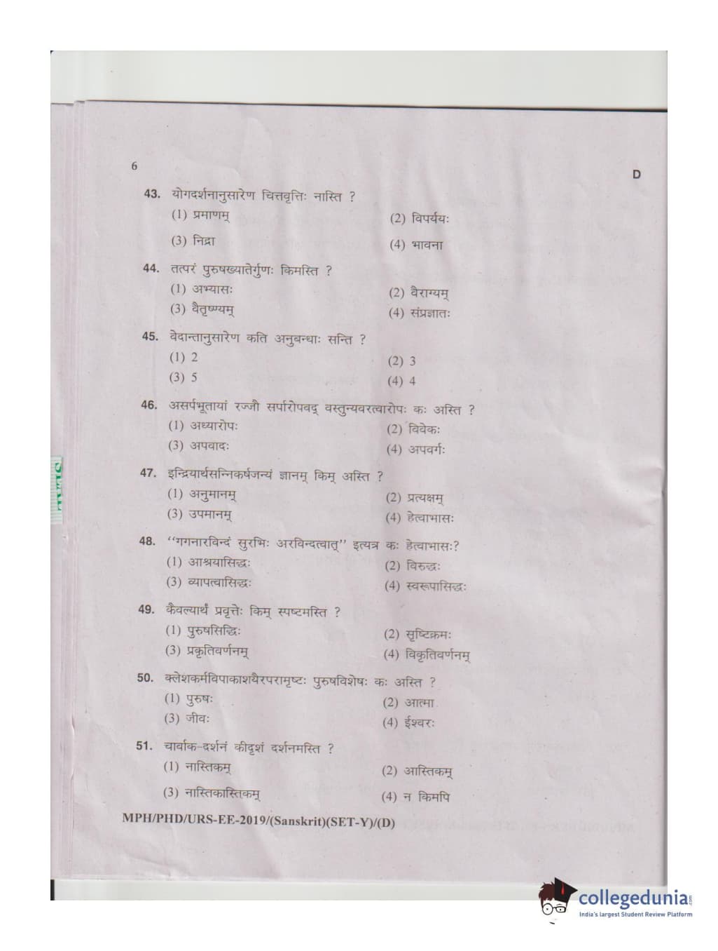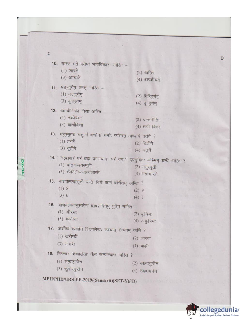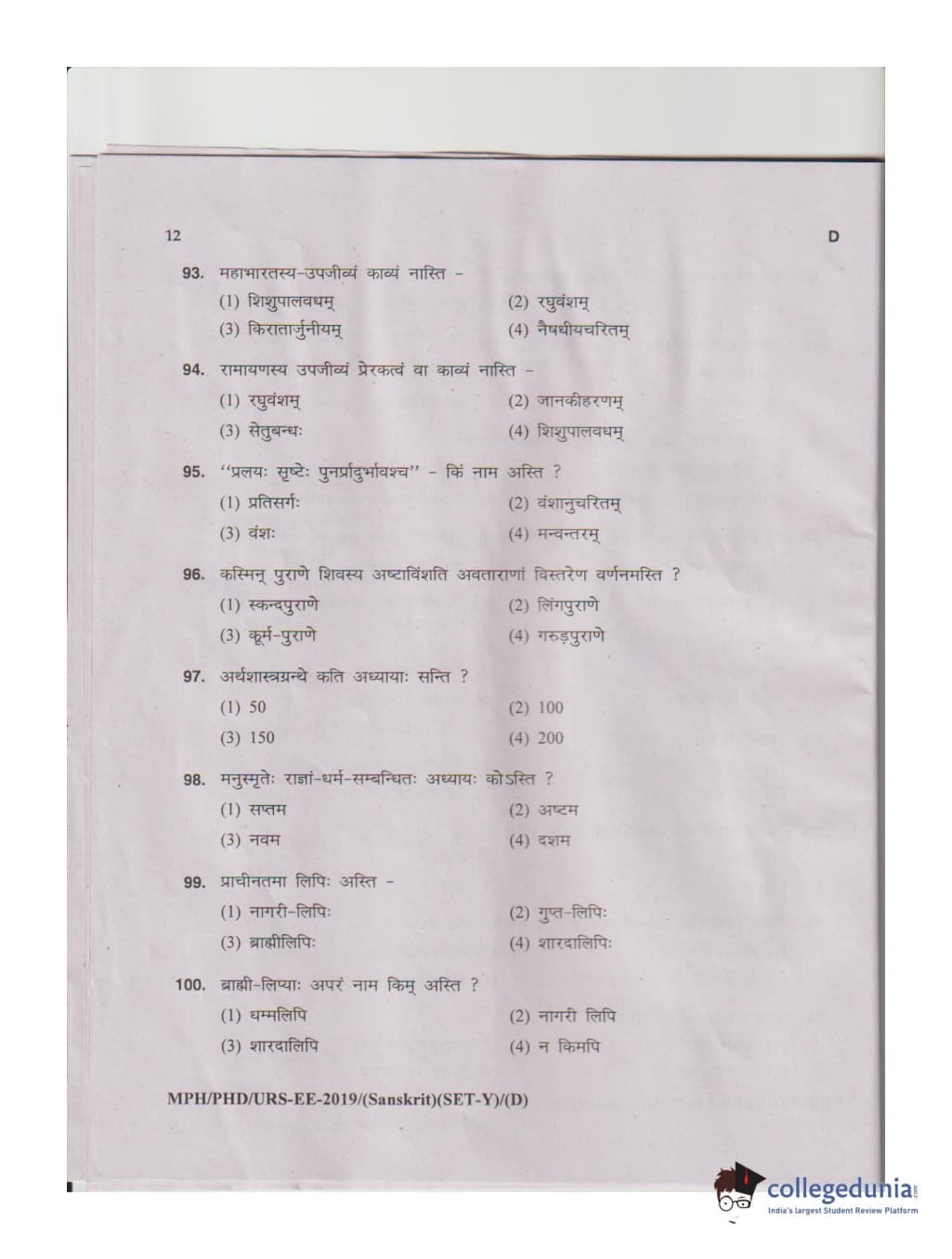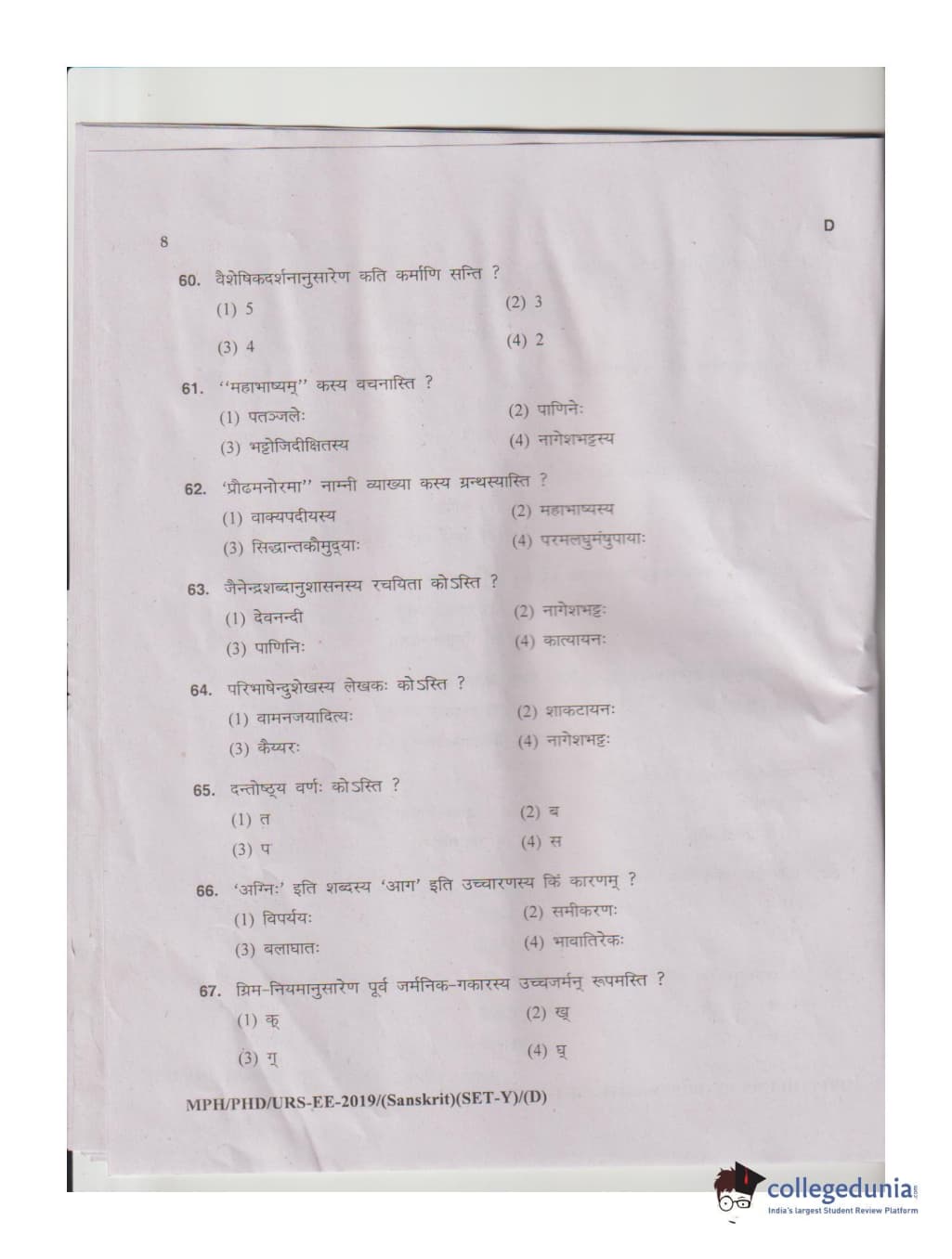 MDUCEE 2019 Ph.D./M.Phil./URS Sanskrit Set D Question Paper with Answer Key PDFs