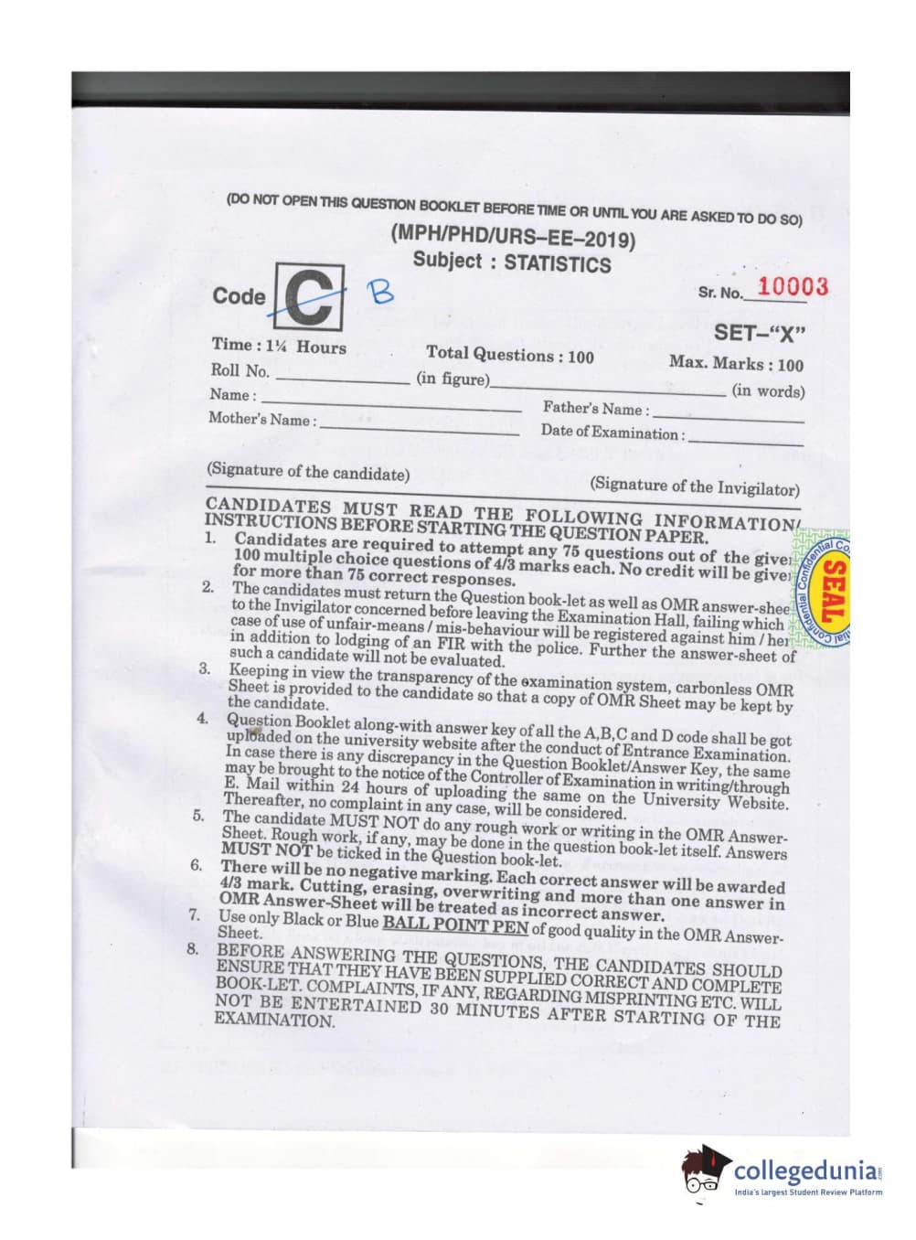 MDUCEE 2019 Ph.D./M.Phil./URS Statistcs Set B Question paper with answer key pdf is available for download. The exam was successfully organized by Maharishi Dayanand University. The question paper comprised a total of 100 questions.